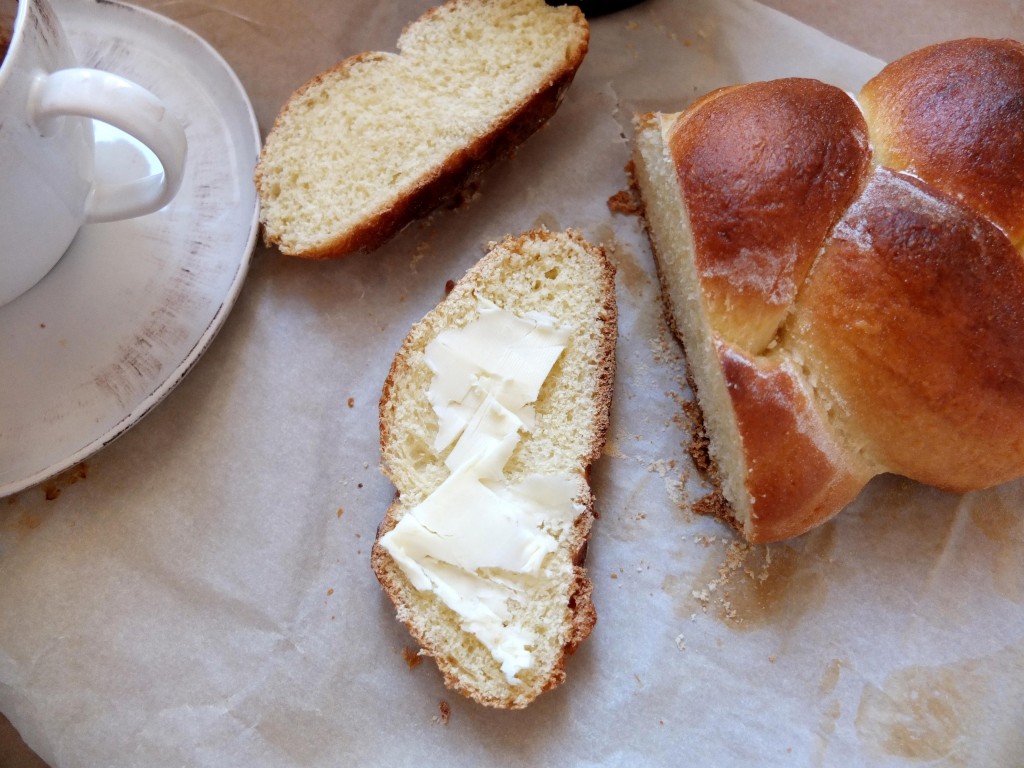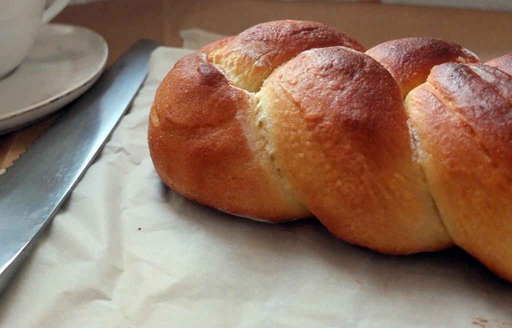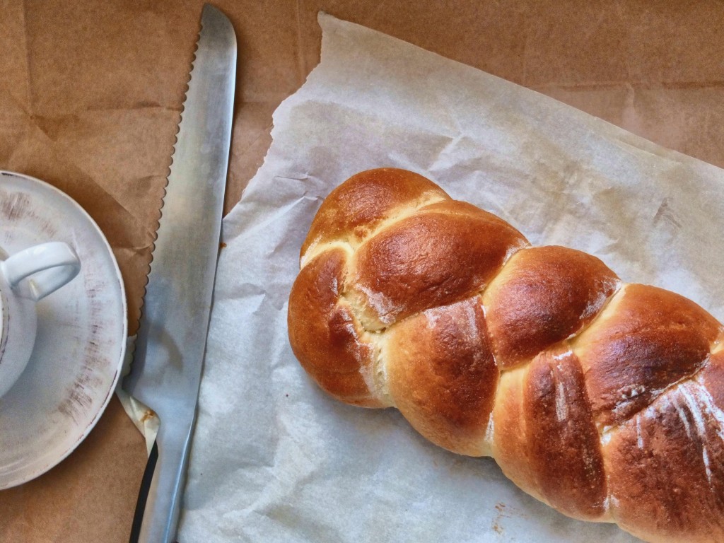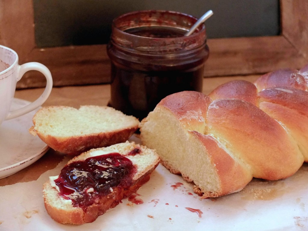 Je ne sais pas vous, mais moi, lorsqu’il fait gris et froid comme aujourd’hui, je n’ai qu’une envie : boire un bon chocolat chaud accompagné de ce pain tressé brioché. Ce matin c’est chose faite ! La recette que je vous propose aujourd’hui est un pain que l’on mange traditionnellement pour les fêtes juives. A mi-chemin entre le pain et la brioche, la « Hallah » a une texture dense et son côté rustique me rappelle le pain que faisait mon grand-père pour les fêtes. Avec une confiture maison, c’est délicieux au petit déjeuner !