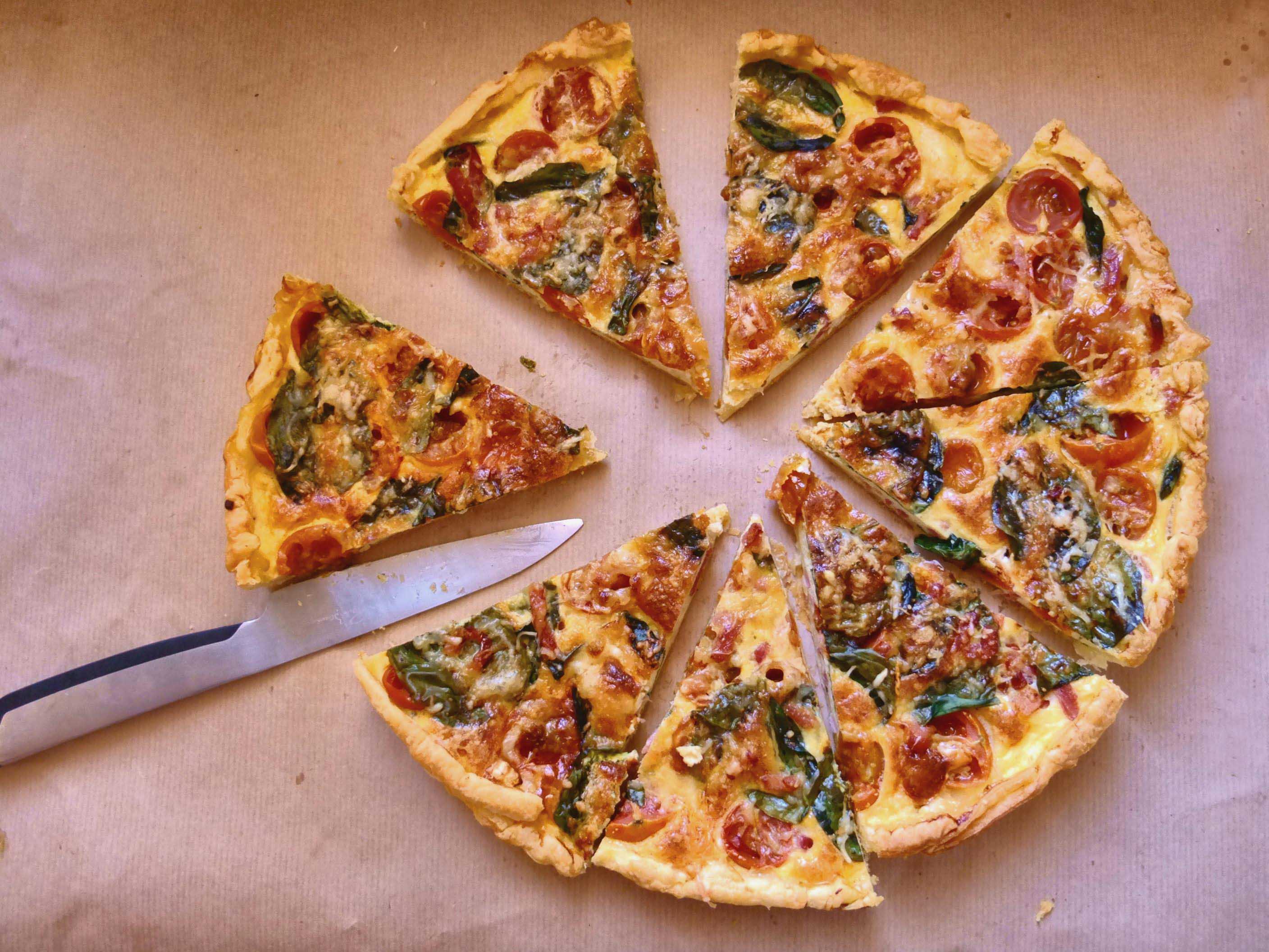 Tarte aux tomates cerises, chèvre, basilic et pousses d’épinards