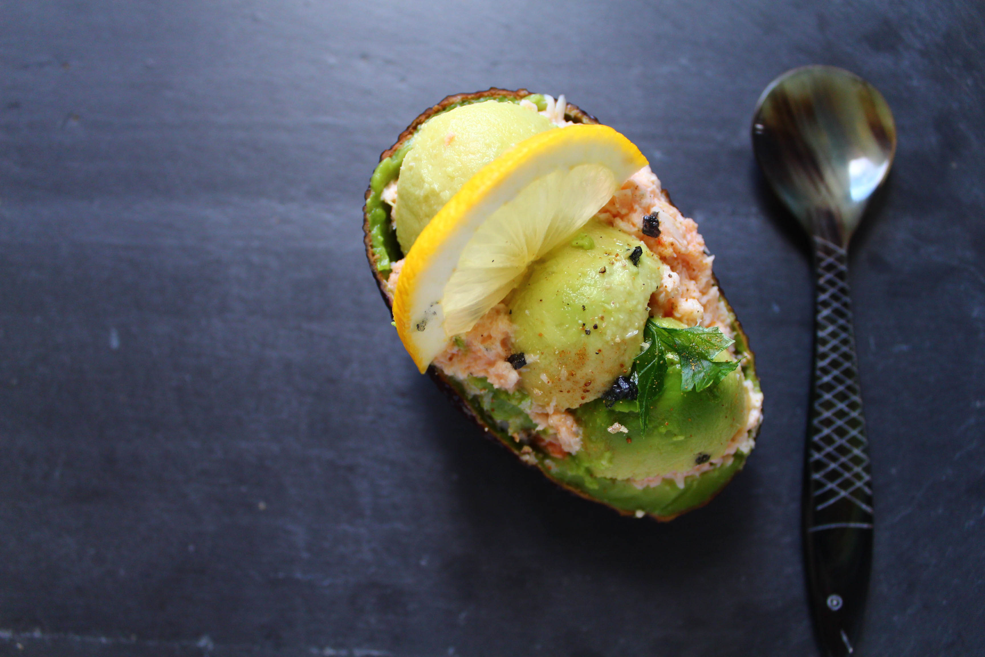 Entrée: avocat au crabe