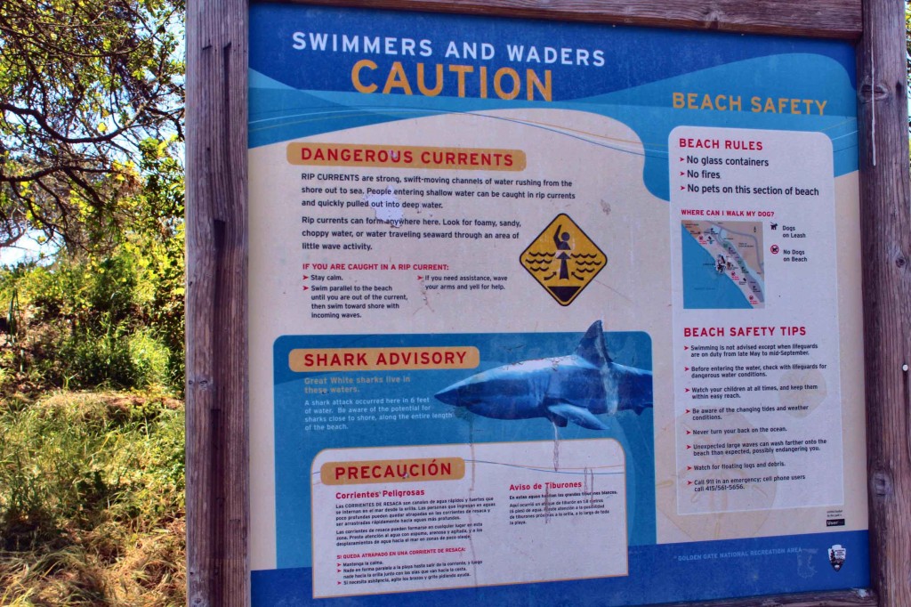 Un peu plus loin, Stinson beach, aussi réputée pour le surf. Une pancarte d’alerte au requi nous dissuadera de nous baigner…