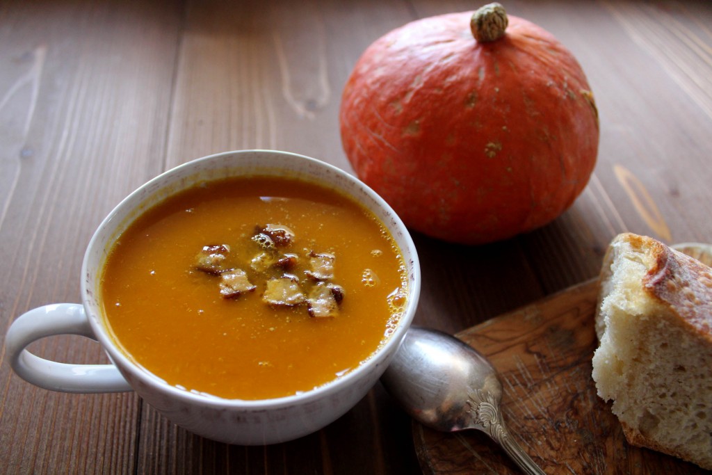 La saison des courges a dejà bien commencé et on n’a pas encore publié de recettes avec cet ingrédient. Le week-end dernier j’ai donc devancé un peu Noël avec cette recette que j’adore faire pendant les fêtes lorsque j’ai des restes de foie gras. Je la fais habituellement avec un bloc de foie gras mais on peut tout à fait la faire aussi avec du foie gras poêlé ! Quel que soit votre choix, ce velouté est délicieux, le petit goût de noisettes du potimarron et le curcuma se marient parfaitement avec le foie gras. Je prépare quelquefois cette soupe avec du potimarron, d’autre fois avec d’autres courges, comme le butternut ou le potiron, sans foie gras et d’autres fois avec, on peut dire que c’est une soupe polyvalente !