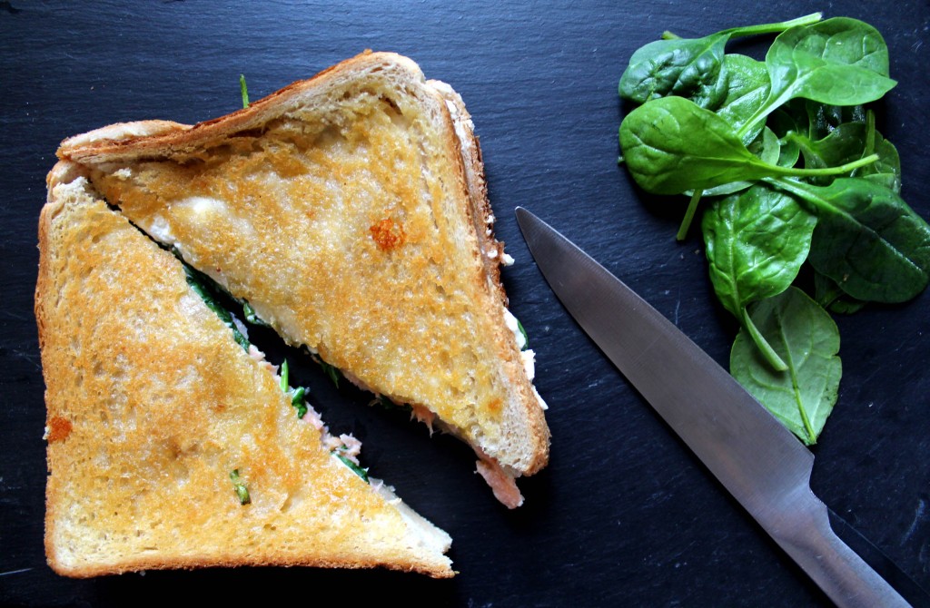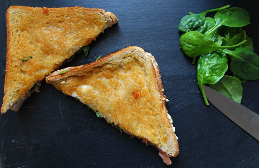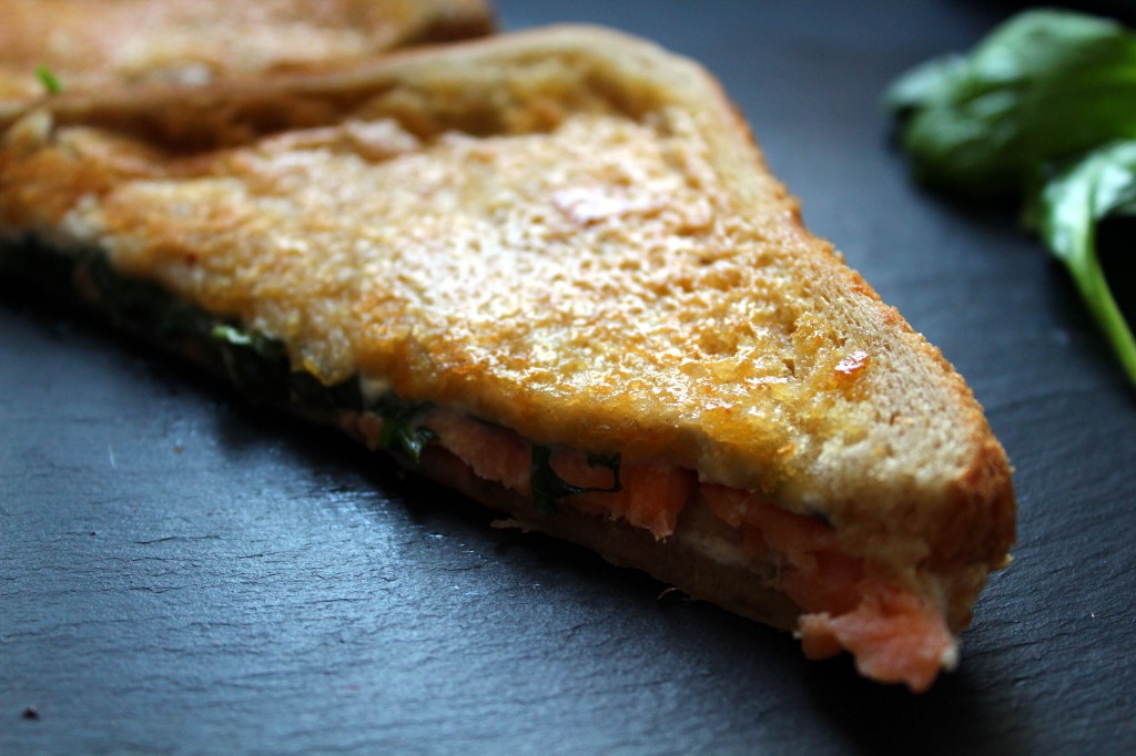 Le croque-monsieur, on ne peut pas dire que cela soit un plat gastronomique ou original à la base, mais au même titre que le sandwich, on peut vraiment arriver à obtenir un super mélange de saveurs en le déclinant avec d’autres ingrédients. Et pour se faire un plateau télé je dois avouer qu’il n’y a rien de mieux. C’est rapide, pratique et très bon ! Pour celui-là je me suis inspirée d’une recette de Philippe Conticcini que j’ai trouvée dans le livre Croquez Monsieur des éditions Marabout. J’avais déjà fait une recette de croque sucré aux fraises et speculoos qui m’avait été inspirée par ce même livre (tout du moins pour l’ajout de speculoos), et je ne sais pas pourquoi mais je suis sûre qu’il m’inspirera encore dans le futur ! Pour ce croque, il suffit d’avoir du saumon fumé, du fromage frais et des pousses d’épinards, et le tour est joué. Le résultat ? Un croque fondant et super savoureux !