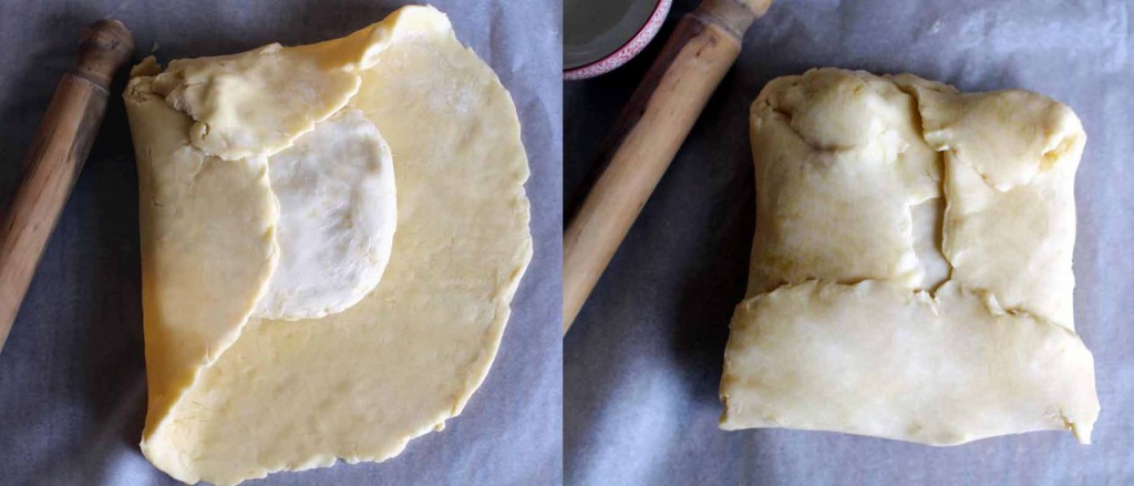 8-Sortez votre rectangle de pâte du réfrigérateur et aplatissez-le en grand rectangle 3 fois plus long que large. Cette fois, rabattez le coté gauche au centre de la pâte, et le côté droit partie par-dessus de manière à former un carré. Comme sur la photo :