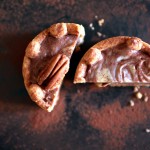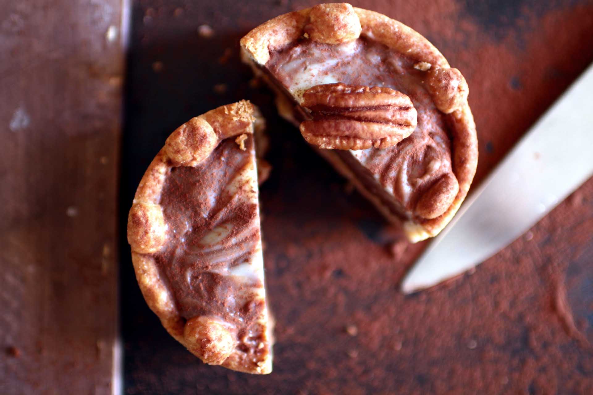tarte marbrée aux chocolat au lait et chocolat blanc, noix de pécan, caramel