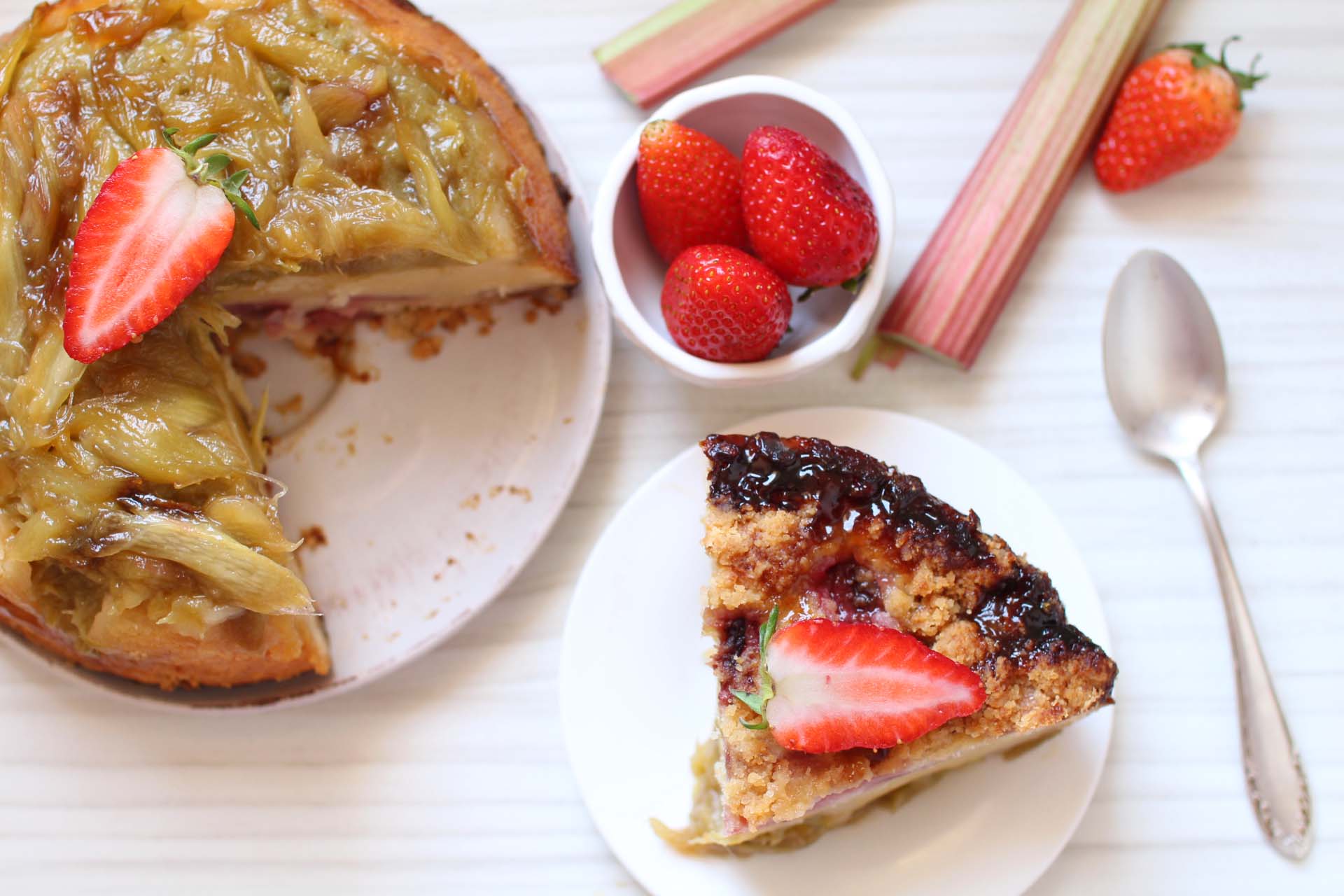 Voilà le genre de gâteau dont je suis fan, et il est directement inspiré d’une recette de Martha Stewart (encore elle) ! Je ne me lasse pas de tester ses recettes qui sont toutes plus délicieuses les unes que les autres (pour d’autres tueries, allez voir sa Key lime Pie et son gâteau aux flocons d’avoine). L’autre jour, alors que je cherchais quoi faire avec ma rhubarbe et que je flânais sur Pinterest, je suis tombée sur son gâteau renversé à la rhubarbe qui m’a tout de suite plu. J’ai eu l’idée de rajouter des fraises dans la croûte, d’augmenter les proportions de crumble et de rhubarbe, et d’en faire un gâteau totalement réversible ! Ce gâteau est donc parfait pour tous ceux qui aiment un peu l’originalité : on peut le présenter aussi bien à l’envers, qu’à l’endroit, et vice versa ! J’ai toujours eu un faible pour tout ce qui est réversible : changer de look en un rien de temps, pourquoi on ne pourrait pas faire la même chose avec nos gâteaux après tout ?! En tant qu’éternelle indécise, je n’ai pas pu choisir quel côté me plaisait le plus, mais il faut avouer que la croûte en dessous est un peu plus facile à manger à la main. Faites votre choix !