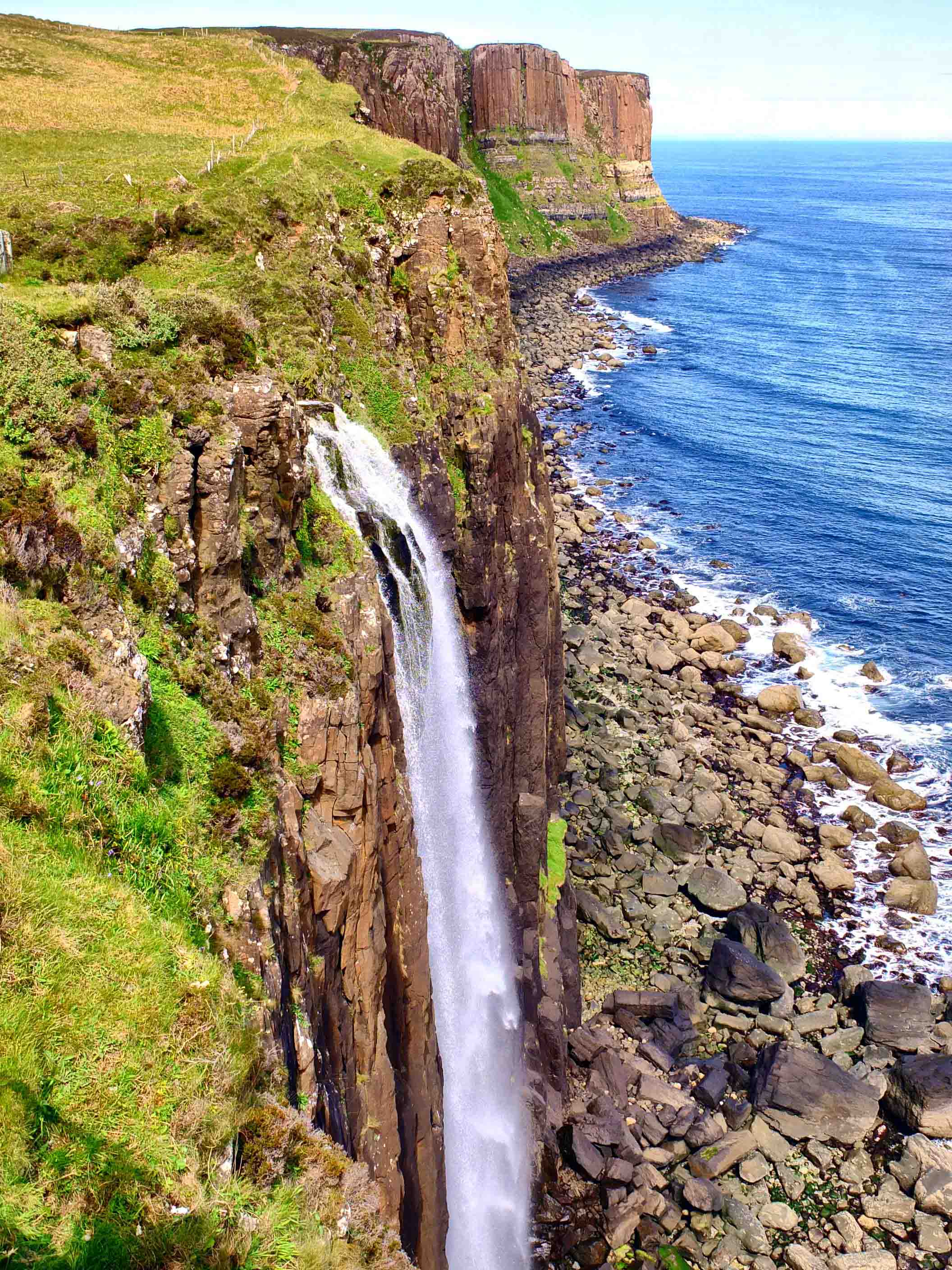 Un peu plus loin, la vue splendide, des falaises s’élèvent devant nos yeux et des cascades se jettent dans la mer à Kilt of Rock.