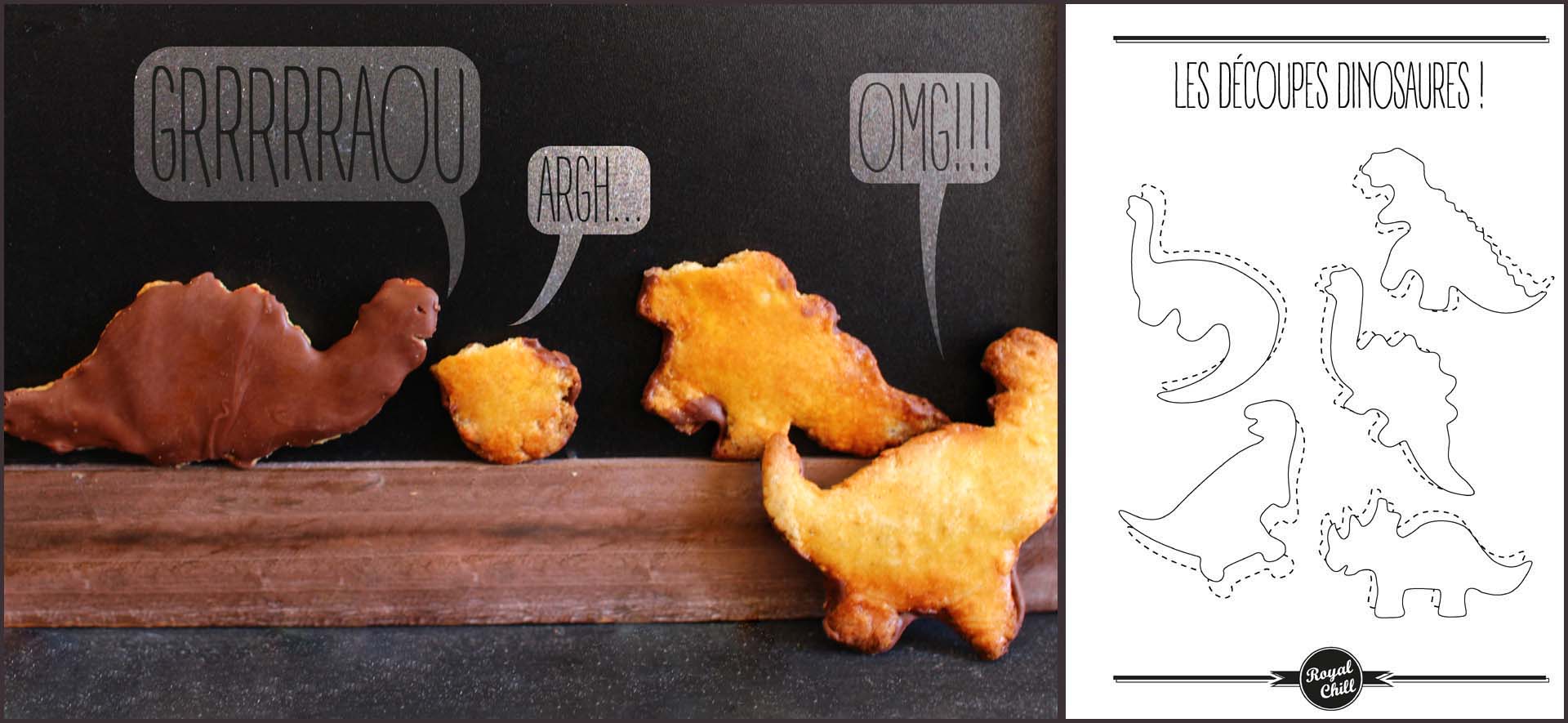 Quelques dinos découpés sur du papier cartonné, et une fournée plus tard, j’avais enfin mes Dinosaurus®, tout beaux, tout dorés et tout chocolatés ! Ayant eu tant de mal à trouver des moules, je me suis dit que je ne devais sûrement pas être la seule… alors avec l’aide de Chloé, on vous a confectionné des moules rien que pour vous : on vous présente les Découpes Dinosaures Royal Chill ! Chloé vous a créé un joli fichier depuis l’Australie, où elle a enfin accès à Internet ! On espère donc que vous serez aussi enthousiastes que nous pour les tester. Bon ça ne vaut pas de vrais moules, mais vous en aurez toujours sous la main, vous n’aurez pas à les laver et pas à leur trouver une place dans le placard (et ça c’est plutôt une bonne nouvelle) !