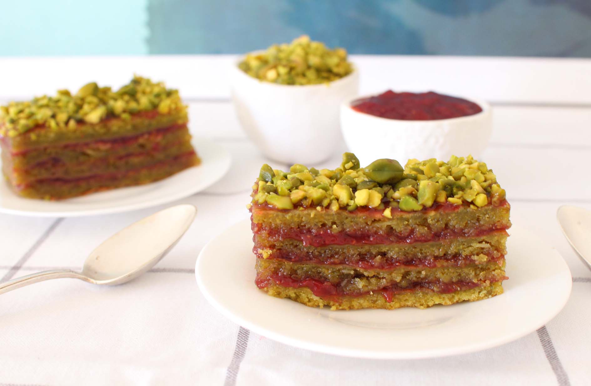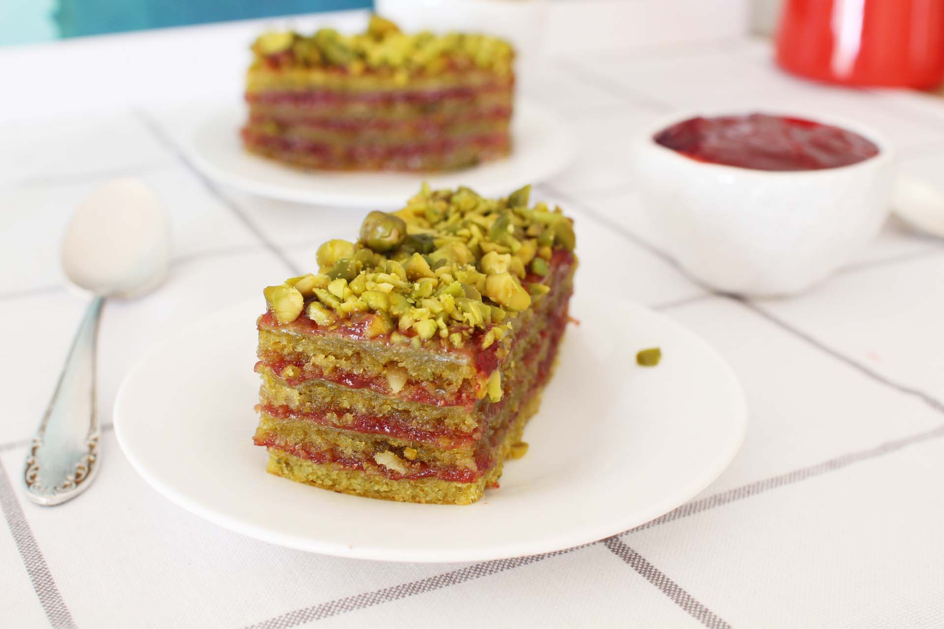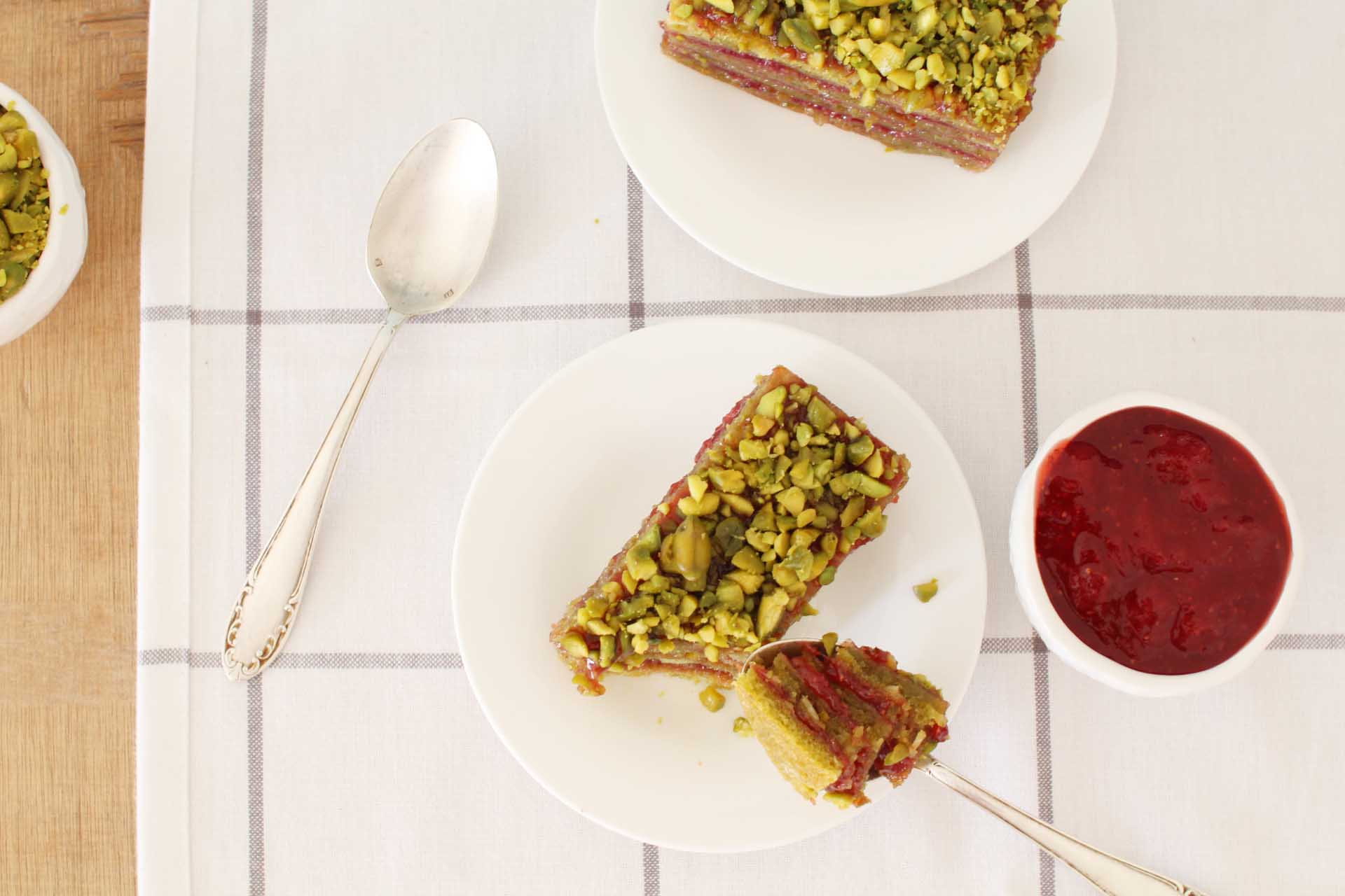 Tartinez le dessus de chaque cake avec de la confiture de fraises-groseilles que vous aurez mis de côté à l’avance (ou autre confiture) et collez les éclats de pistaches par dessus.