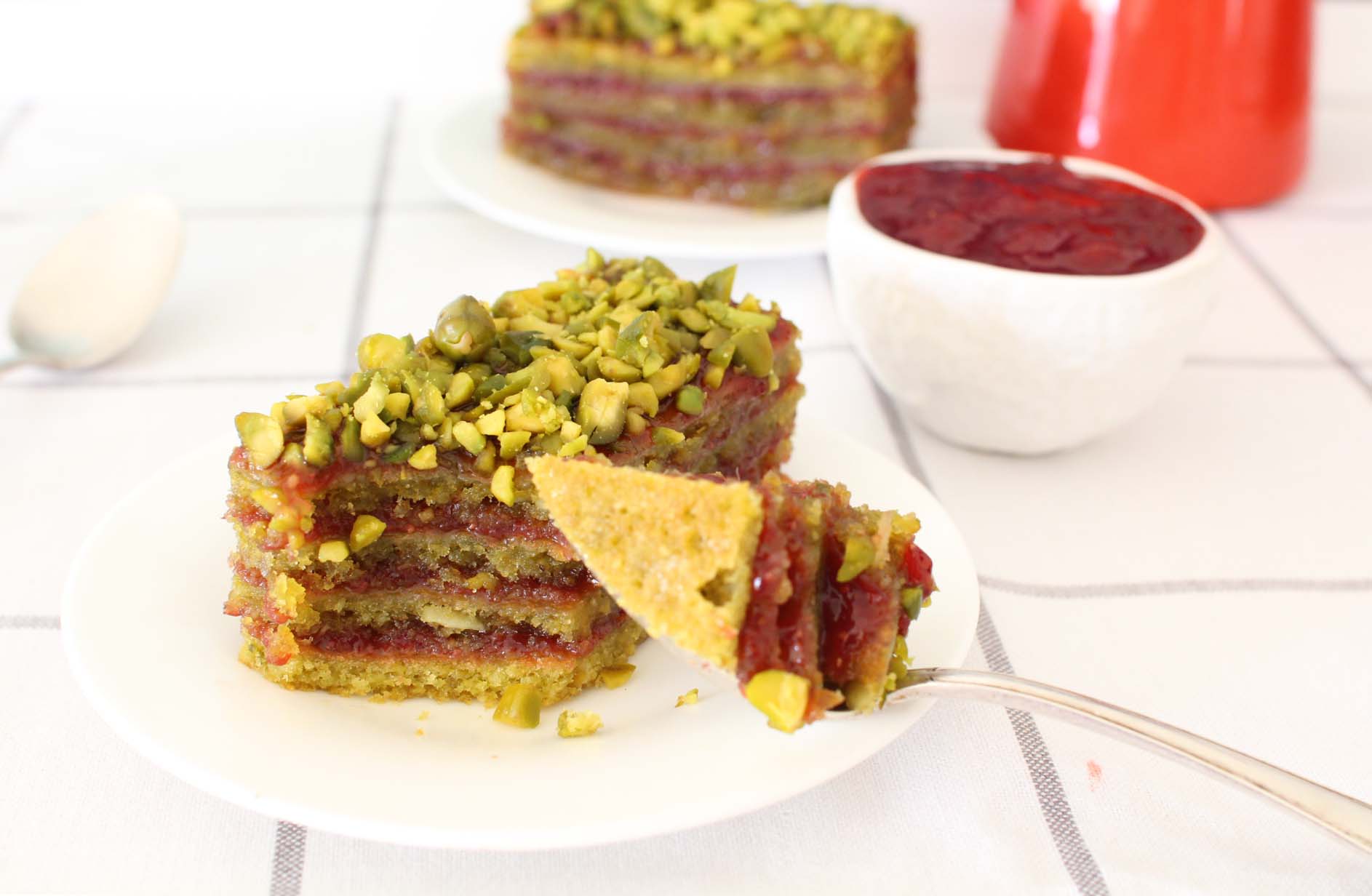 Une recette de cake aux pistaches de Jérôme Chaucesse aux fraises et groseilles sans gluten