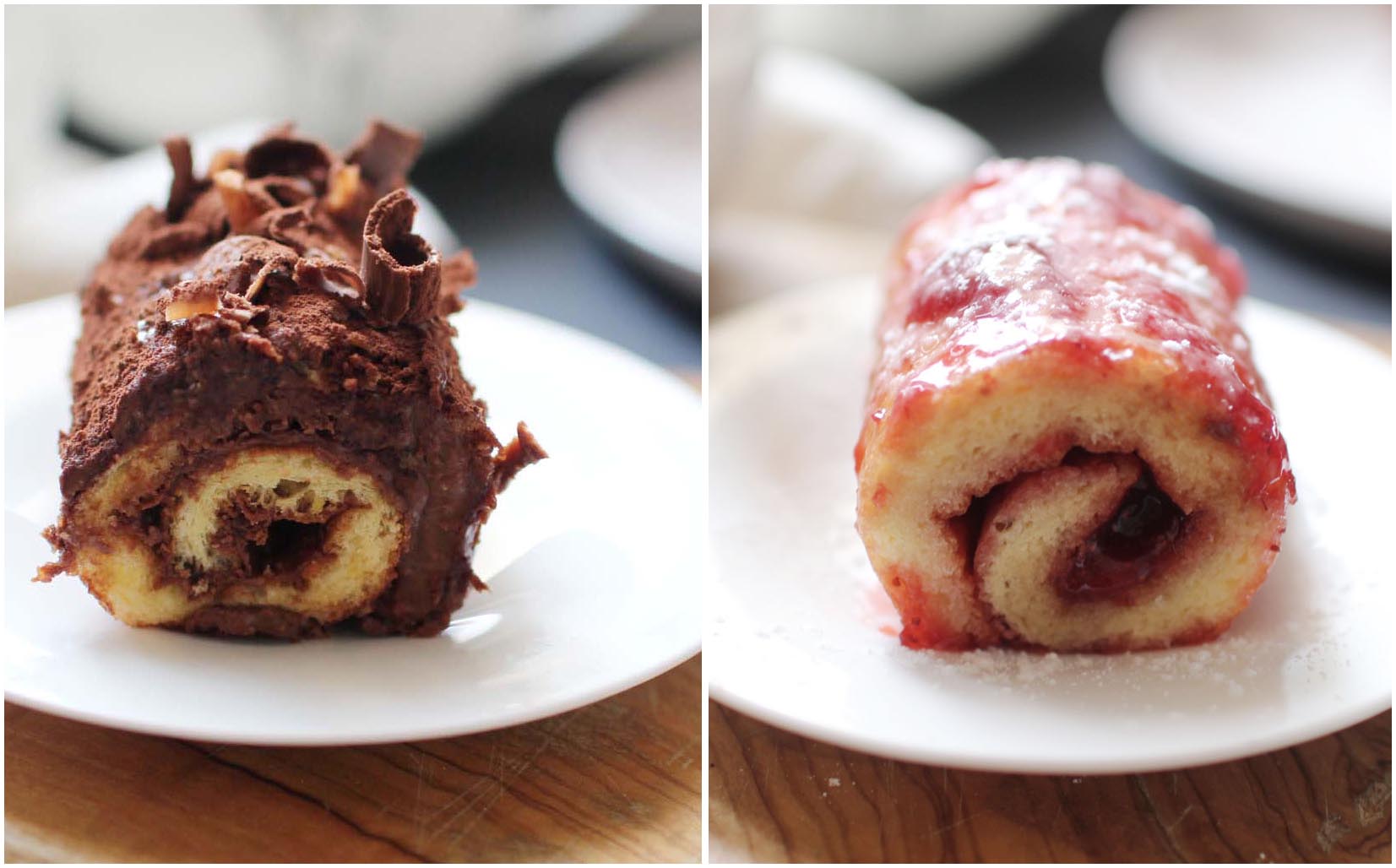 Je sais pas vous mais moi je trouve que les roulés ont un petit quelque chose de retour en enfance, un côté régressif qui m’a toujours plu. Quand j’étais petite, au goûter, je mangeais toujours des petits roulés à la framboise et j’adorais ça. Ceux-là même qu’on trouvait dans le commerce et que les filles de La Super Supérette ont repris avec leur version maison l’année dernière ! Ce week-end j’avais donc mon gros pot de pâte à tartiner maison façon Nutella sur les bras (ok un petit pot parce qu’en fait j’ai presque tout mangé à la cuillère…), et aussi un pot de confiture de fraises que j’avais préparé cet été. Je n’avais pas envie de quelque chose de compliqué, juste de croquer dans un gâteau bien régressif. C’est comme ça que sont nés ces deux roulés, je n’arrivais pas à me décider entre les deux garniture, alors bien entendu j’ai fait les deux…