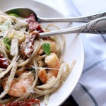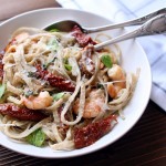 Une recette de pâtes : linguine aux crevettes, crème et tomates séchées adaptée du livre Quand Katie Cuisine