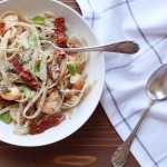 Une recette de pâtes : linguine aux crevettes, crème et tomates séchées adaptée du livre Quand Katie Cuisine