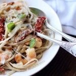 Une recette de pâtes : linguine aux crevettes, crème et tomates séchées adaptée du livre Quand Katie Cuisine
