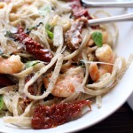 Une recette de pâtes : linguine aux crevettes, crème et tomates séchées adaptée du livre Quand Katie Cuisine