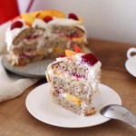 Une recette de layer cake de trish deseine, gâteau aux noisettes, crème mascarpone banane, nectarine framboises et fraises