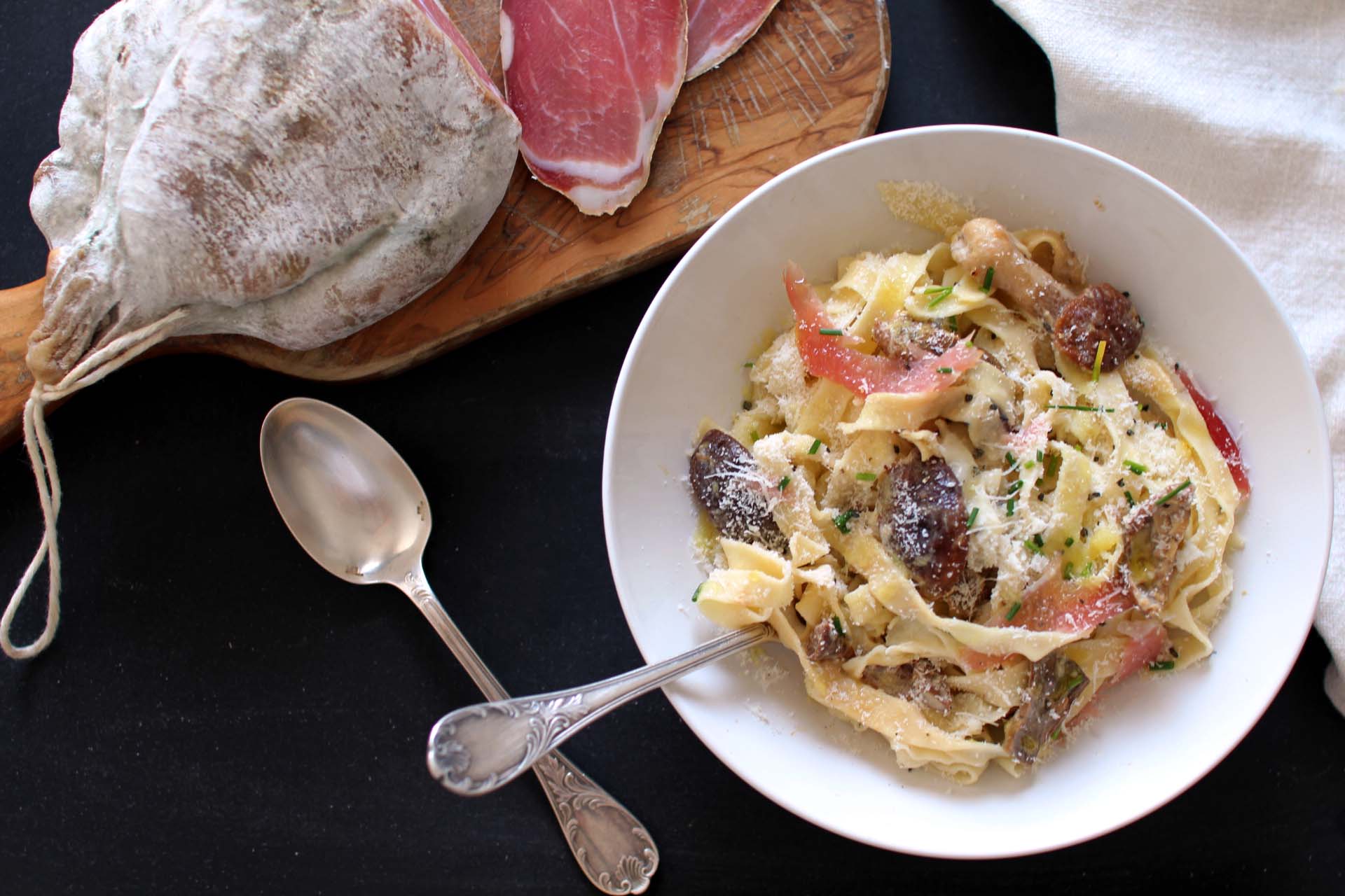 Et voilà l’automne est malheureusement arrivé… fini la plage, les glaces, les tongs et les shorts… Personnellement je ne suis pas encore passée à l’automne et je continue comme chaque année de faire durer l’été. Mais bon pour ceux qui n’ont pas la chance d’habiter à côté de la mer j’ai eu envie de préparer un plat bien réconfortant avec des cèpes et des pâtes fraîches maison. Tout ce que je peux vous dire c’est que c’était un délice. Ce plat contient tous les ingrédients que j’aime : de la crème, des cèpes, du fromage et du jambon de Bayonne. La sauce était vraiment goûteuse et extrêmement simple à faire. Vous pouvez bien sûr préparer ce plat avec des pâtes fraîches achetées dans le commerce si vous n’avez pas le temps de les préparer vous-même.