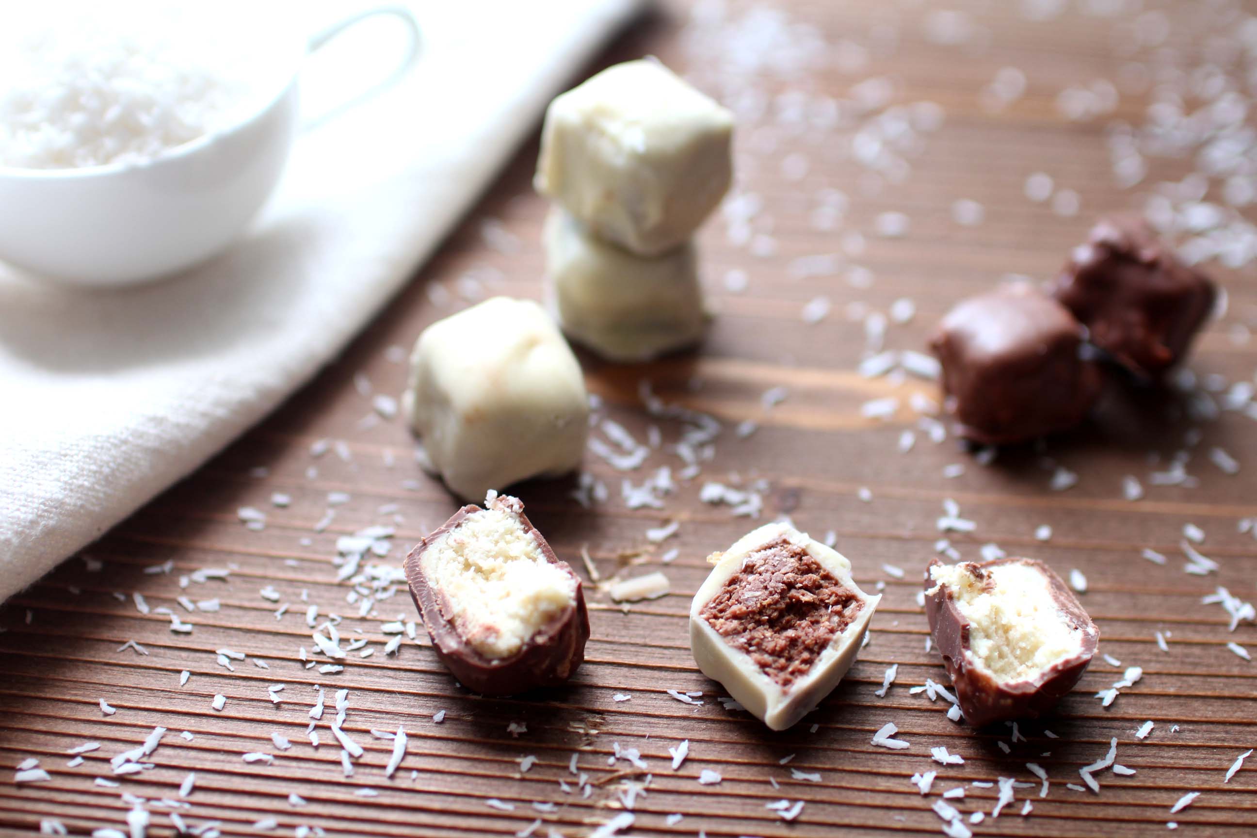 Recette de chocolats maison fourrés au chocolat blanc et à la purée de coco