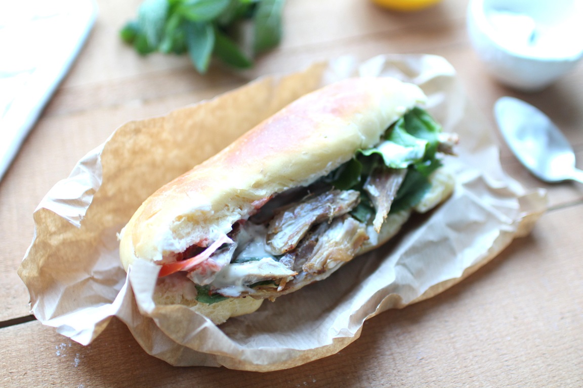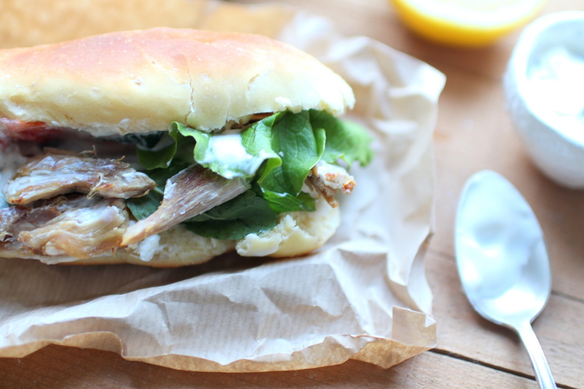 Attention, contrairement aux apparences, ceci est un kébab ! A une différence près, c’est que j’ai troqué la traditionnelle pita contre un bon bun brioché maison qu’il me restait d’une fournée de pains à hot dogs. J’adore les kebab mais j’avoue être souvent déçue lorsque j’en achète, et pour tout vous dire, c’est plutôt rare parce que le simple fait de voir un snack dont l’hygiène me paraît douteuse suffit à me dissuader d’en manger… bref ça doit bien faire 5 ans que je me passe de kebab alors que j’adore ça. Alors bon à force on se dit qu’on aura plus vite fait de les faire soi-même ces kebabs… J’ai donc profité d’une fournée de buns et d’un reste de gigot d’agneau (la meilleure pièce pour faire un kebab) pour en préparer. C’est si simple à réaliser que je me demande pourquoi je ne l’ai pas fait plus tôt. En Turquie, il existe une multitude de recettes différentes, chaque région ayant une manière particulière de le préparer. Généralement il faut préparer une marinade avant de faire cuire la viande, mais la recette que je propose ici est légèrement différente et tout aussi bonne : quelques feuilles de laitue, un peu de tomate, une sauce blanche, des herbes, de l’agneau et c’est tout ! Le résultat est un vrai délice. La qualité de la viande utilisée fera vraiment la différence, il faut vraiment choisir une partie proche de l’os, comme l’épaule ou le gigot. Le meilleur moyen est de partir d’un reste de gigot d’agneau. Vous pouvez remplacer le bun par le pain qu’il vous plaira. Pour ma part, j’ai choisi le bun parce que c’est un pain à sandwich que j’adore mais il a l’inconvénient de ne pas pouvoir contenir beaucoup de garniture, n’hésitez donc pas à remplacer par une baguette ou un pain pita si vous préférez.
