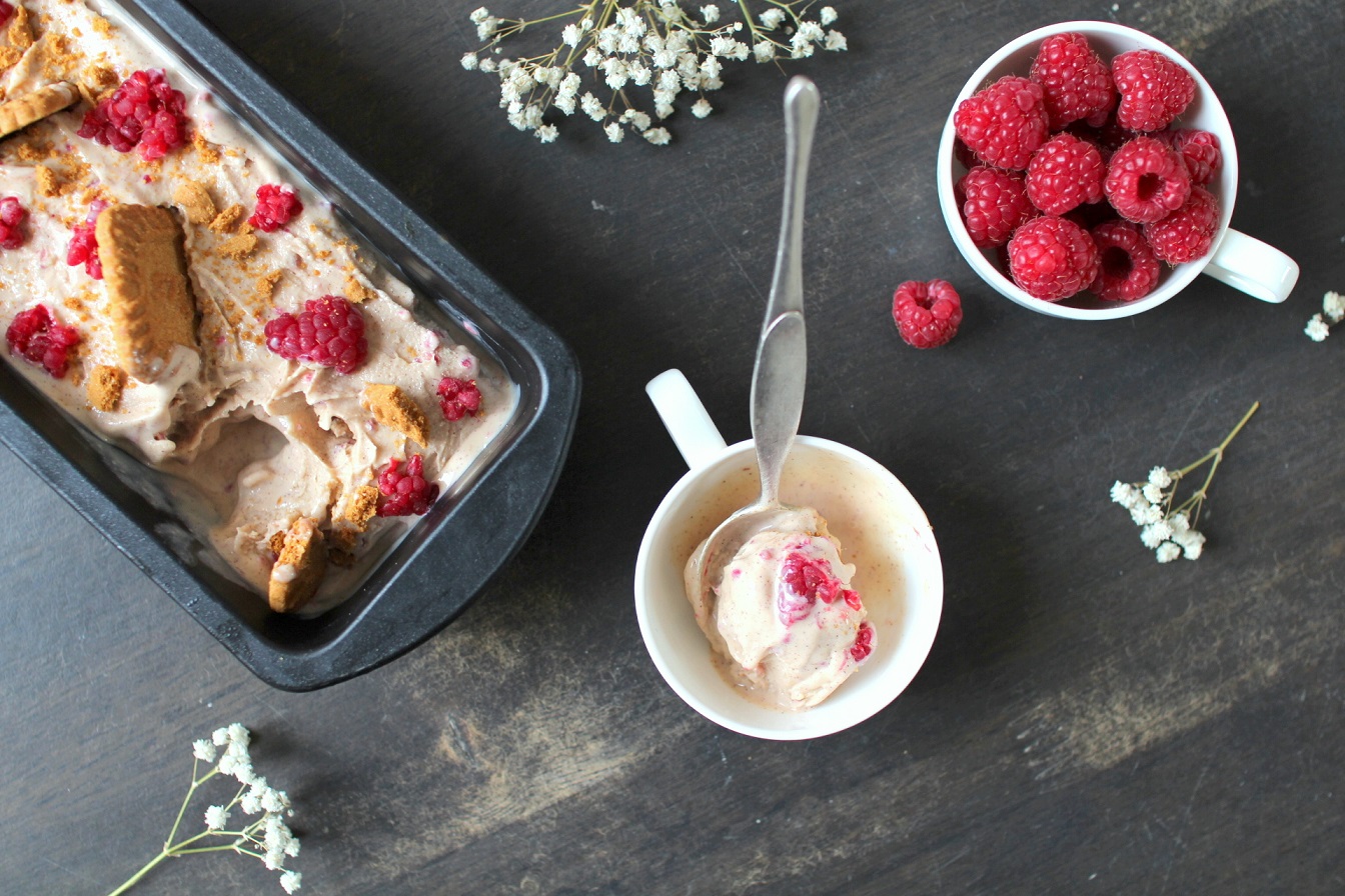 Une recette de glace à la cannelle et aux spéculoos, avec des framboises