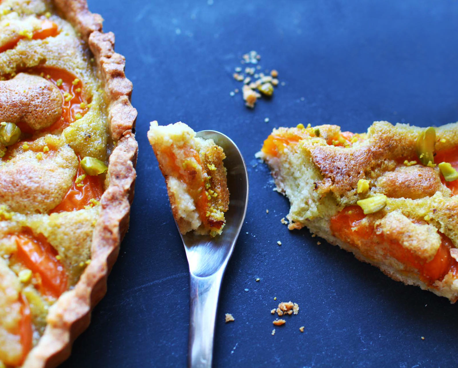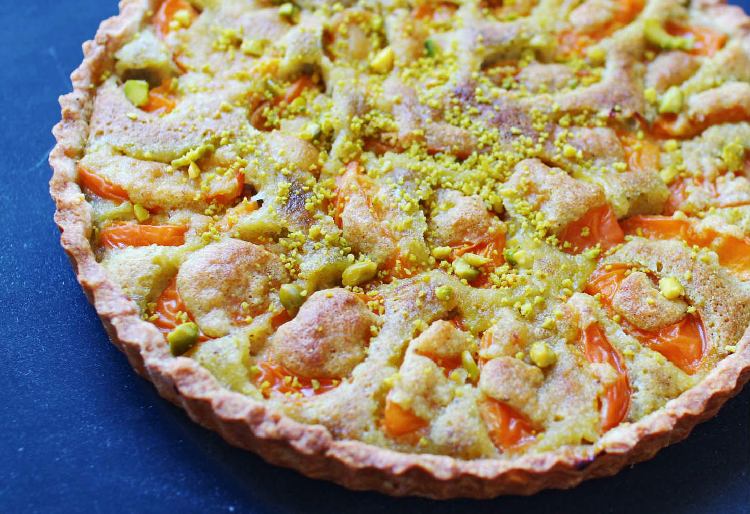 Je ne sais pas si c’est aussi le cas pour vous, mais dès que l’été arrive j’ai de soudaines envies de tartes et de desserts fruités ! Pourtant ce n’est pas vraiment dû à la chaleur qui ne s’est pas encore installée, c’est plutôt l’effet du soleil et une envie de manger des aliments colorés je crois. En fait plus il y a de couleurs, plus ça m’attire. En tout cas c’est un peu dans ce contexte que cette tarte a fait son apparition dans ma cuisine. Elle réunit tous les ingrédients que j’aime : une pâte sucrée aux noisettes, une crème amandine à la pistache et de bons abricots acidulés.