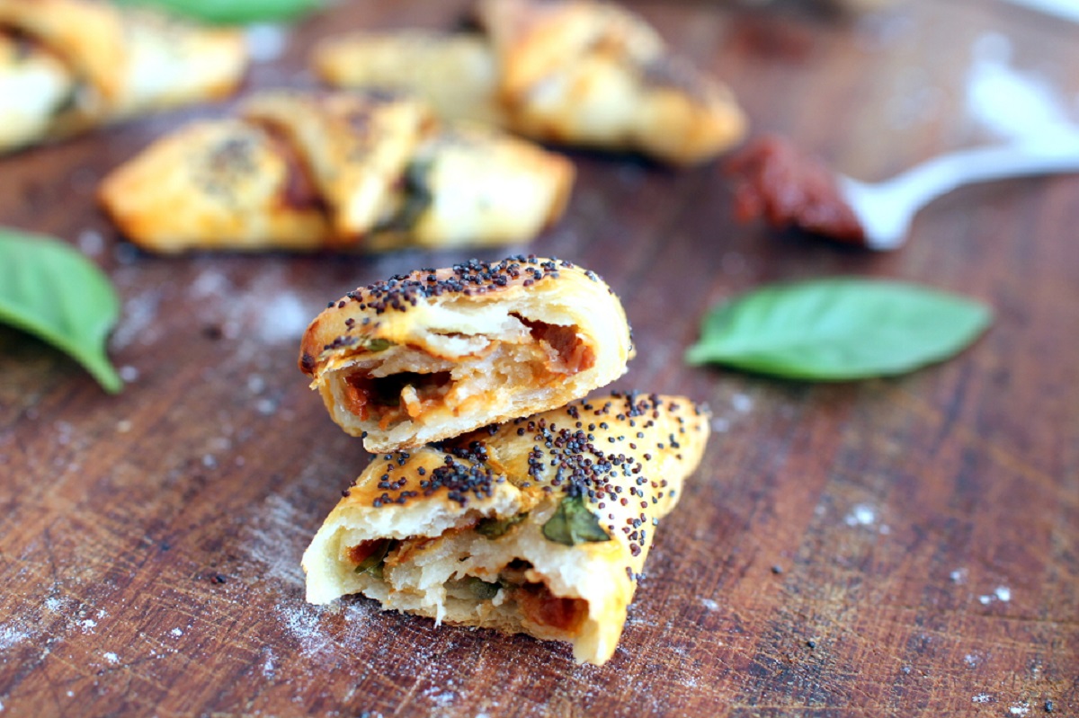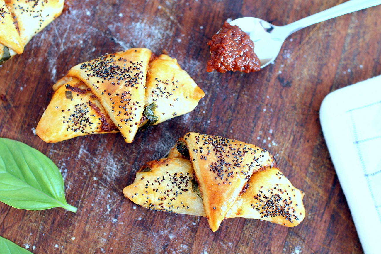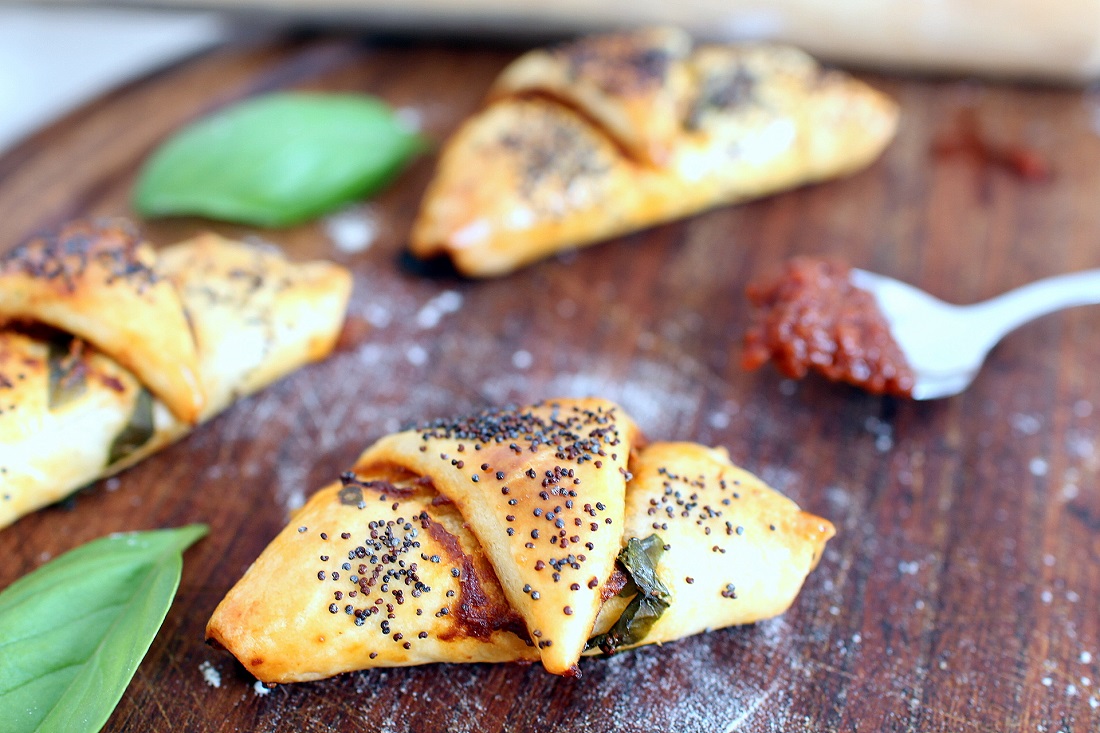 - Mixez les tomates confites et la chair de tomate. Sur chaque disque, étalez 2 à 3 grosses cuillères à soupe de sauce tomate pour bien napper toute la superficie, parsemez de parmesan, basilic frais, pignons, en faisant attention de ne pas trop surcharger le centre de la pâte. Découpez chaque disque de pâte en 8, de manière à obtenir 16 triangles, puis disposez un morceau de mozzarella par triangle, vers le bord le plus large. Roulez chaque part en commençant par le grand côté de façon à former des petits croissants.