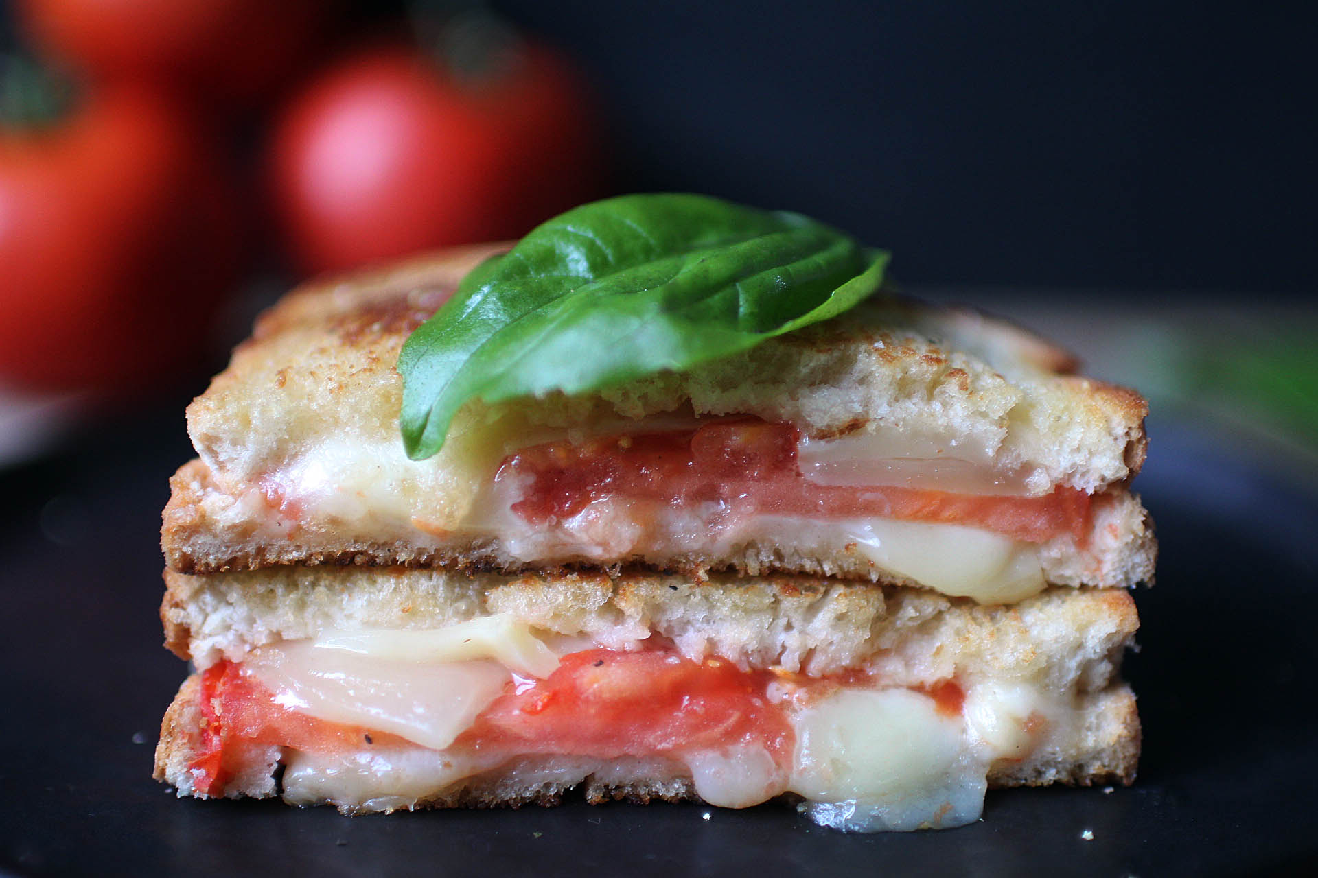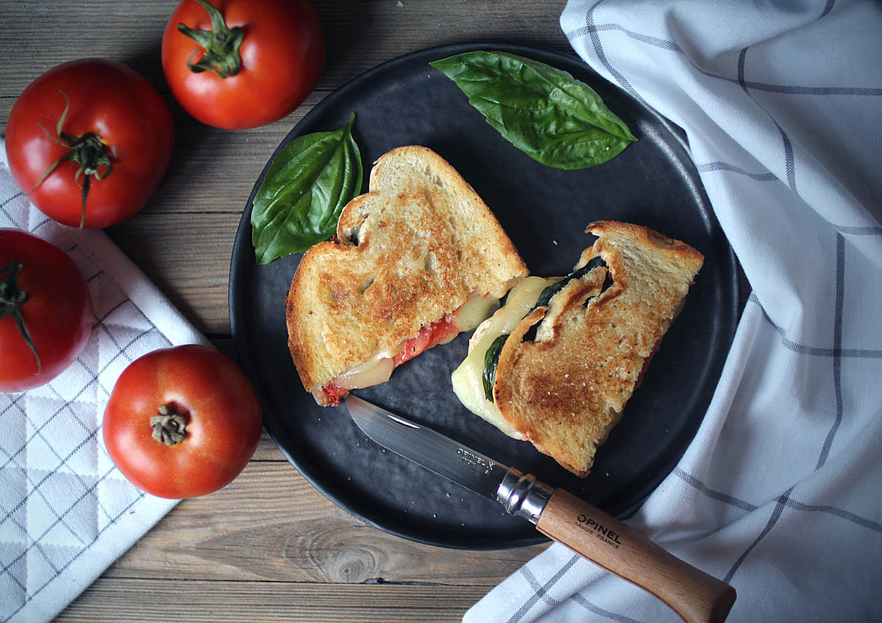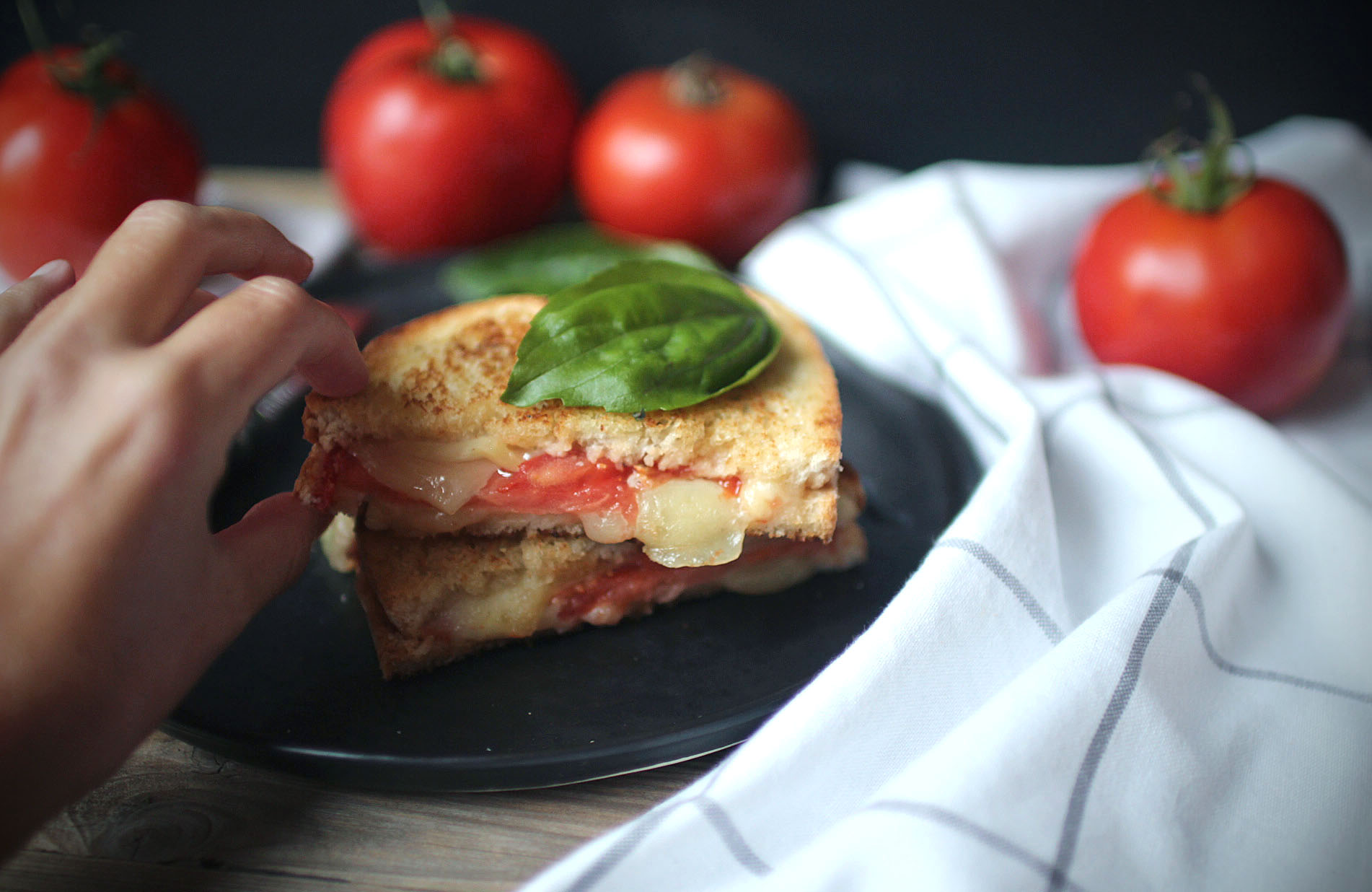 Le pain est essentiel ici : pas de pain de mie de supermarché donc mais du vrai pain tranché et dense de la boulangerie. Choisissez des tomates mûres charnues du marché, de grandes feuilles de basilic frais et pas de fromage tranché mais un bon fromage de brebis ou du comté. Plus le fromage aura de goût et meilleur sera votre grilled cheese.