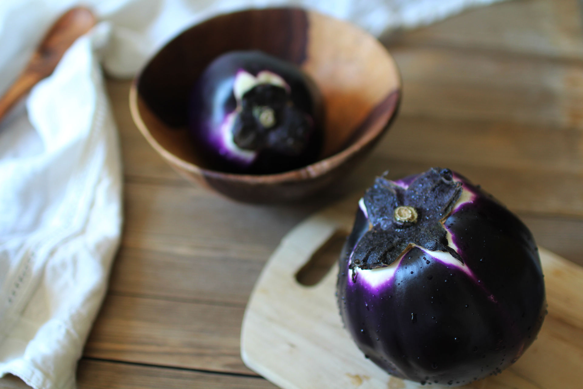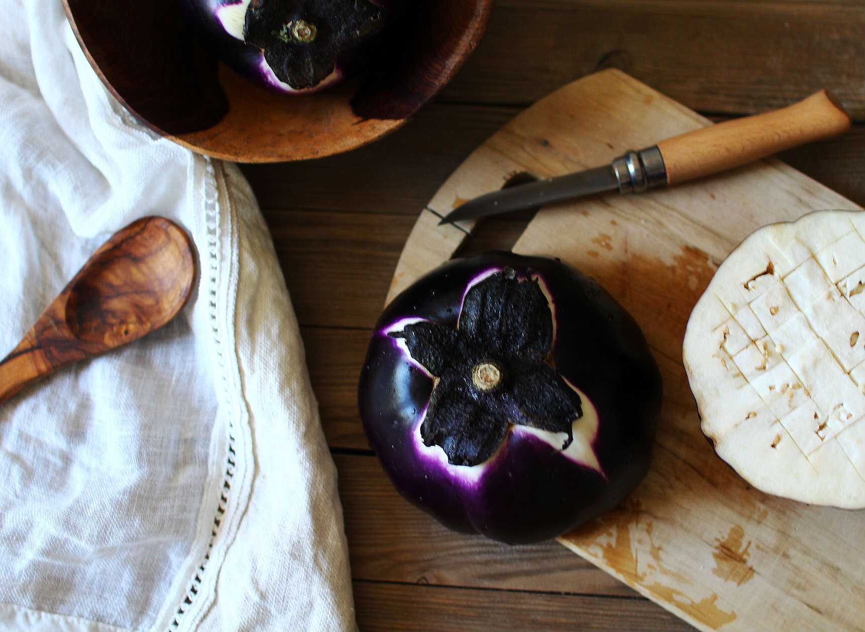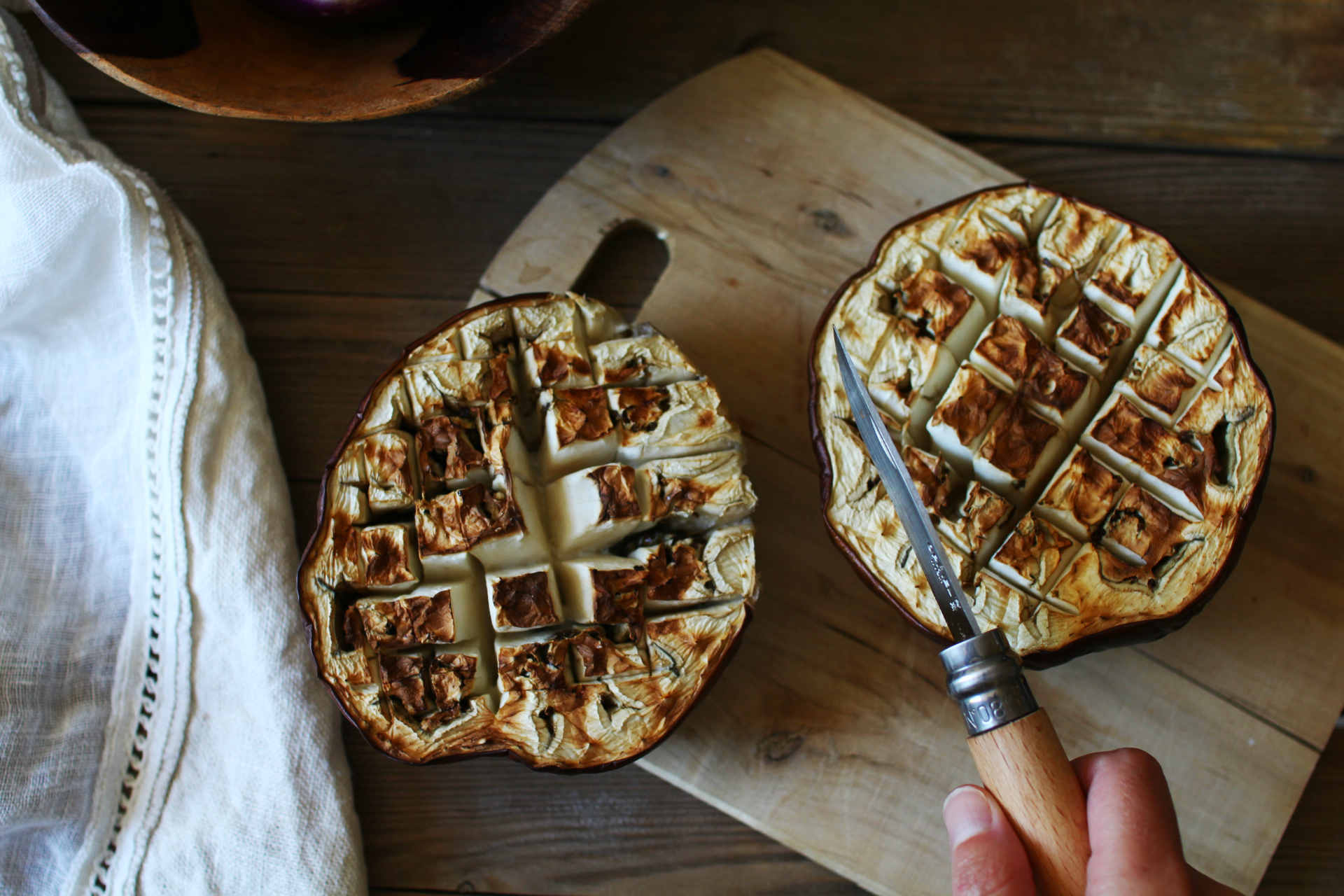 - Lavez les aubergines et coupez-les en deux. Entaillez la chair avec un couteau en formant un quadrillage et enfournez à 200°C pendant 30 à 40 minutes selon la taille de vos aubergines. Vos aubergines sont prêtes lorsque la chair est moelleuse et que la peau se détache sans effort de l'aubergine.
