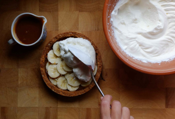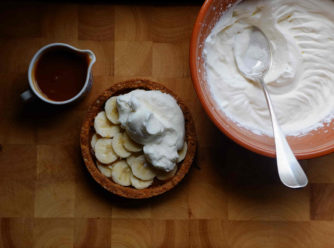 Note : Cette banoffee pie se conserve au réfrigérateur et se monte au dernier moment de préférence lorsque la base a bien pris et est bien dure, sous peine de la voir vite s’effondrer.