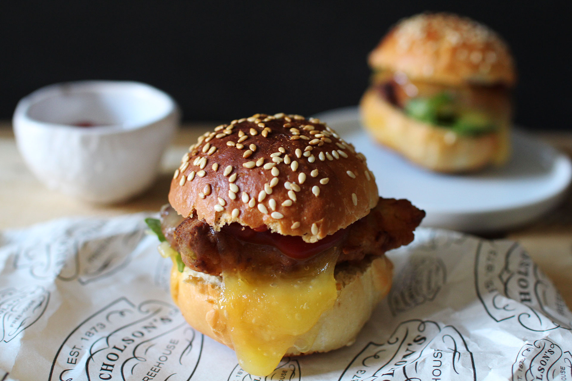 Habituellement j’aime mes burgers avec un bon steak haché de boeuf, du fromage et des oignons caramélisés comme ces burgers montagnards, mais il y a peu je suis devenue accro aux burgers au poulet, et plus précisément au poulet pané bien croustillant ! On peut aussi préparer cette recette avec du poulet que l’on aura cuit au fumoir. Un délice aussi !