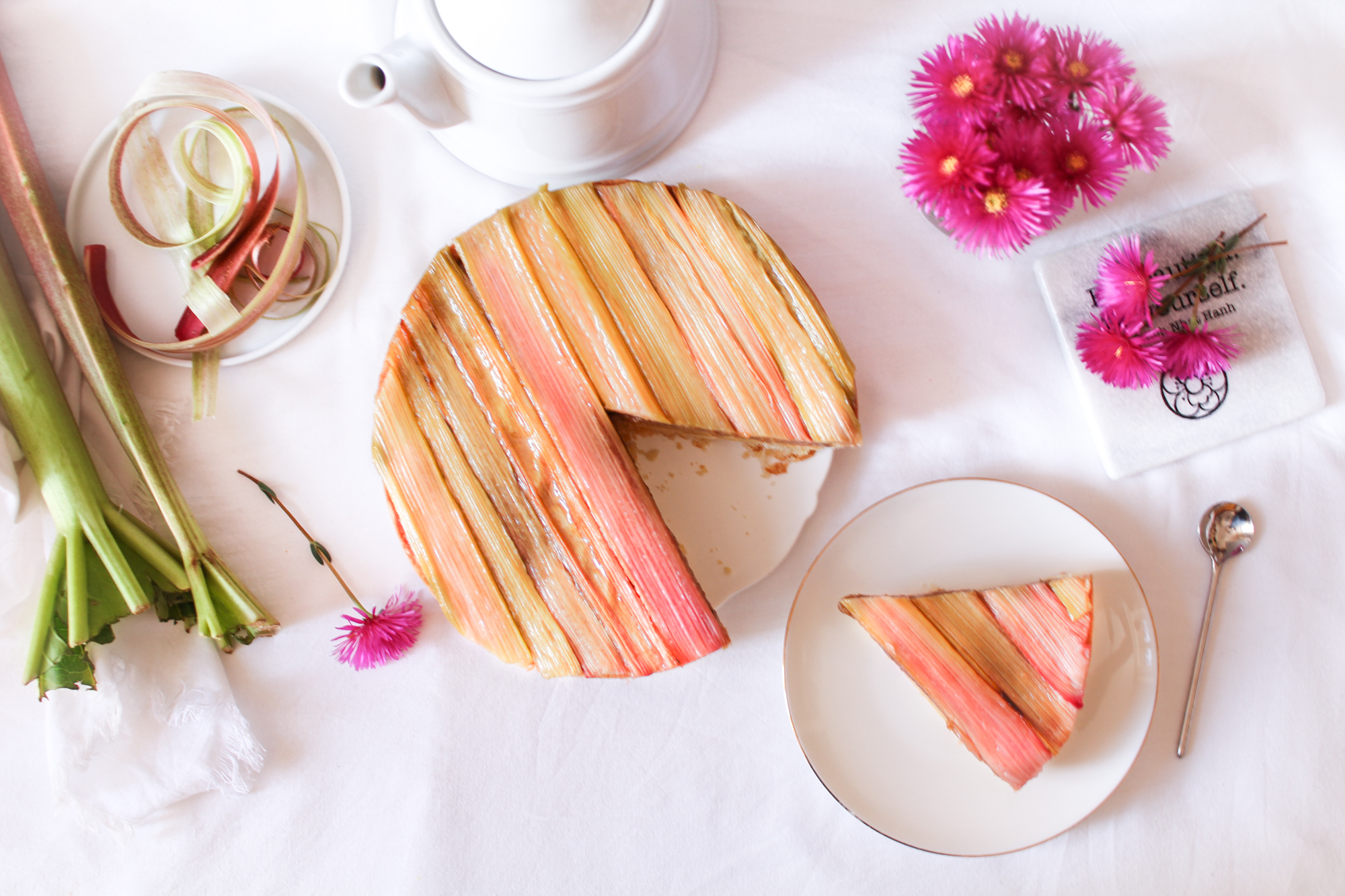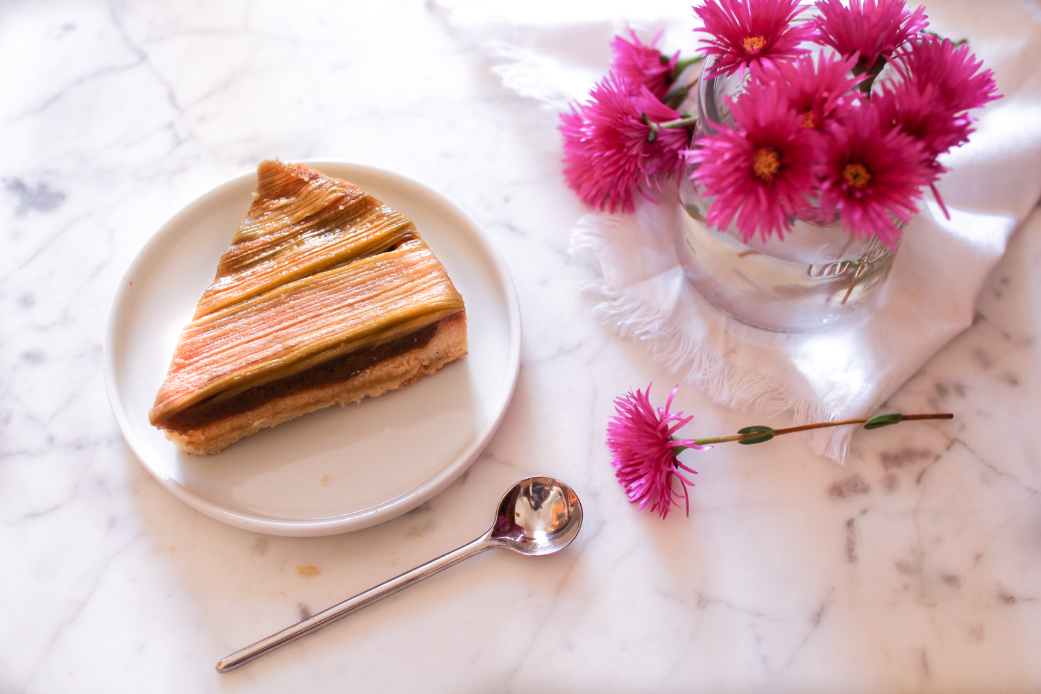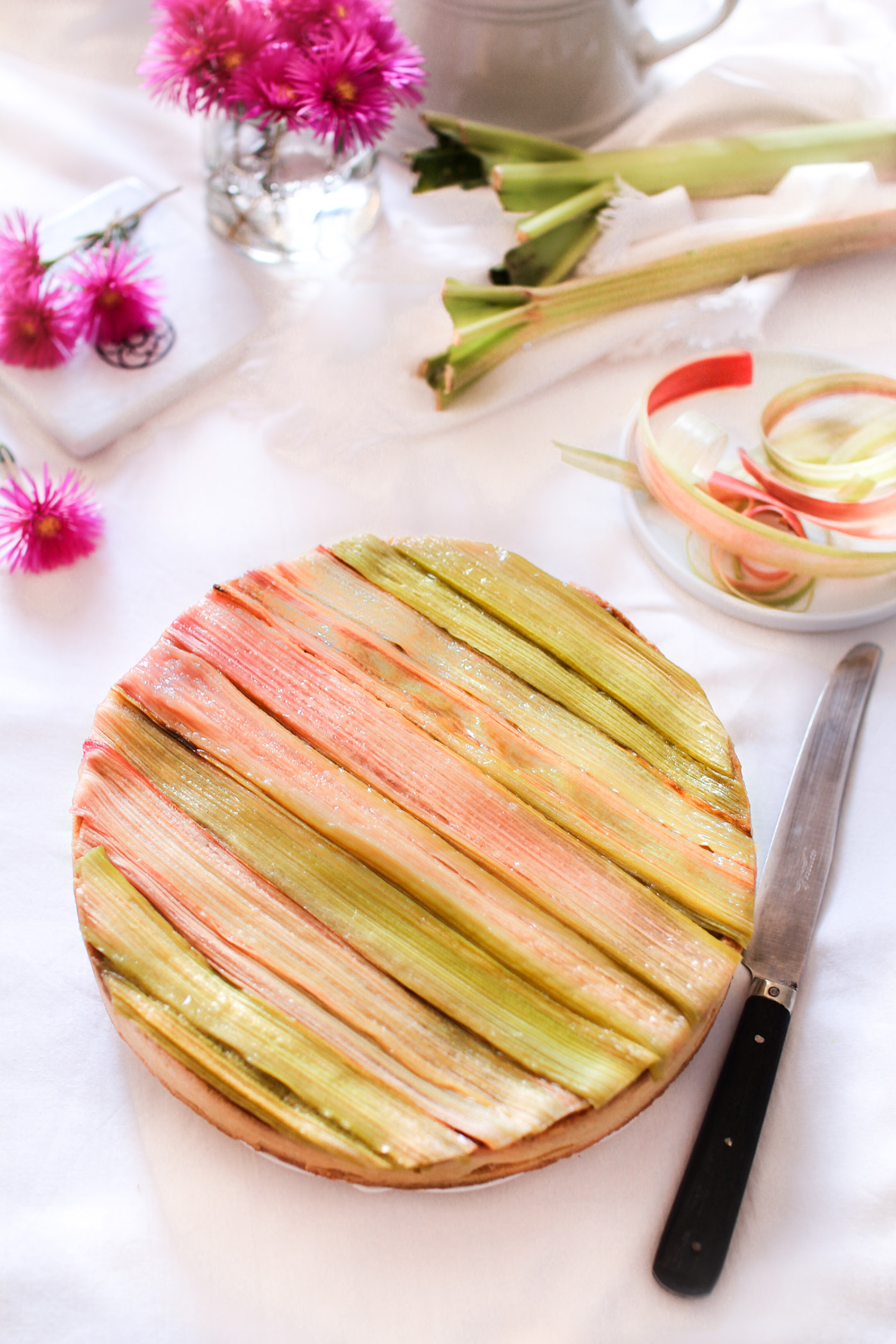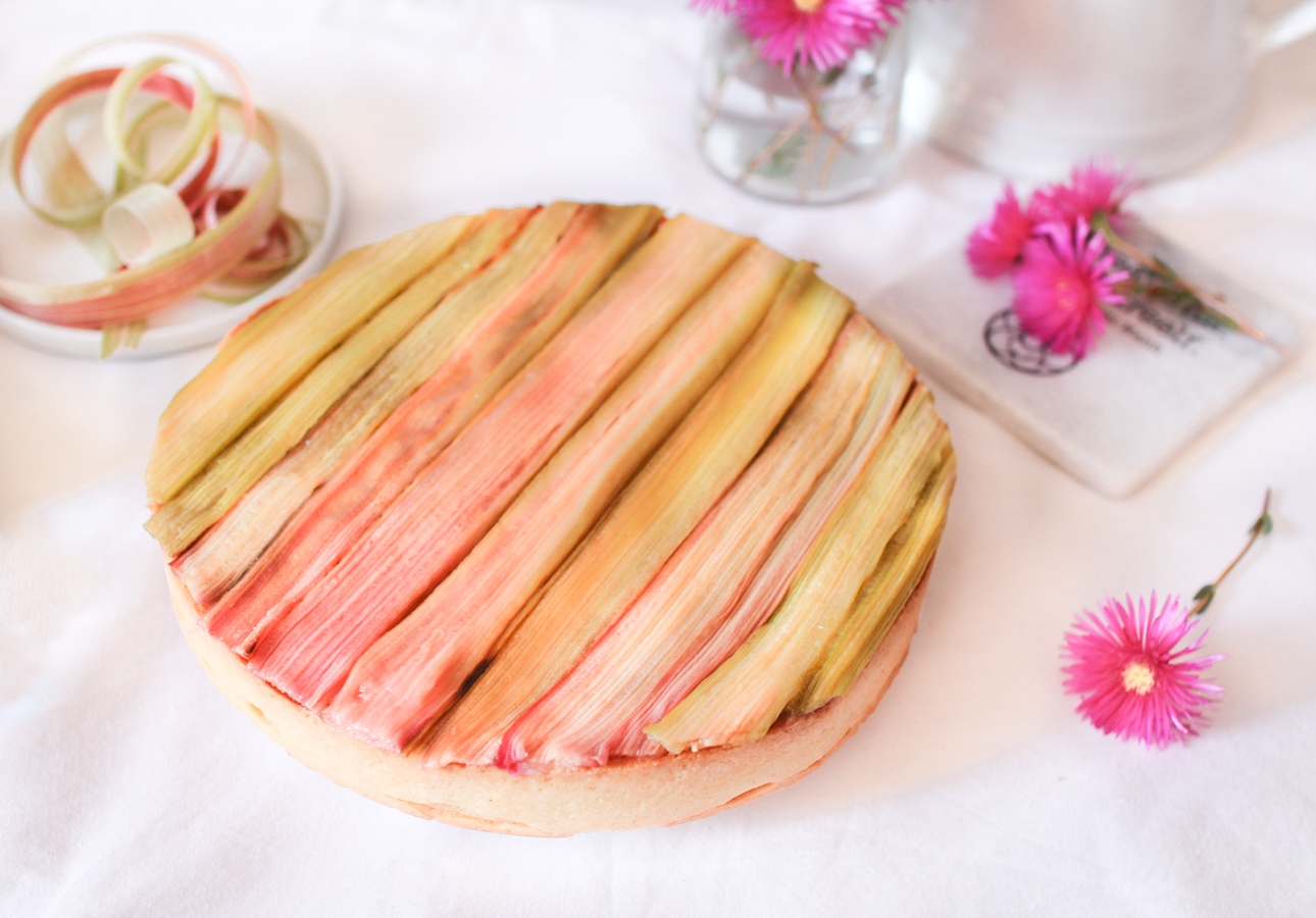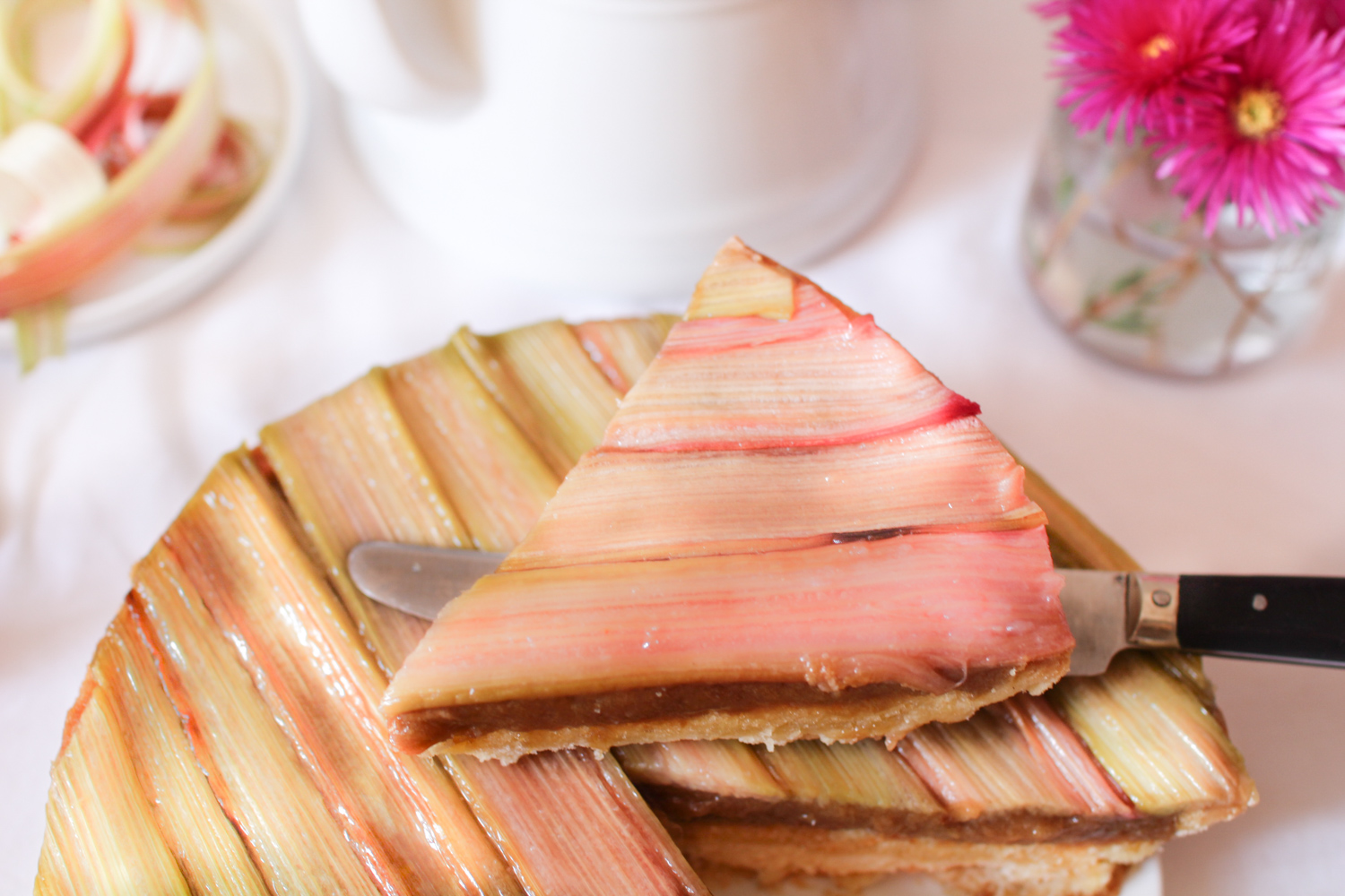 La raison ? Les plusieurs couches qui composent cette tarte. Oui parce qu’on ne s’en doute pas en voyant ces jolies bandes de rhubarbe, mais en dessous, se cachent une pâte de rhubarbe, une crème d’amande et une pâte sucrée. 4 étapes donc qui rallongent un peu le temps de préparation par rapport à une simple tarte.