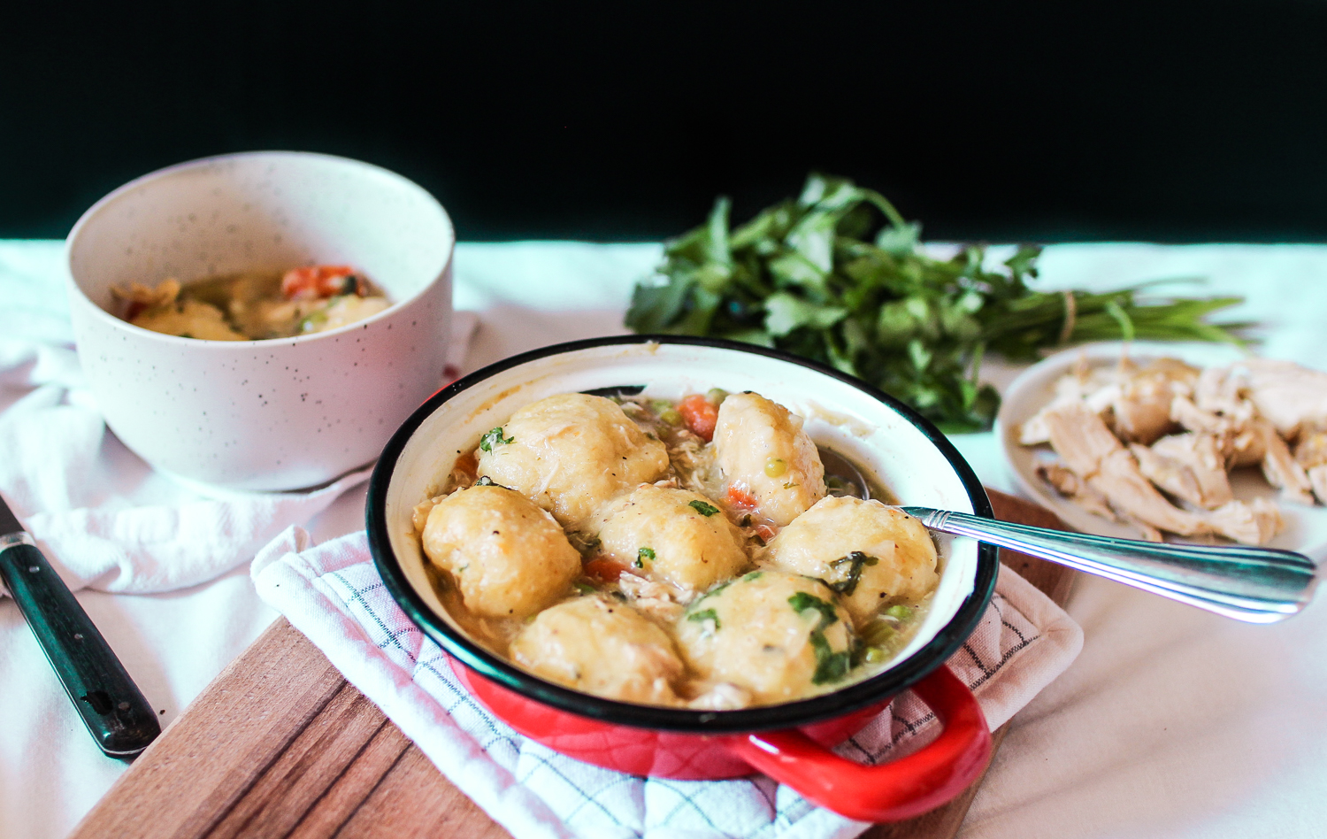 Il s’agit d’une recette typique du Sud des Etats-Unis. C’est une sorte de soupe au poulet et aux légumes (entre une soupe et un ragoût en fait), surmontée de boulettes de pâte fondantes cuites à la vapeur, que j’apparenterais à des sortes de petites quenelles au niveau de la texture et du goût.