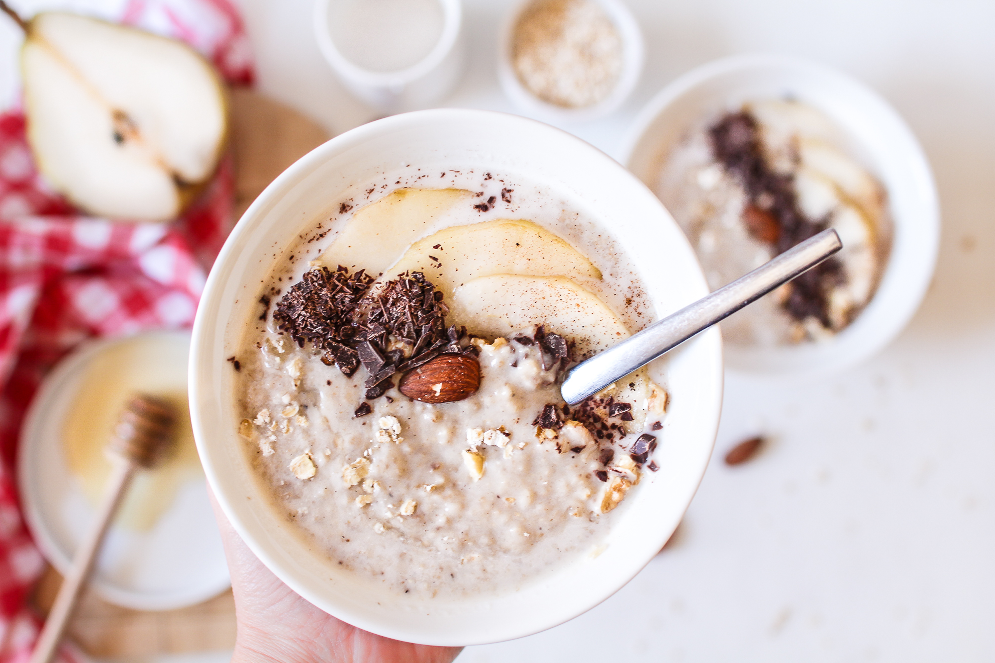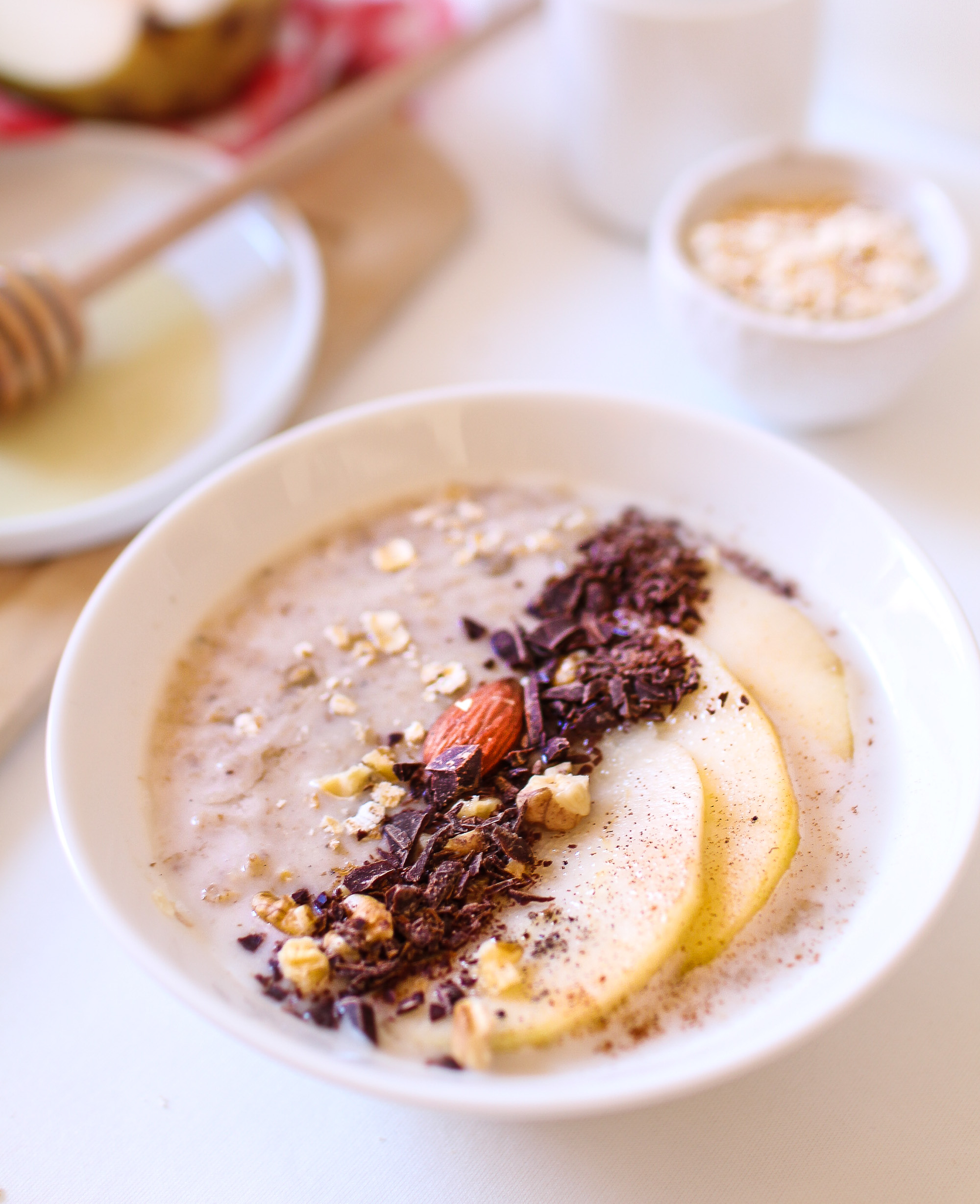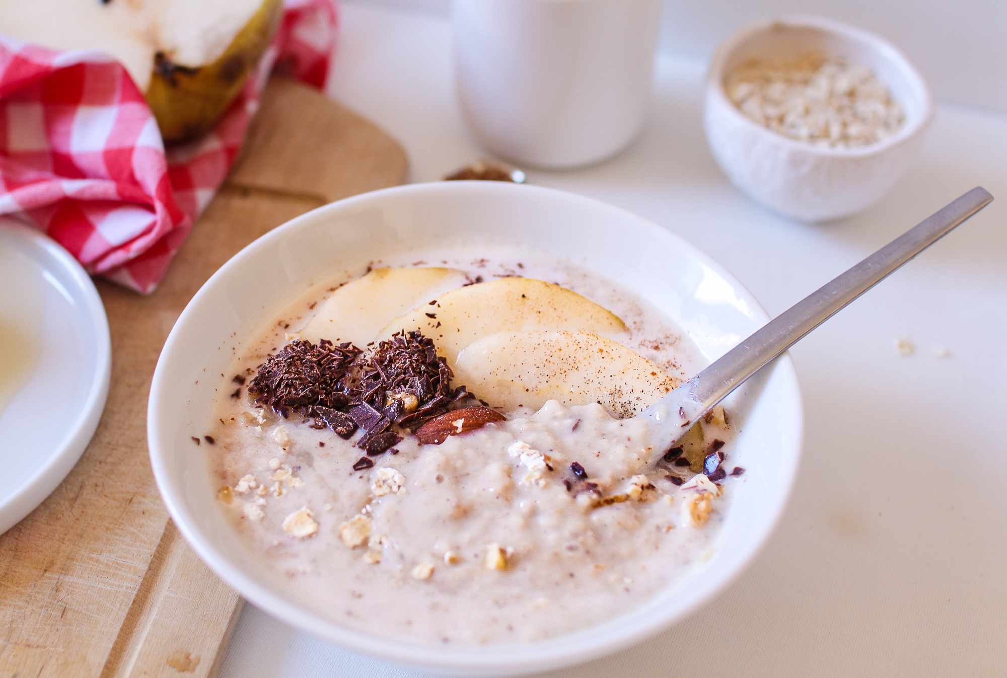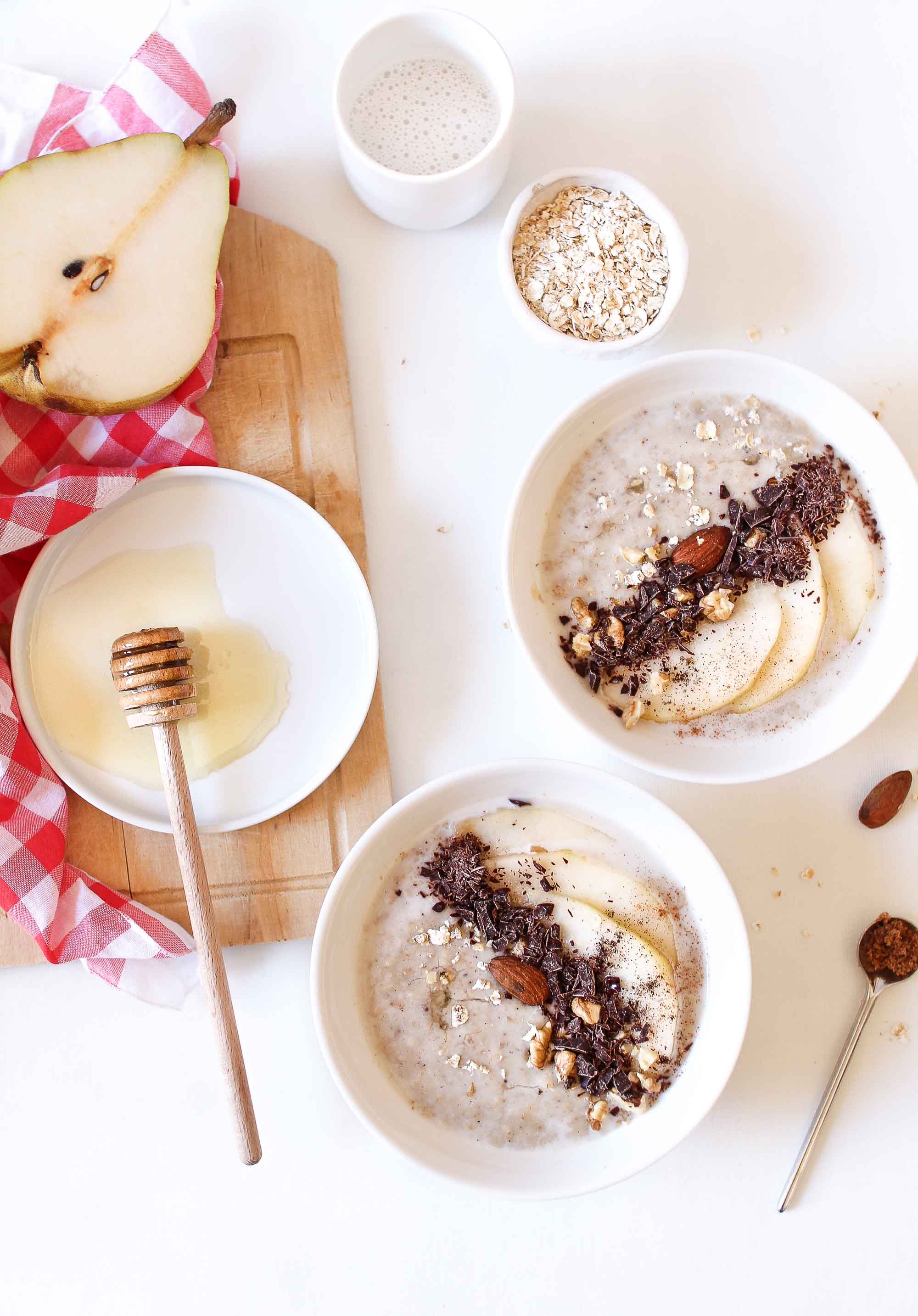 Le porridge dont je vais vous parler aujourd’hui est à la poire, à la vanille et aux copeaux de chocolat.