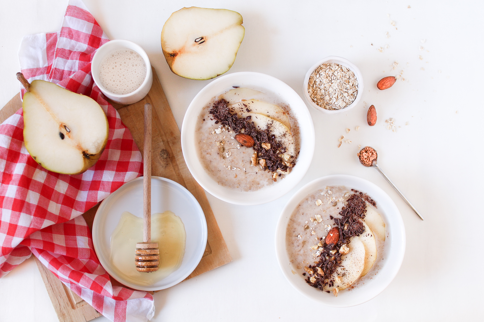 - Servez le mélange dans des bols et déposez par dessus des tranches de poires, amandes (ou noisettes, noix ou graines de votre choix) puis râper le chocolat.