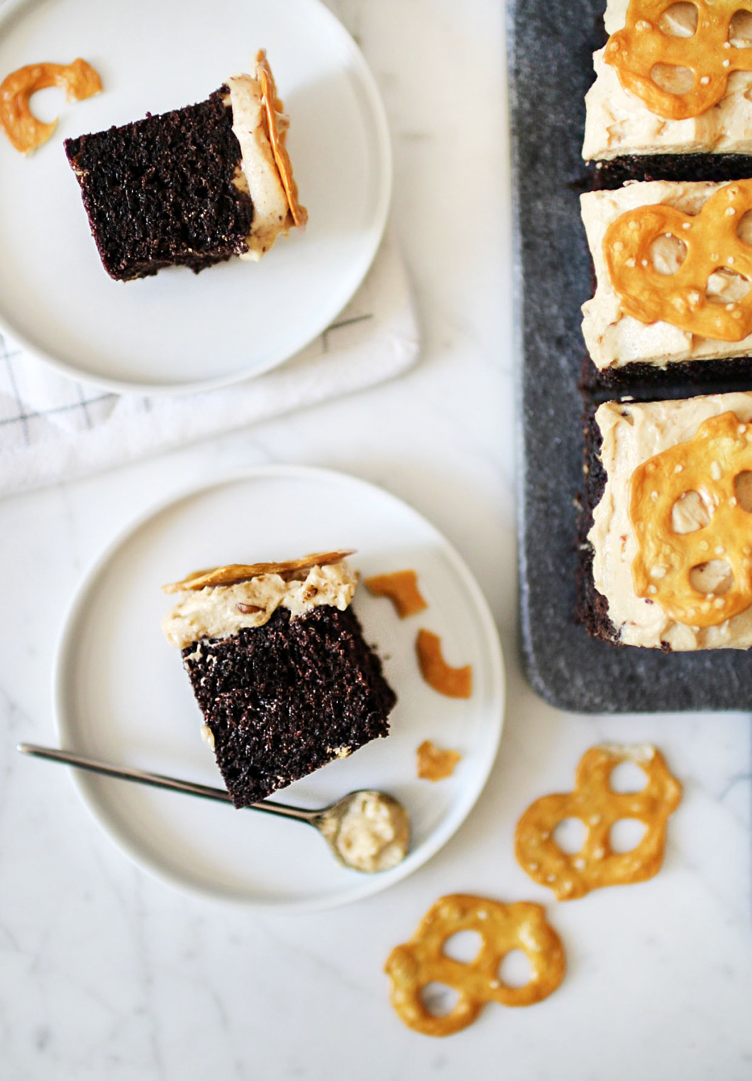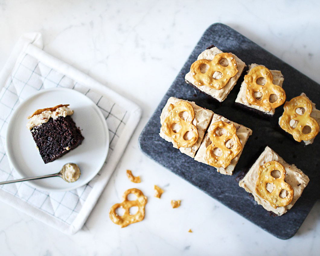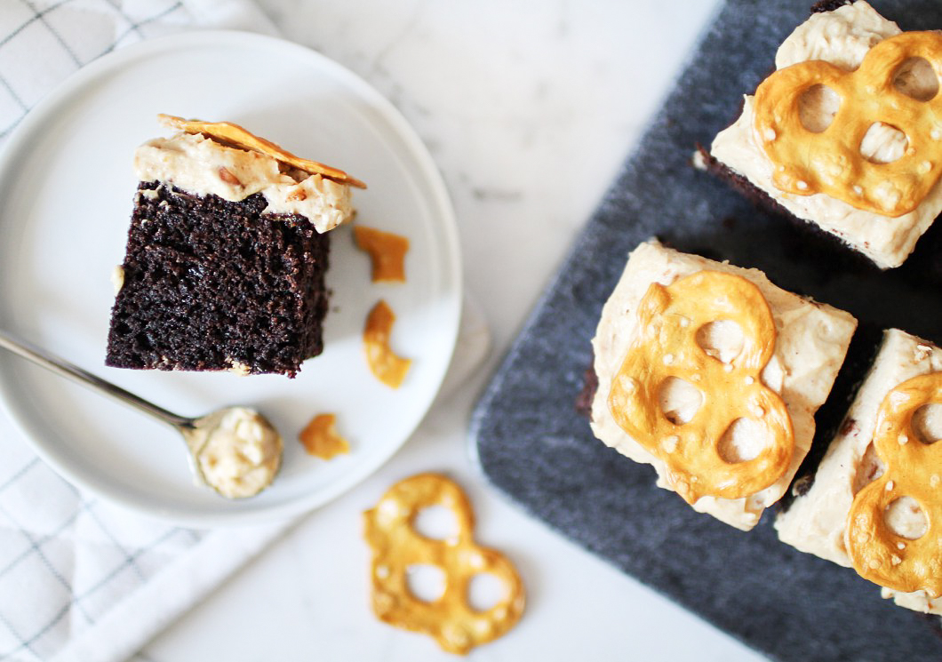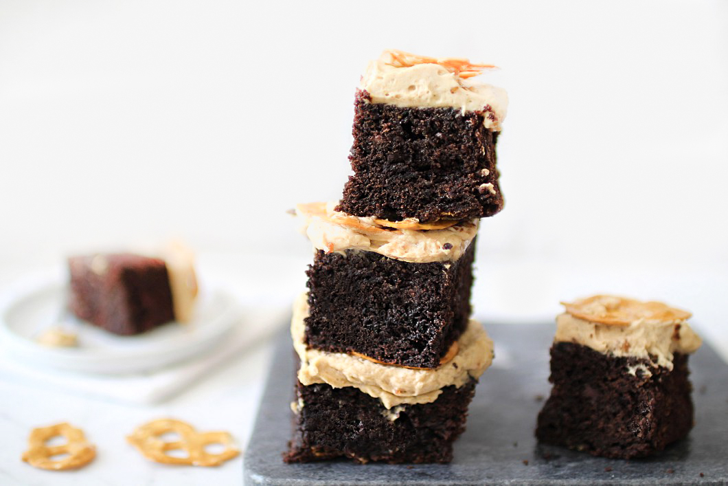 Bref, c’était un de ces soirs où j’avais eu une journée horrible au travail et où je n’avais qu’une envie : manger un dessert réconfortant. Oui, un brownie. Avec un glaçage. Au beurre de cacahuète. Et avec des bretzels.