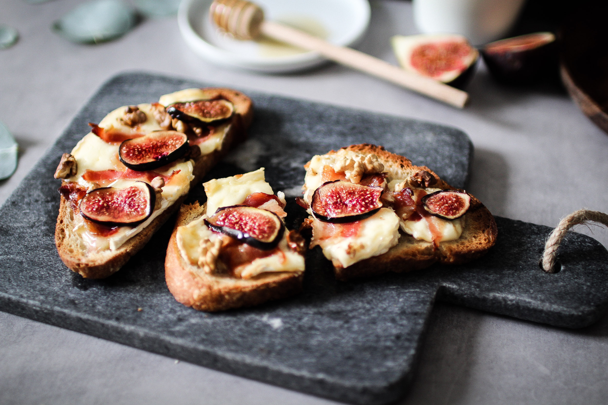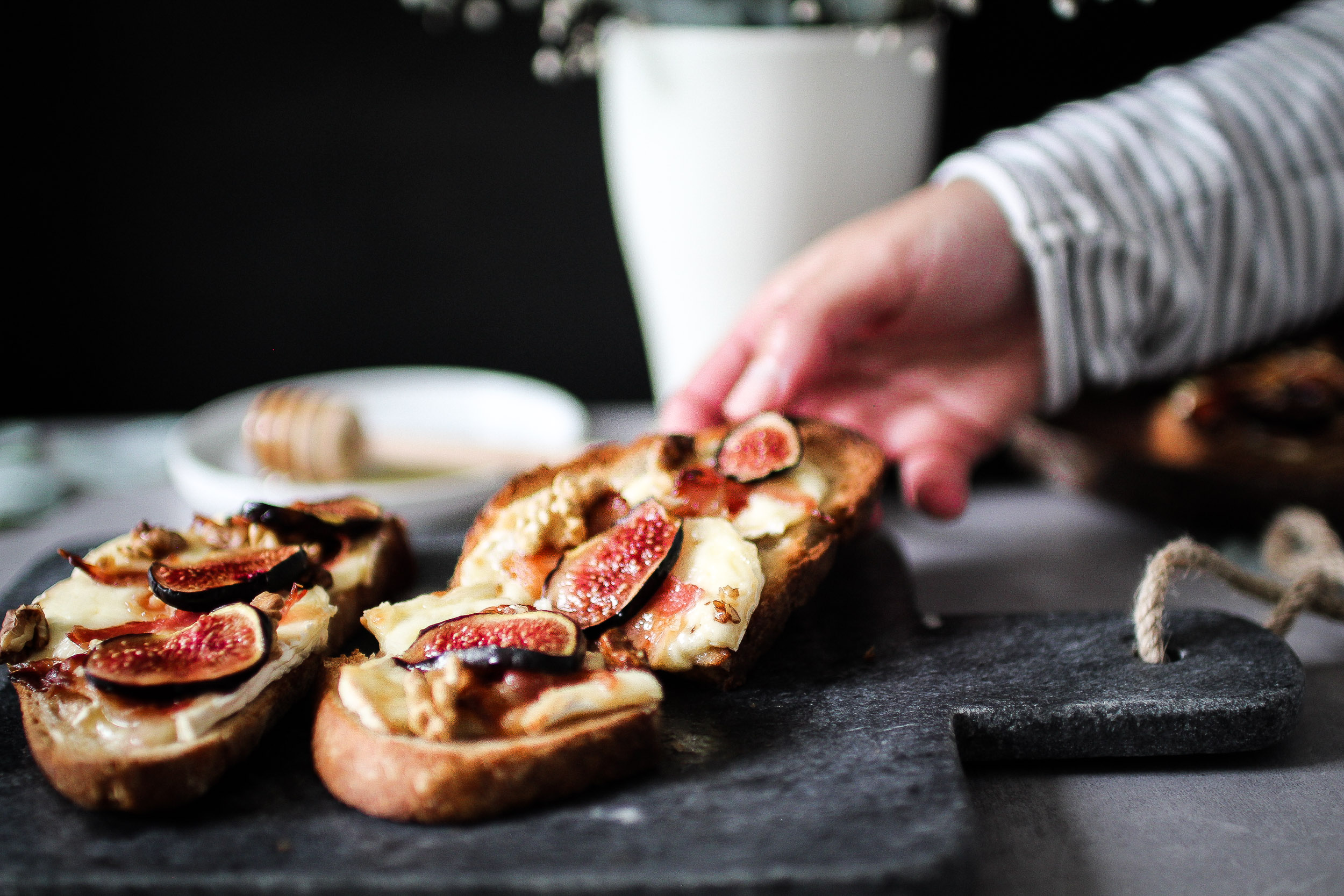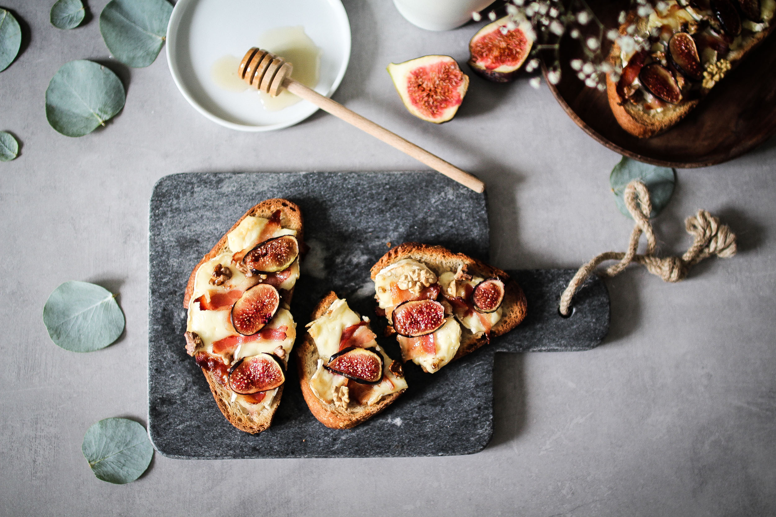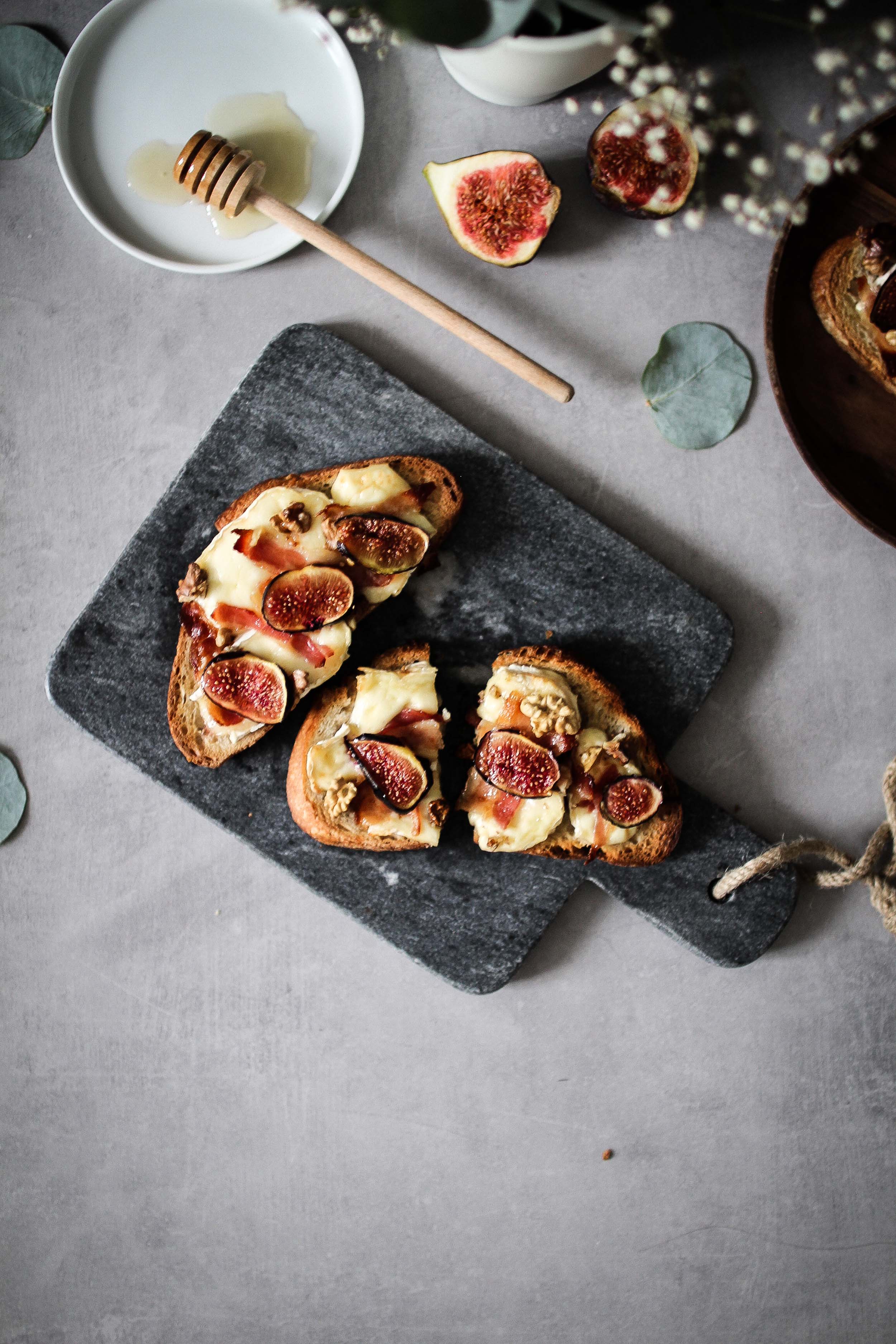 Pour cette recette je me suis inspirée d’une recette de croque au brie et aux figues de Nigella Lawson. Je l’avais vue l’été dernier sur la chaîne My Cuisine et depuis j’avais envie de tester l’association brie et figues. J’y ai rajouté du bacon grillé, des noix et un peu de miel pour caraméliser légèrement le tout.