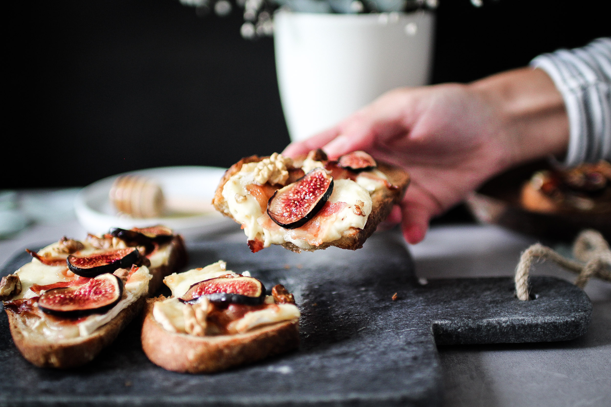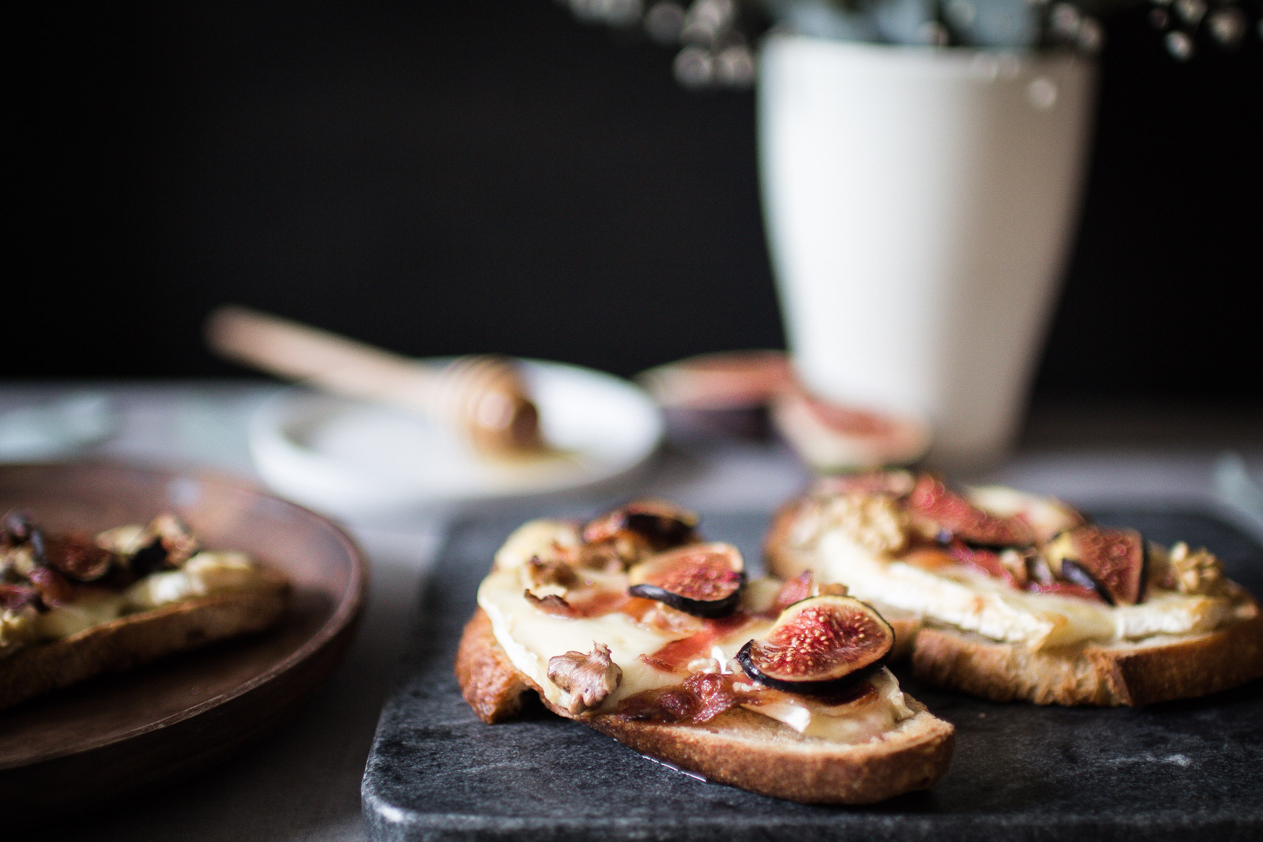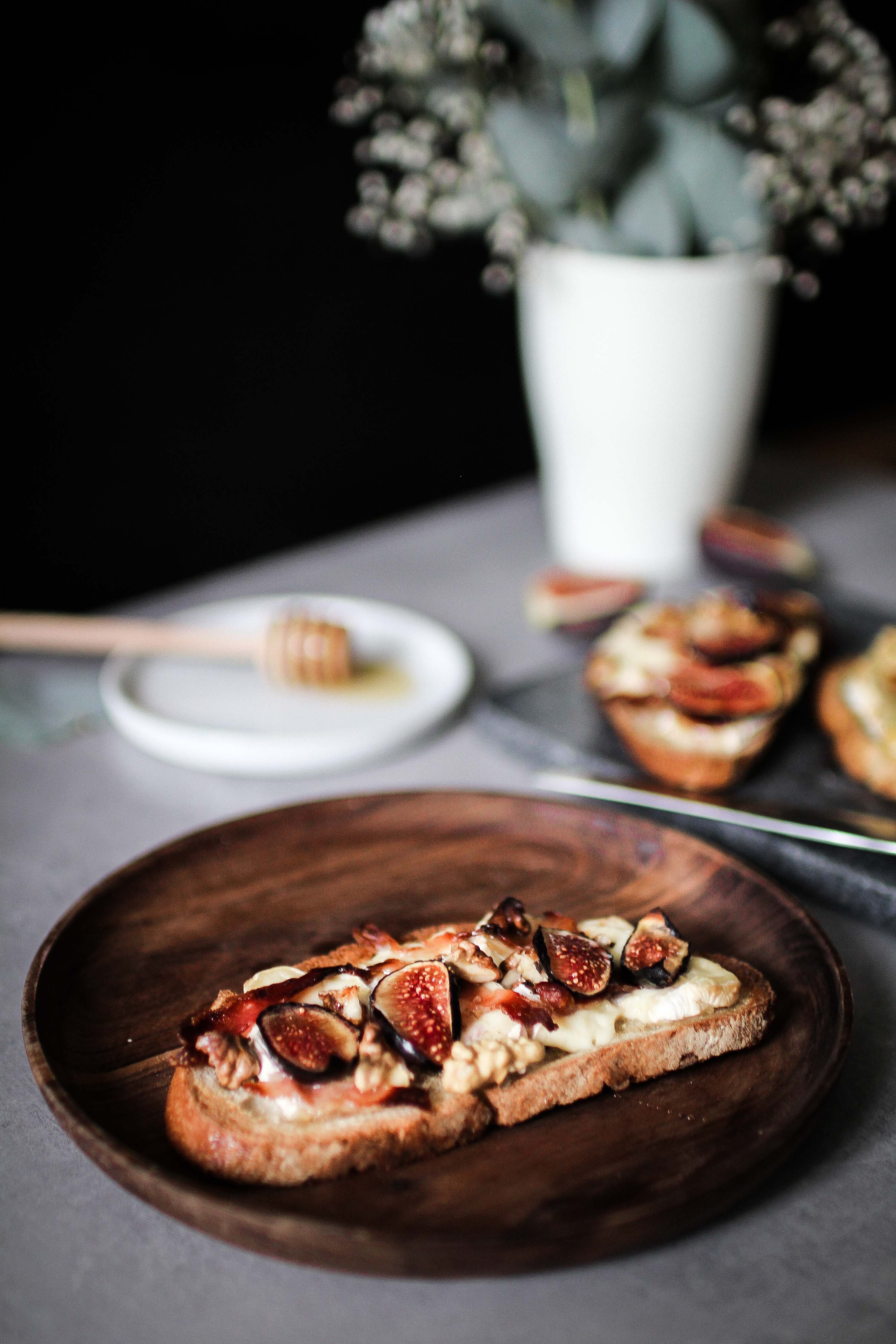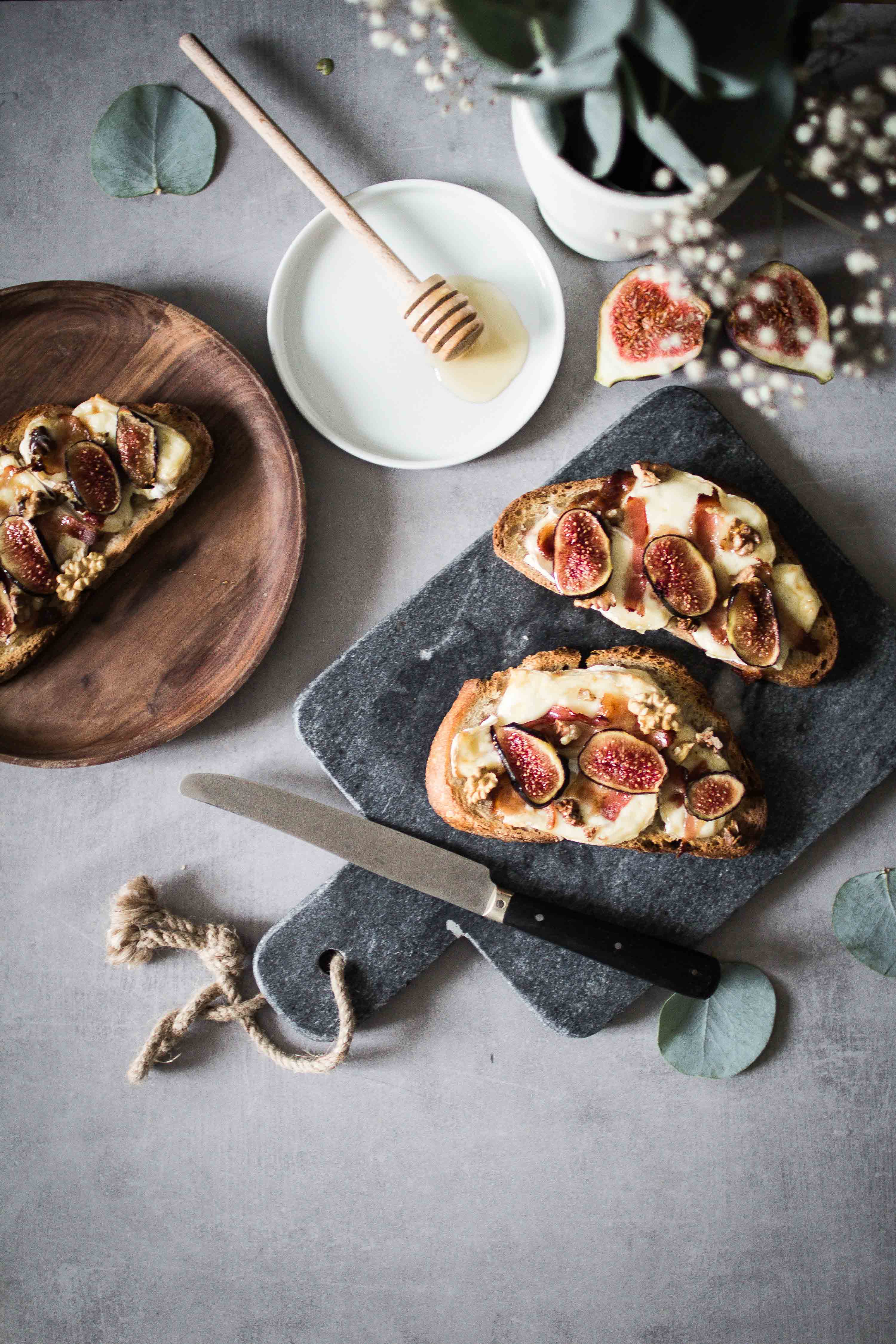 Pour cette recette je me suis inspirée d’une recette de croque au brie et aux figues de Nigella Lawson. Je l’avais vue l’été dernier sur la chaîne My Cuisine et depuis j’avais envie de tester l’association brie et figues. J’y ai rajouté du bacon grillé, des noix et un peu de miel pour caraméliser légèrement le tout.