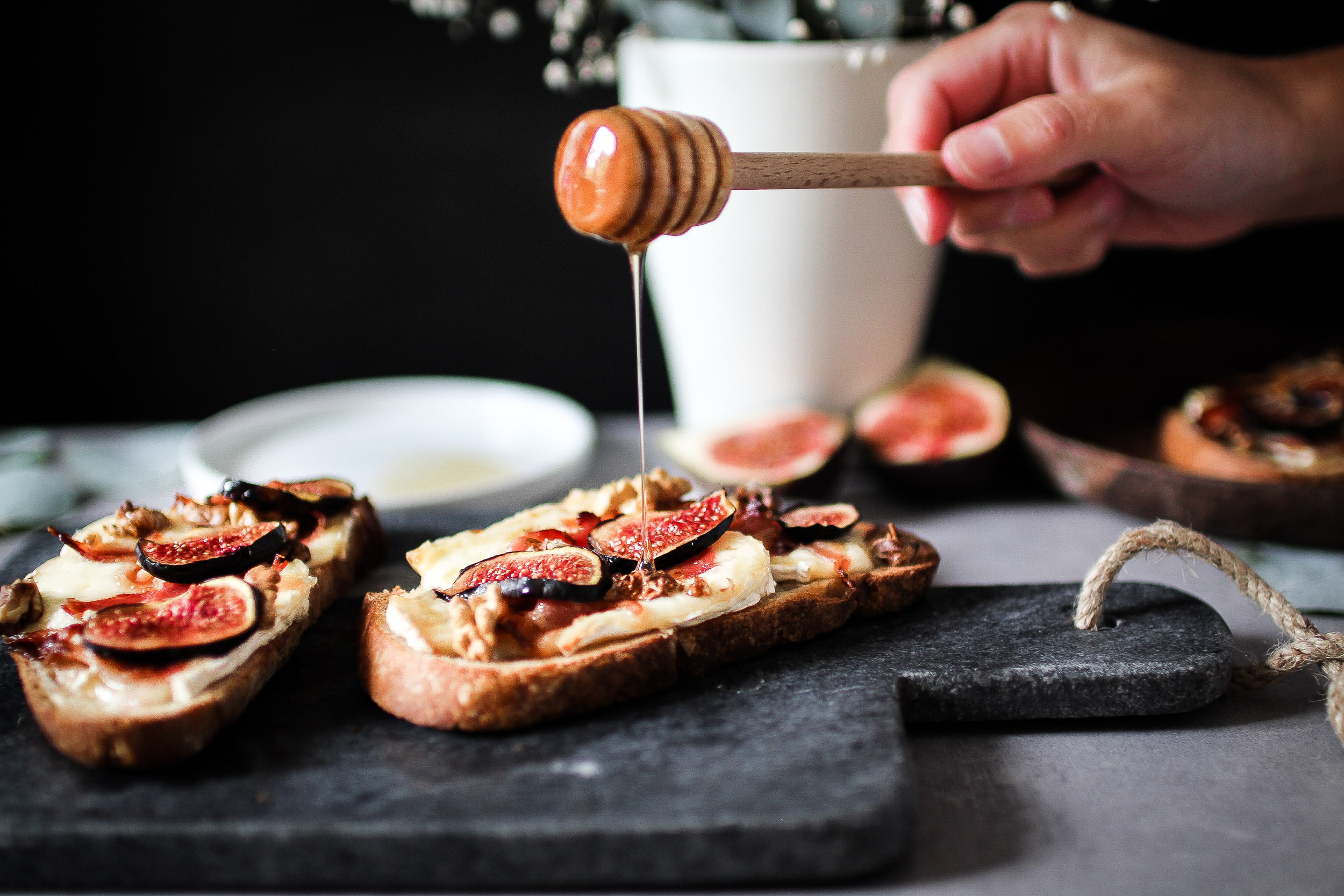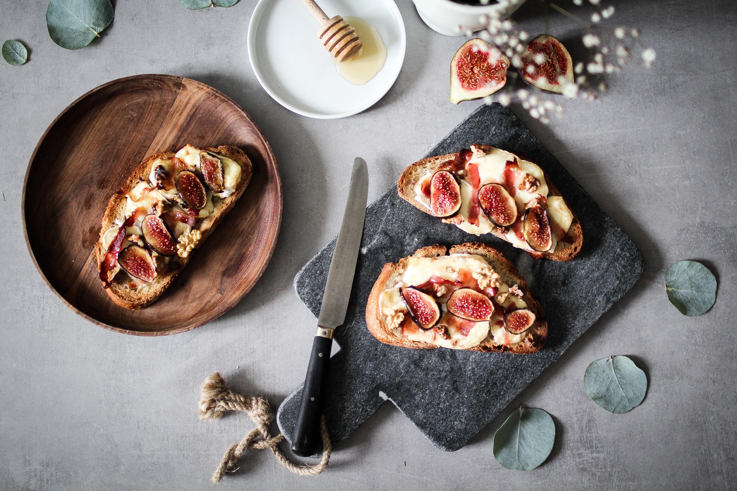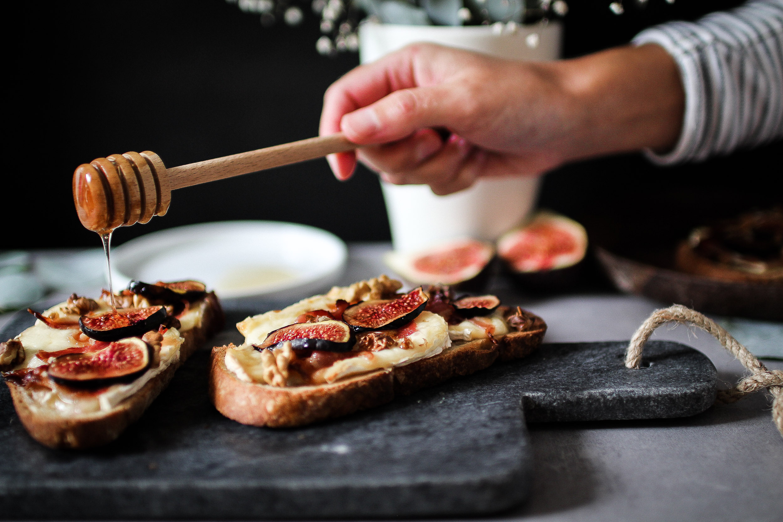 - Beurrez légèrement le dessous de chaque tranche de pain et déposez-les sur le papier cuisson qui a servi à cuire le bacon (le pain va absorber le gras restant de la poitrine fumée !). Sur chaque tartine, déposez les tranches de brie et poivrez. Puis, dans l’ordre, déposez par-dessus, les morceaux de poitrine fumée, les noix, les figues et un filet de miel.