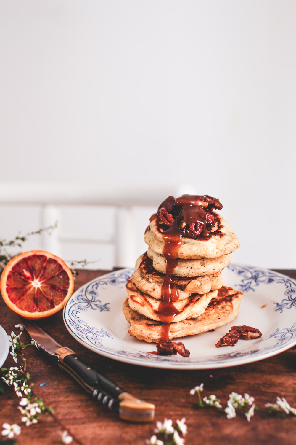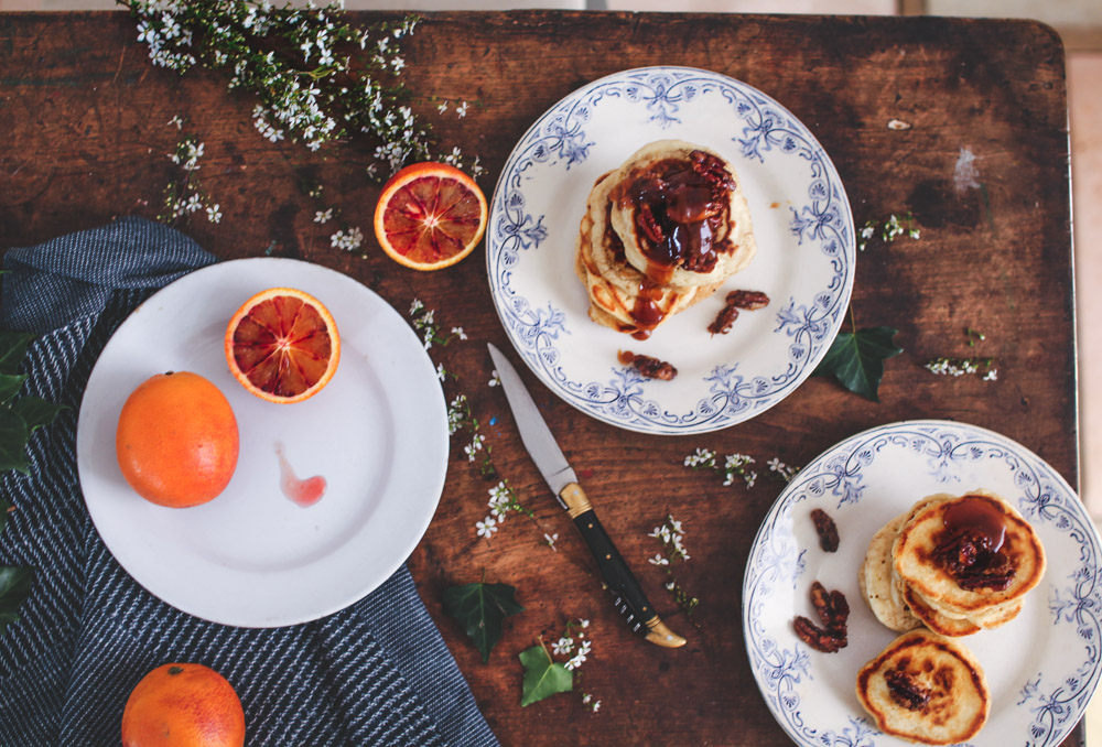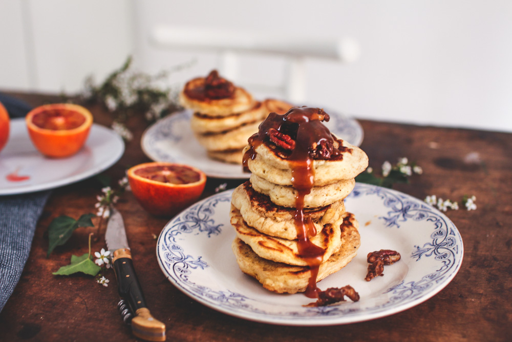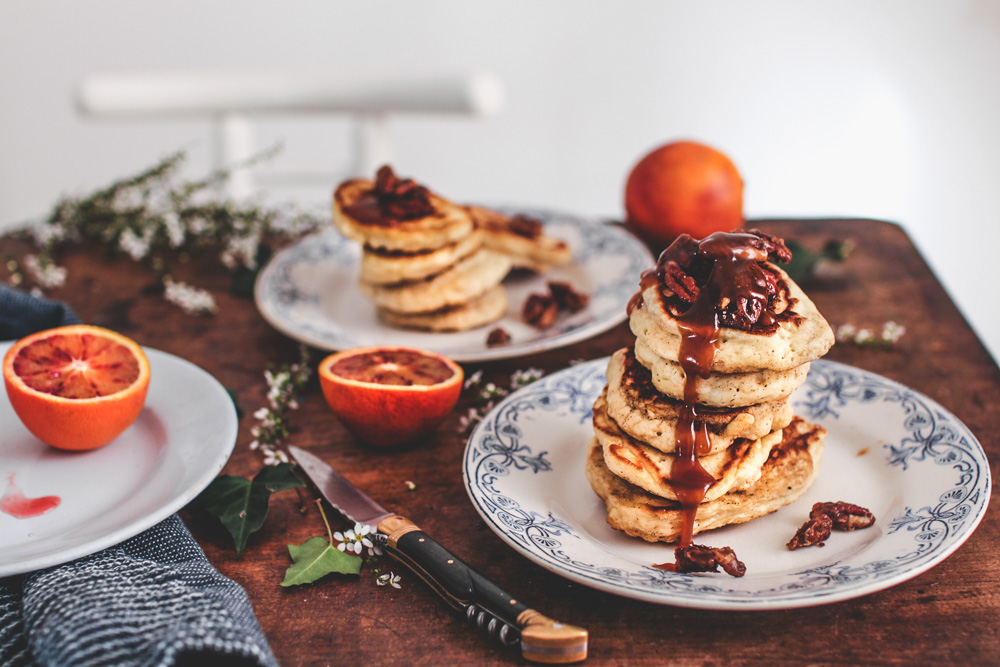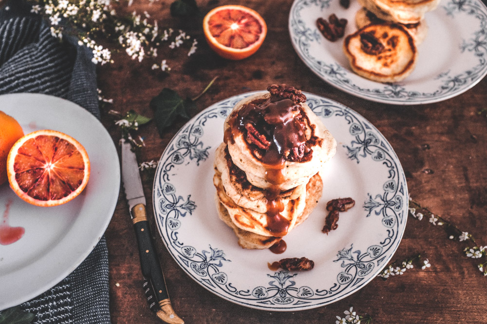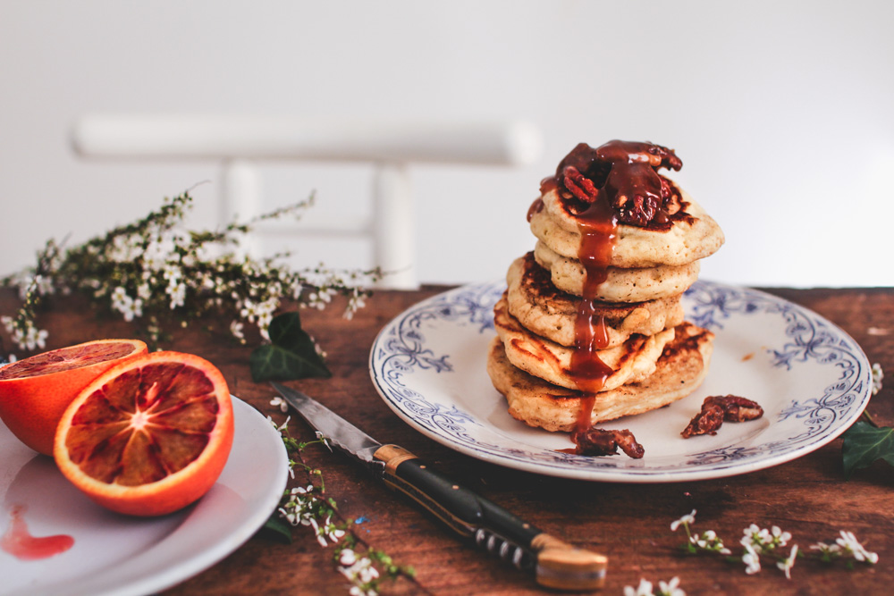 Bon, pour dire vrai, elle n’est pas entièrement nouvelle puisqu’il s’agit de ma recette fétiche de pancakes fluffy. Je n’y déroge jamais, c’est vraiment la meilleure que j’aie pu tester et je ne saurais que trop vous conseiller de l’essayer si vous ne la connaissez pas : elle est inratable ! Ce qui est nouveau aujourd’hui c’est la garniture qui l’accompagne : une sauce au caramel au beurre salé et des noix de pécan épicées caramélisées…