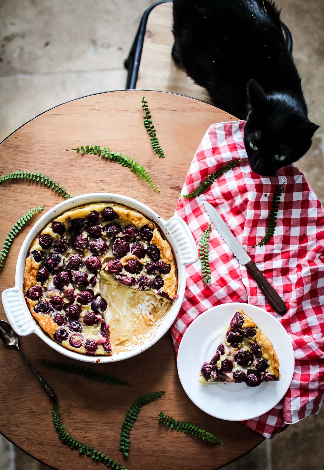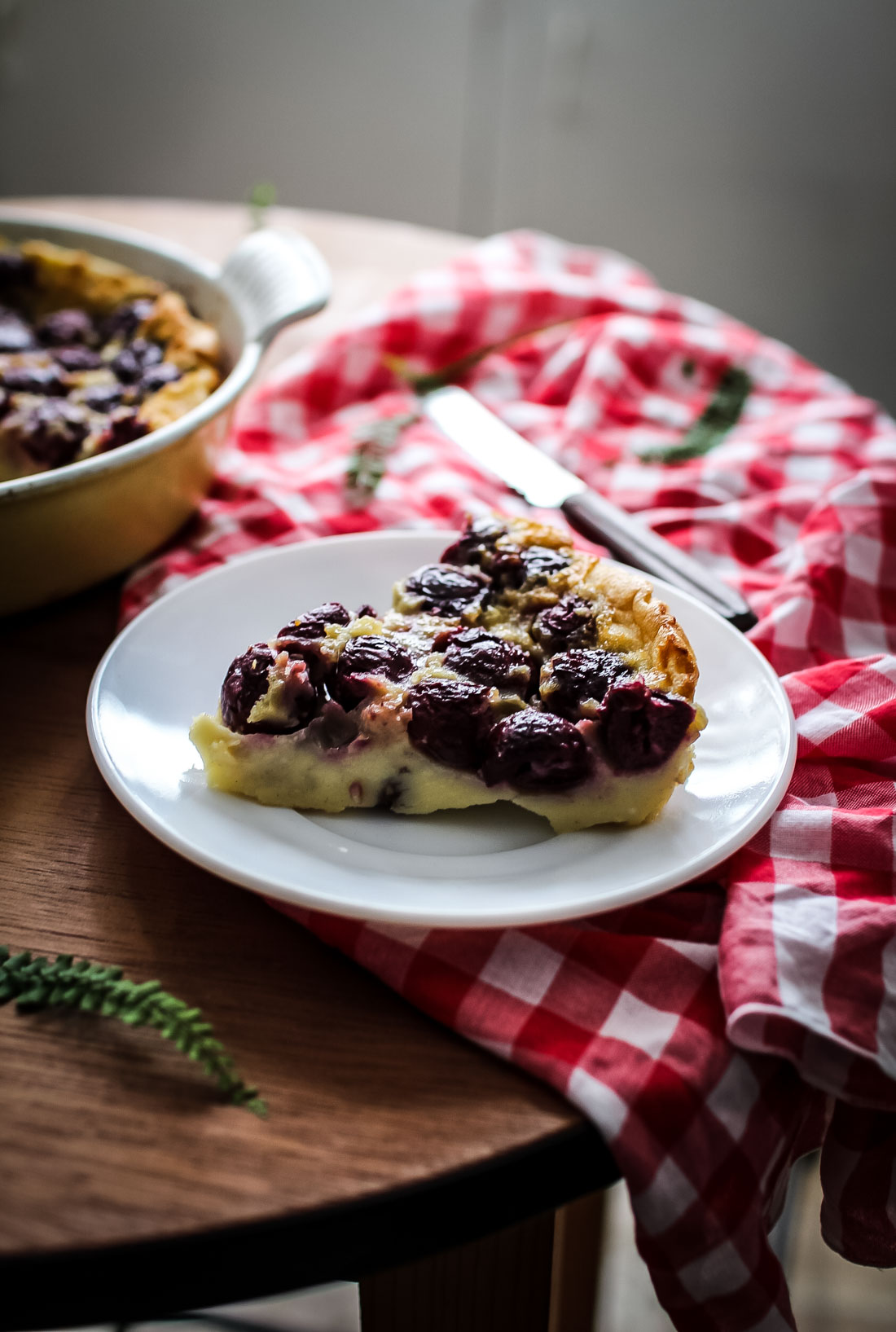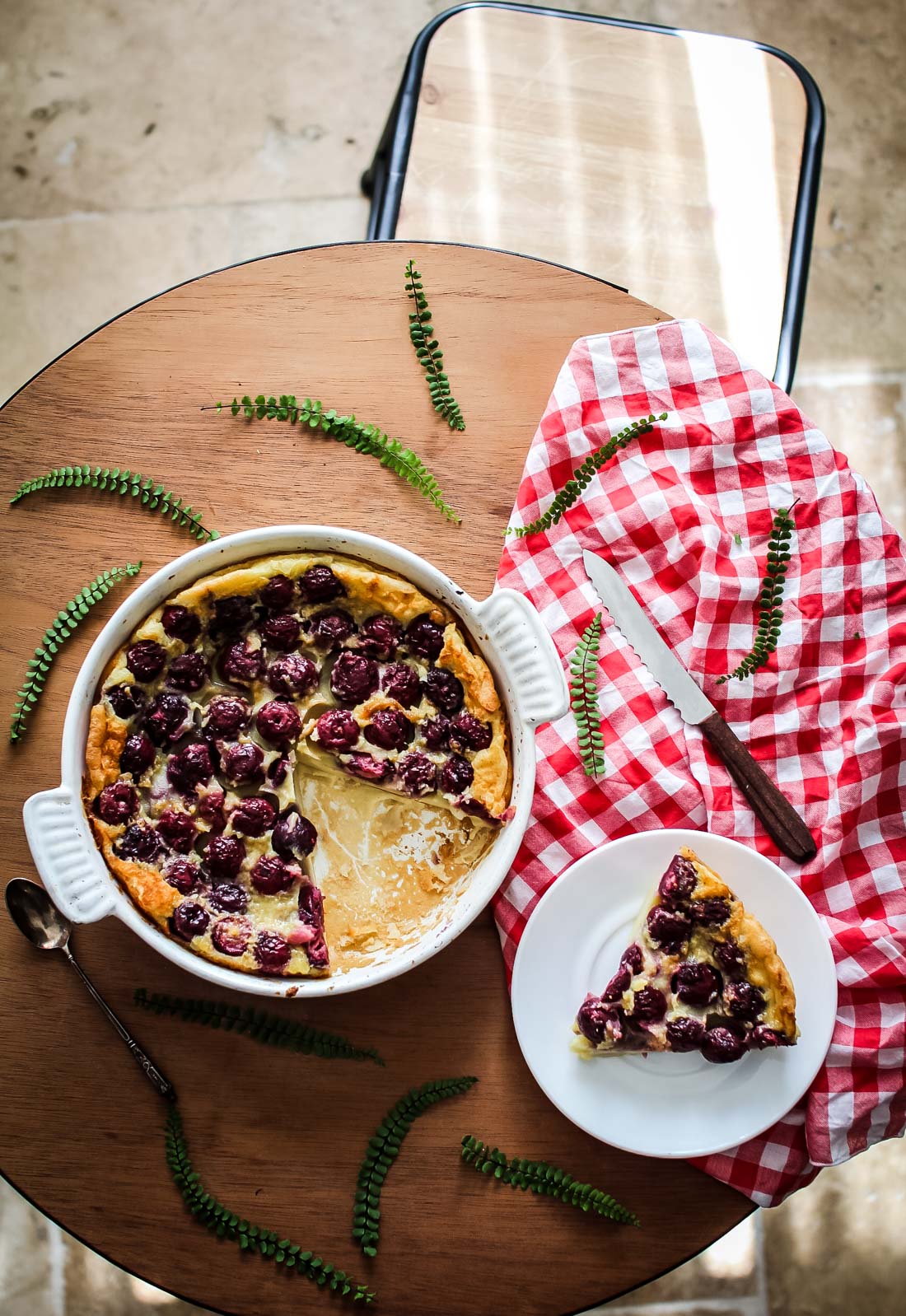 « Clafoutis ». Rien que la prononciation de ce mot me fait du bien à vrai dire ! En fait cela fait déjà quelques semaines (comme tous les étés d’ailleurs !) que je suis obsédée par les clafoutis, je suis donc en mode « test de clafoutis ». Je crois que j’ai bien dû essayer 5 ou 6 recettes pour arriver à trouver celle qui me rappelait mes goûters d’enfance. J’en avais déjà fait un délicieux aux abricots et à la lavande il y a quelque temps, mais cette année place au classique !
