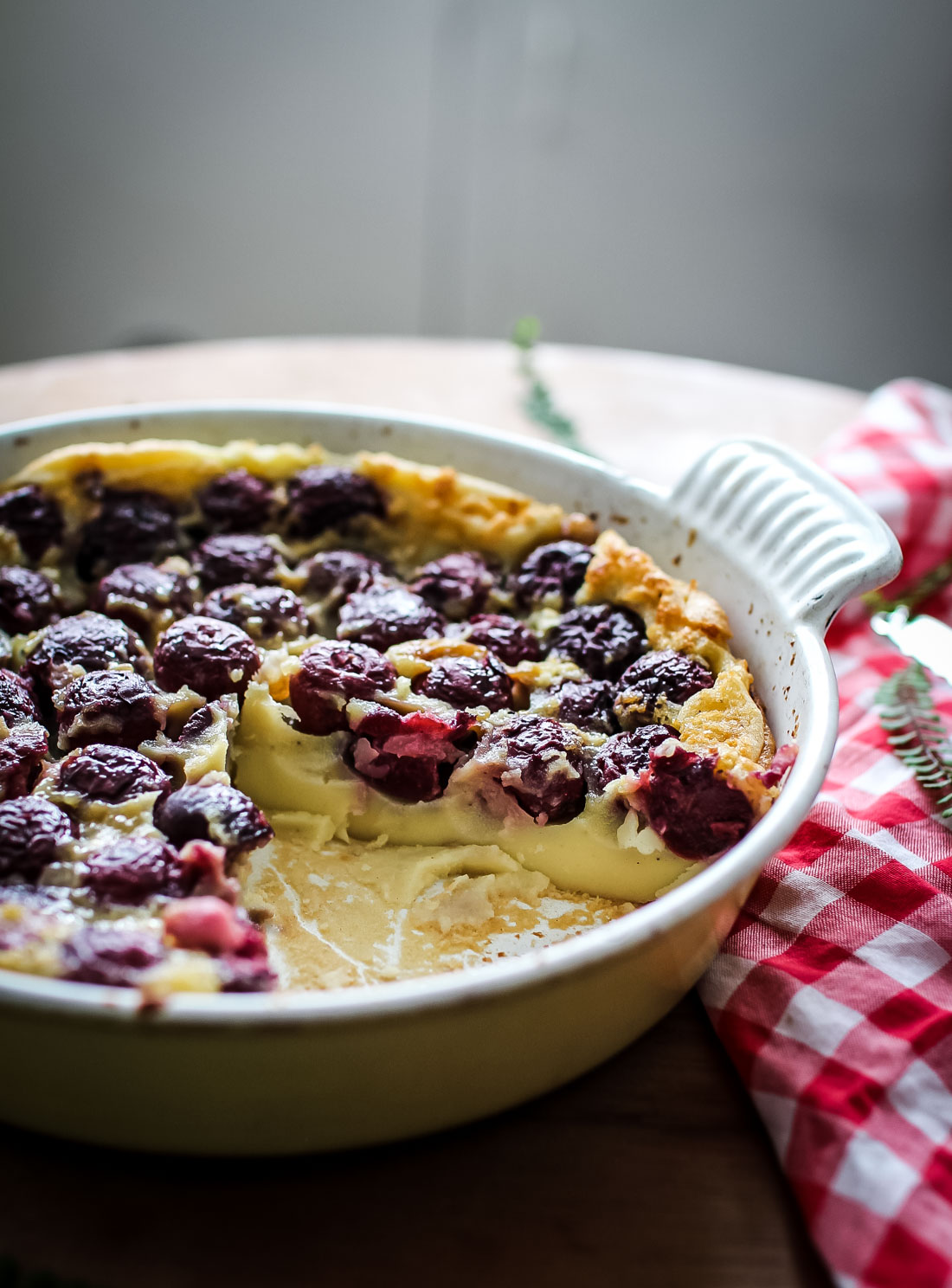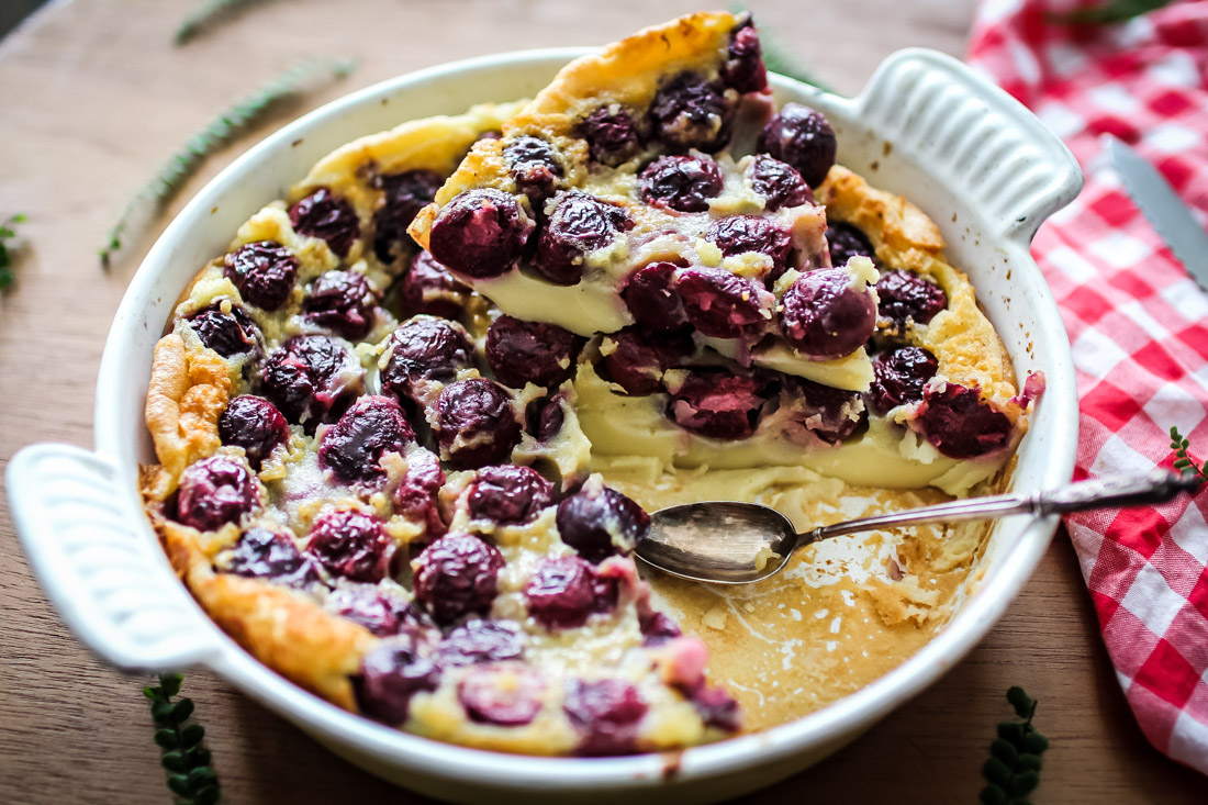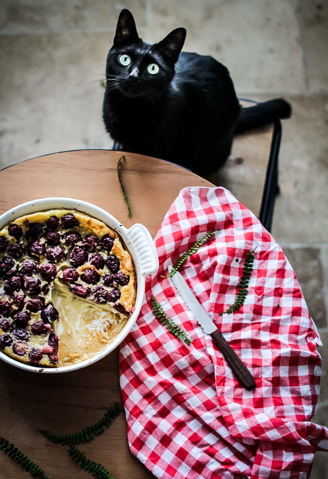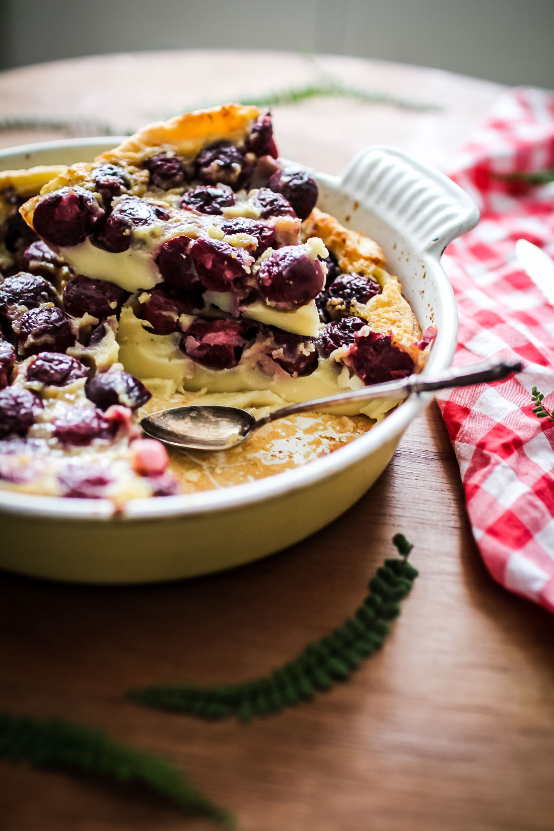 « Clafoutis ». Rien que la prononciation de ce mot me fait du bien à vrai dire ! En fait cela fait déjà quelques semaines (comme tous les étés d’ailleurs !) que je suis obsédée par les clafoutis, je suis donc en mode « test de clafoutis ». Je crois que j’ai bien dû essayer 5 ou 6 recettes pour arriver à trouver celle qui me rappelait mes goûters d’enfance. J’en avais déjà fait un délicieux aux abricots et à la lavande il y a quelque temps, mais cette année place au classique !