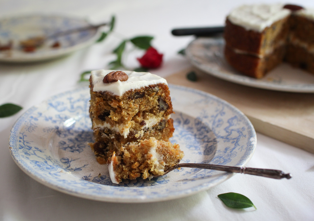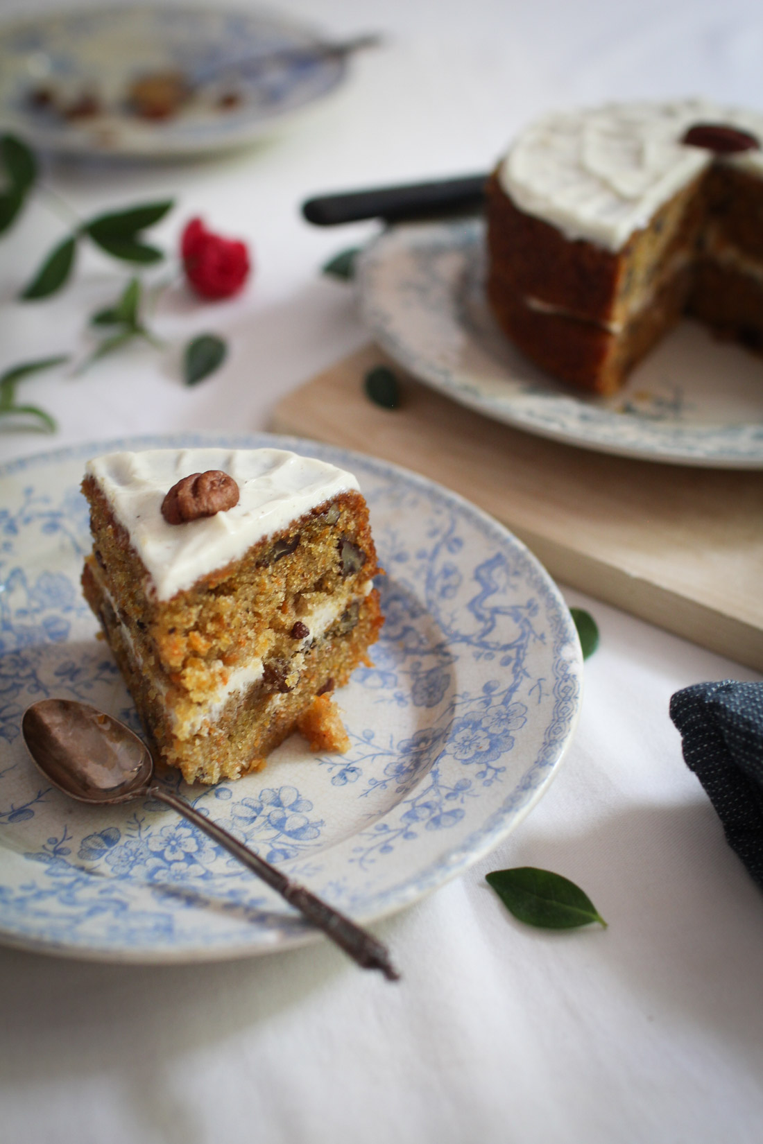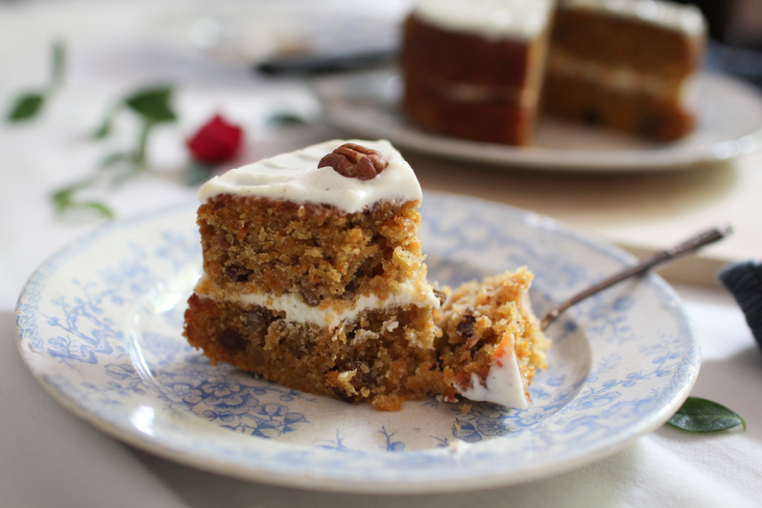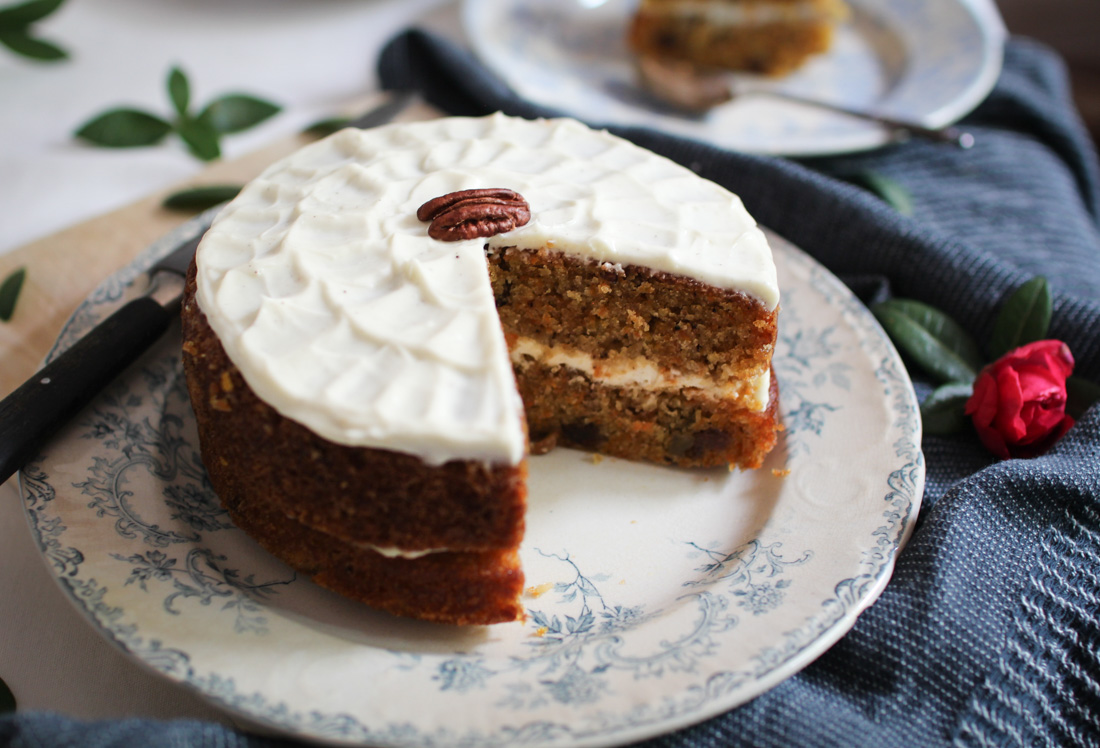 Ce qui le rend si moelleux c’est l’utilisation d’huile à la place du beurre et la grande quantité de carottes râpées qui lui apportent de l’hydratation sans trop le surcharger de graisses. On y met généralement des noix, des raisins secs et on le recouvre d’un glaçage au cream cheese.