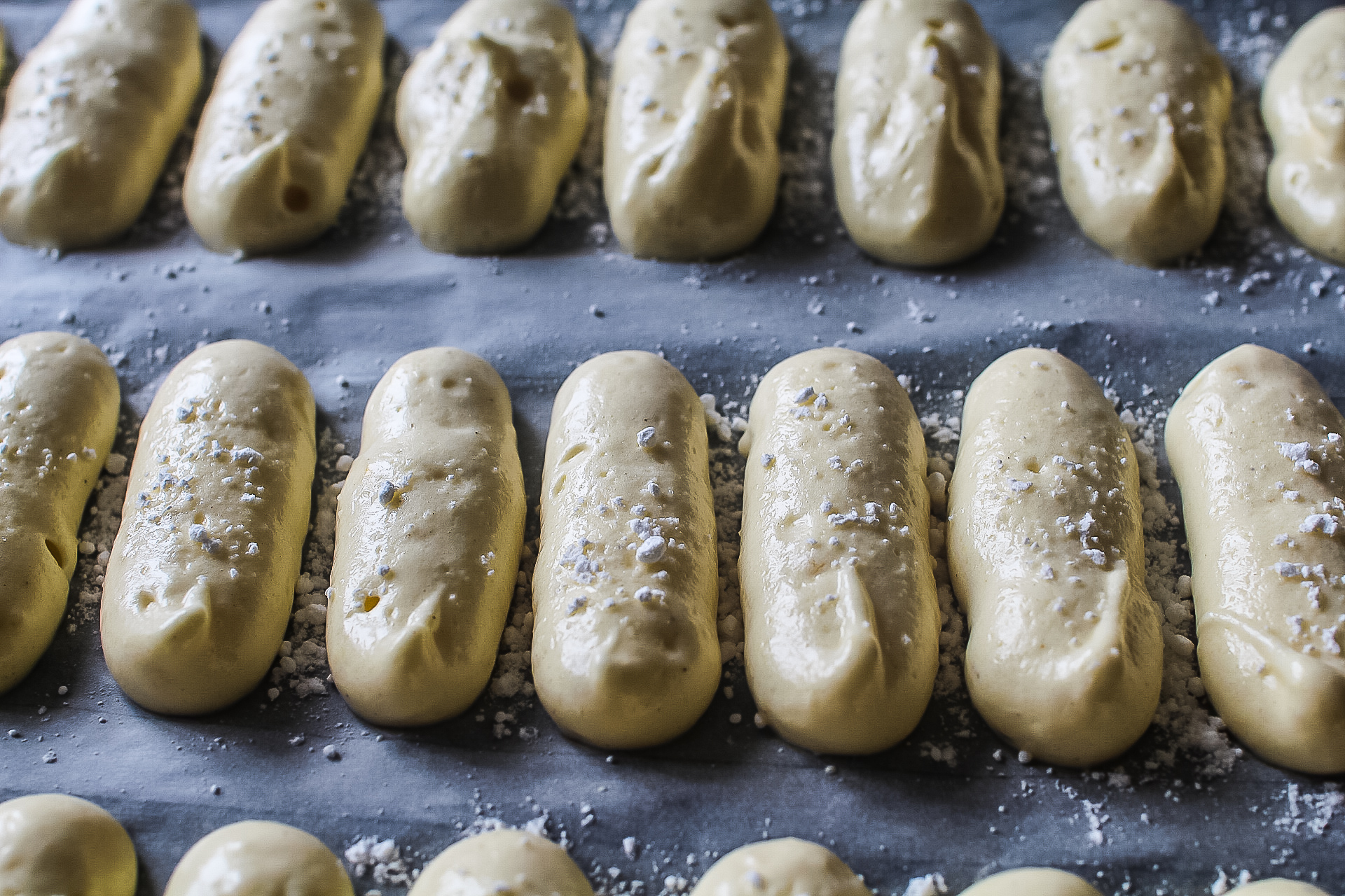 Je vous conseille de tracer des lignes de délimitation sur votre papier cuisson pour aligner parfaitement les biscuits. Pour ma part j’ai tracé deux lignes parallèles horizontales, au cayon à papier, avec un espacement de 7 cm entre chacune pour avoir des biscuits de 7 cm de longueur. Ensuite, j’ai simplement poché la pâte sur mon papier cuisson en suivant les lignes. Cette astuce est vraiment très pratique pour obtenir un joli alignement !