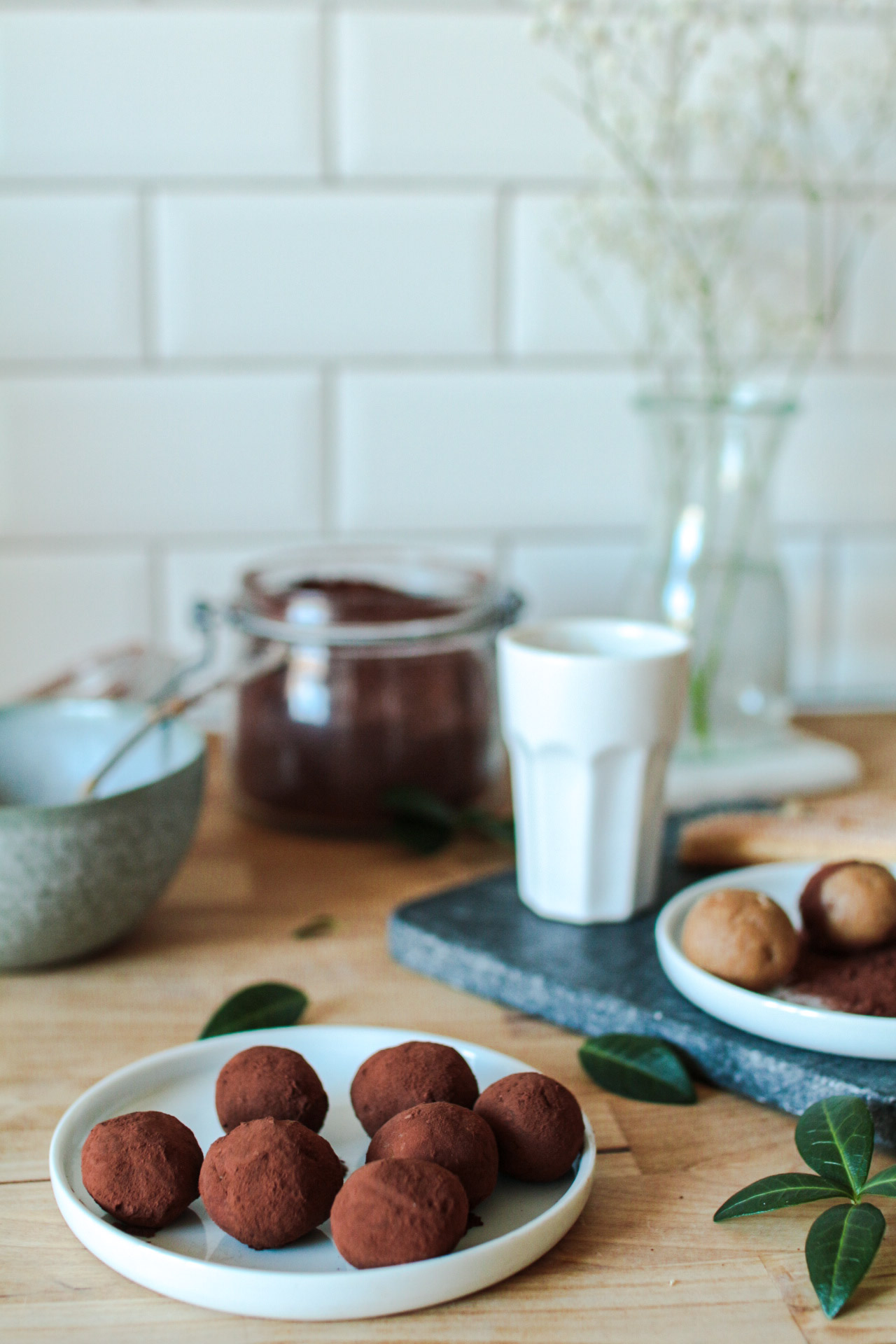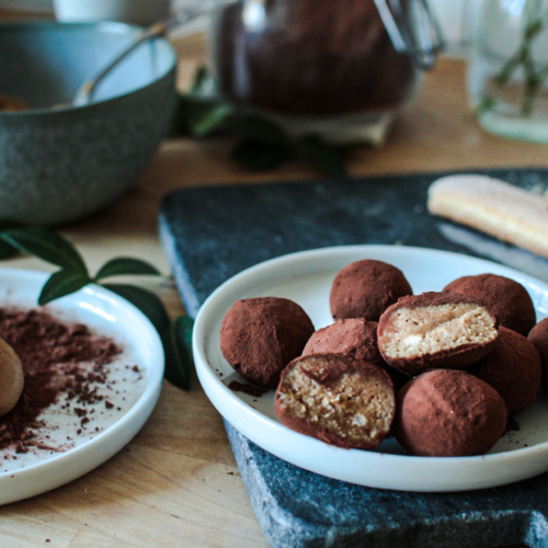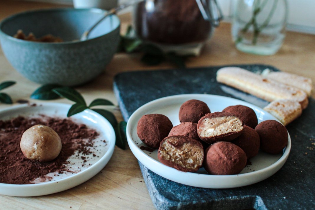 Il s’agit ni plus ni moins que de bouchées faites à base de biscuits écrasés, de mascarpone et de café. On obtient alors une pâte plus ou moins compacte avec laquelle on va former de petites boules que l’on va rouler dans du cacao en poudre non sucré !