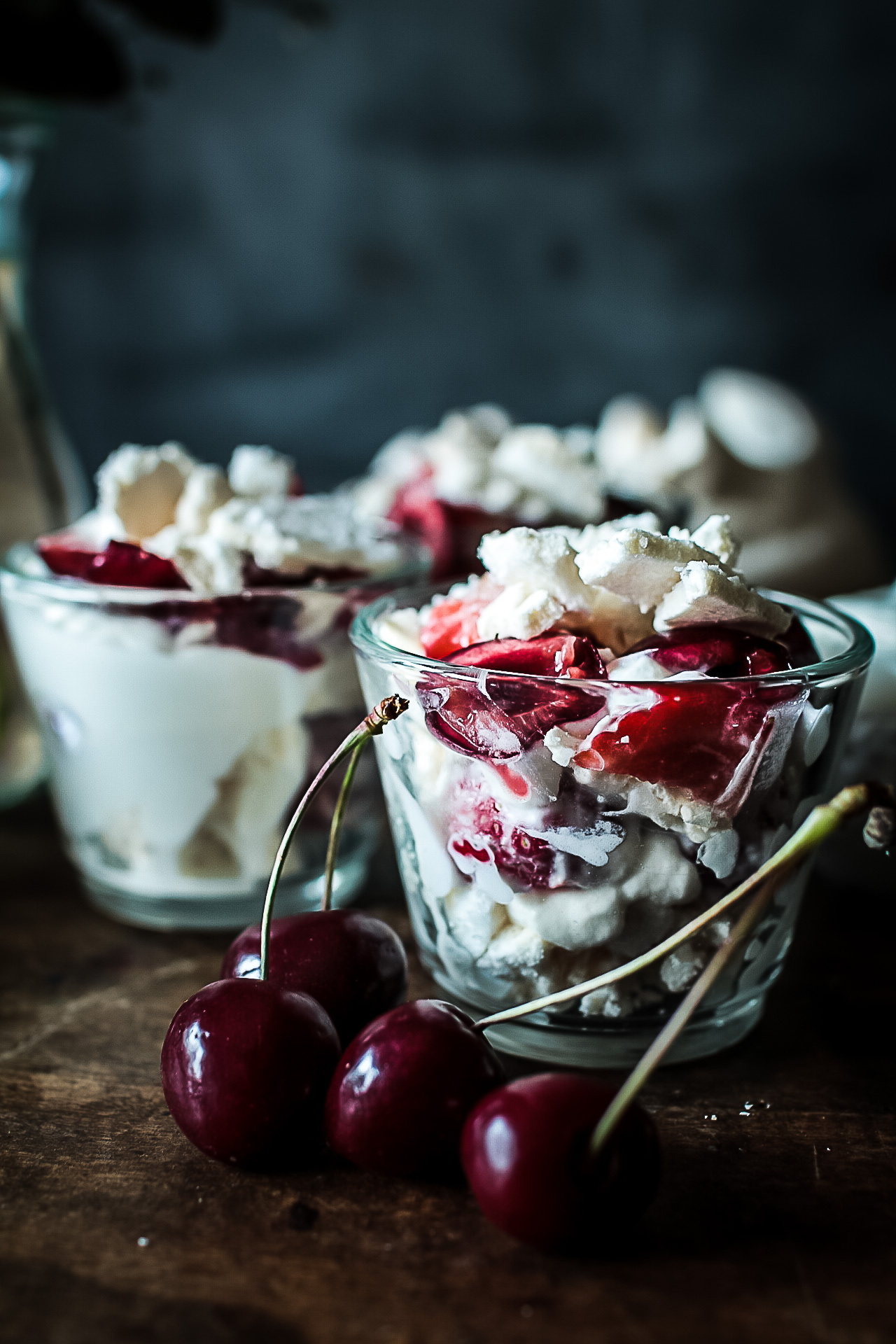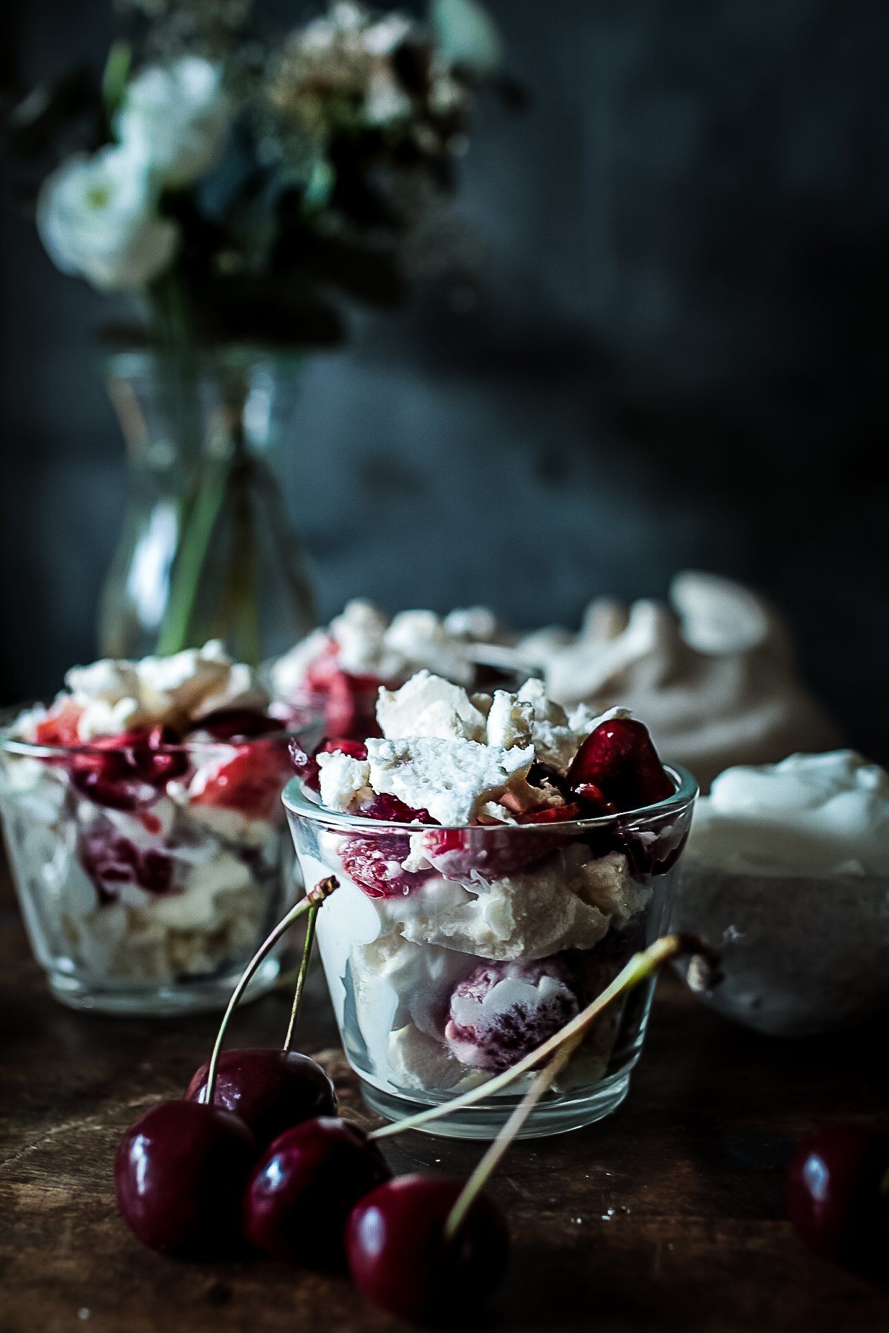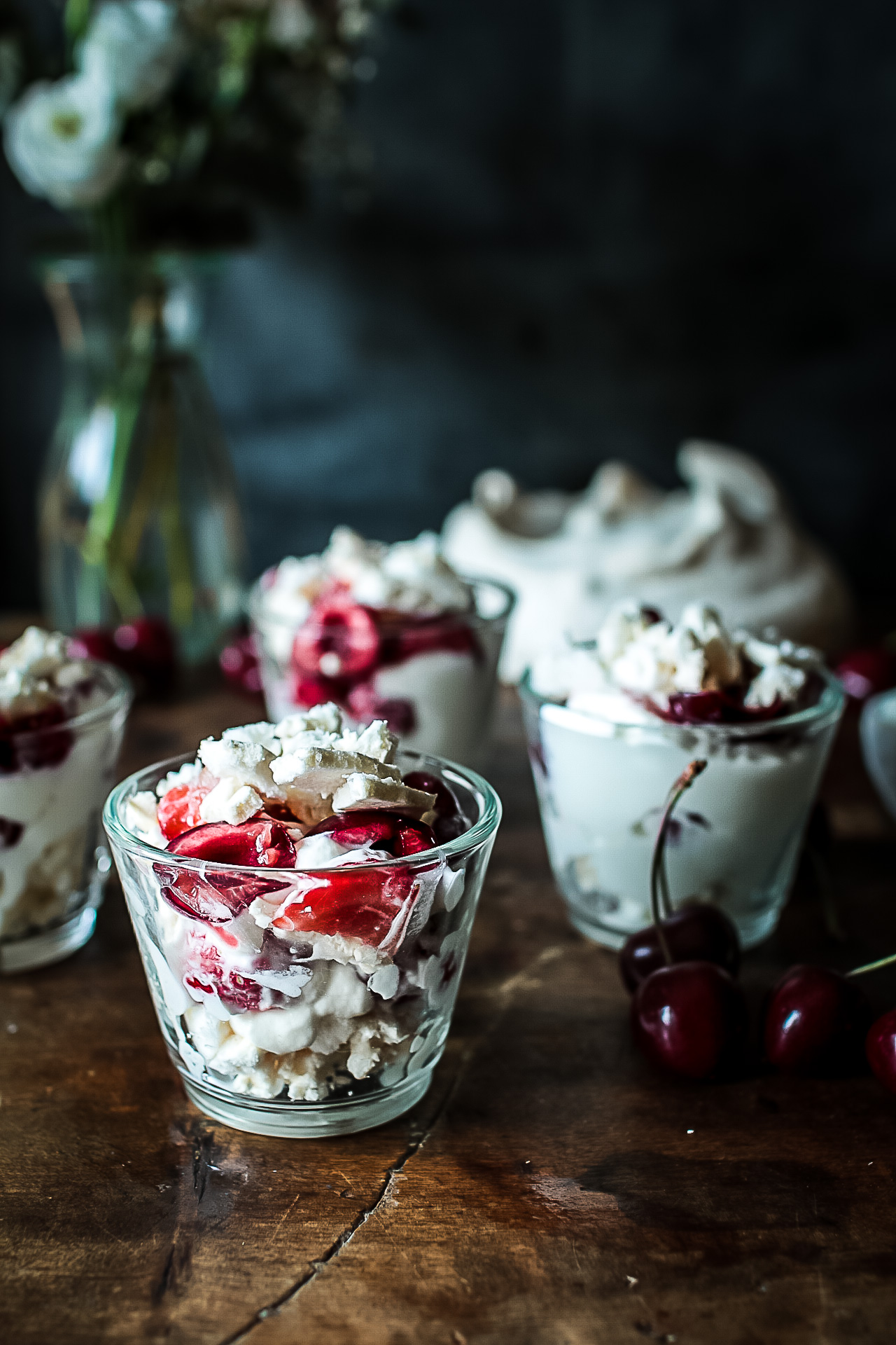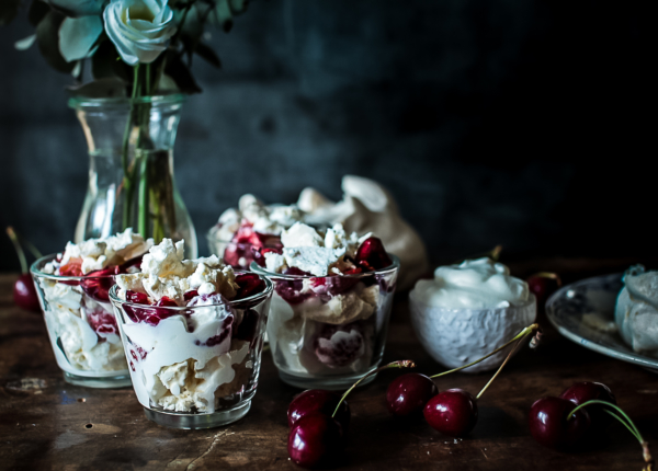 - Dans chaque verrine, disposez en alternant les couches : des brisures de meringue, de la crème chantilly et les fruits rouges de votre choix. Formez ainsi au moins 3 couches puis finissez en décorant de quelques cerises.