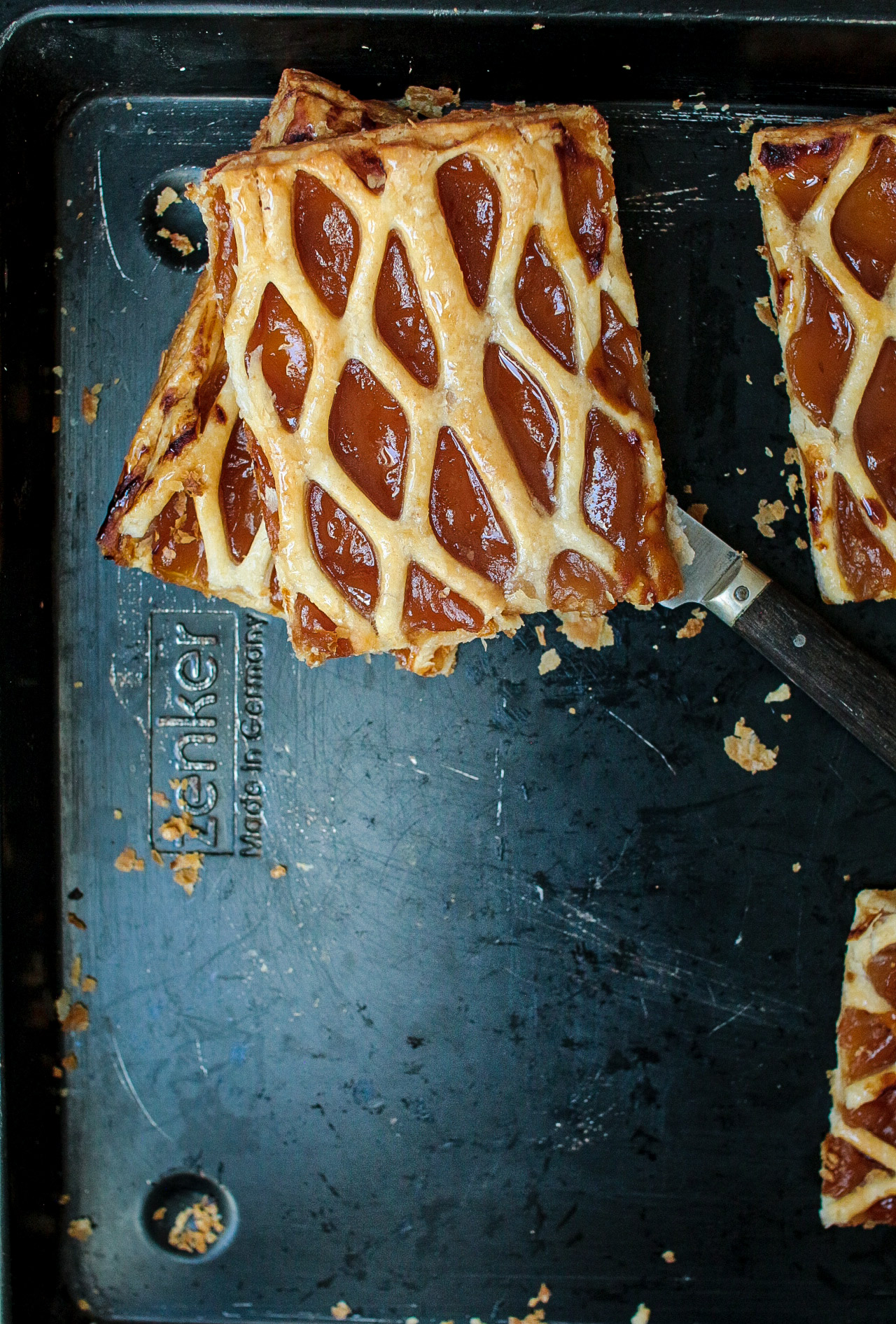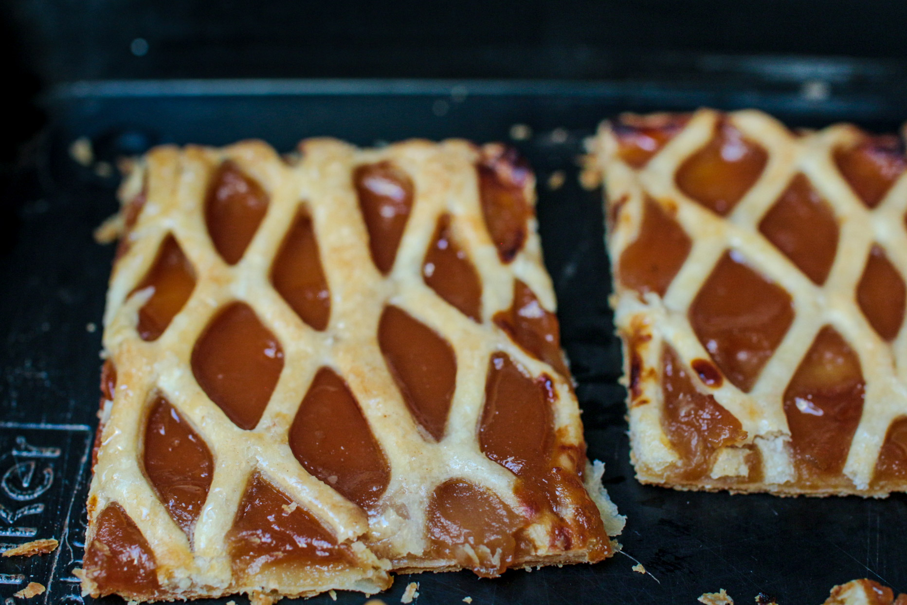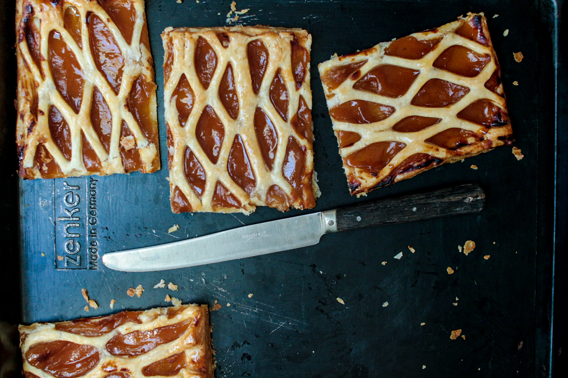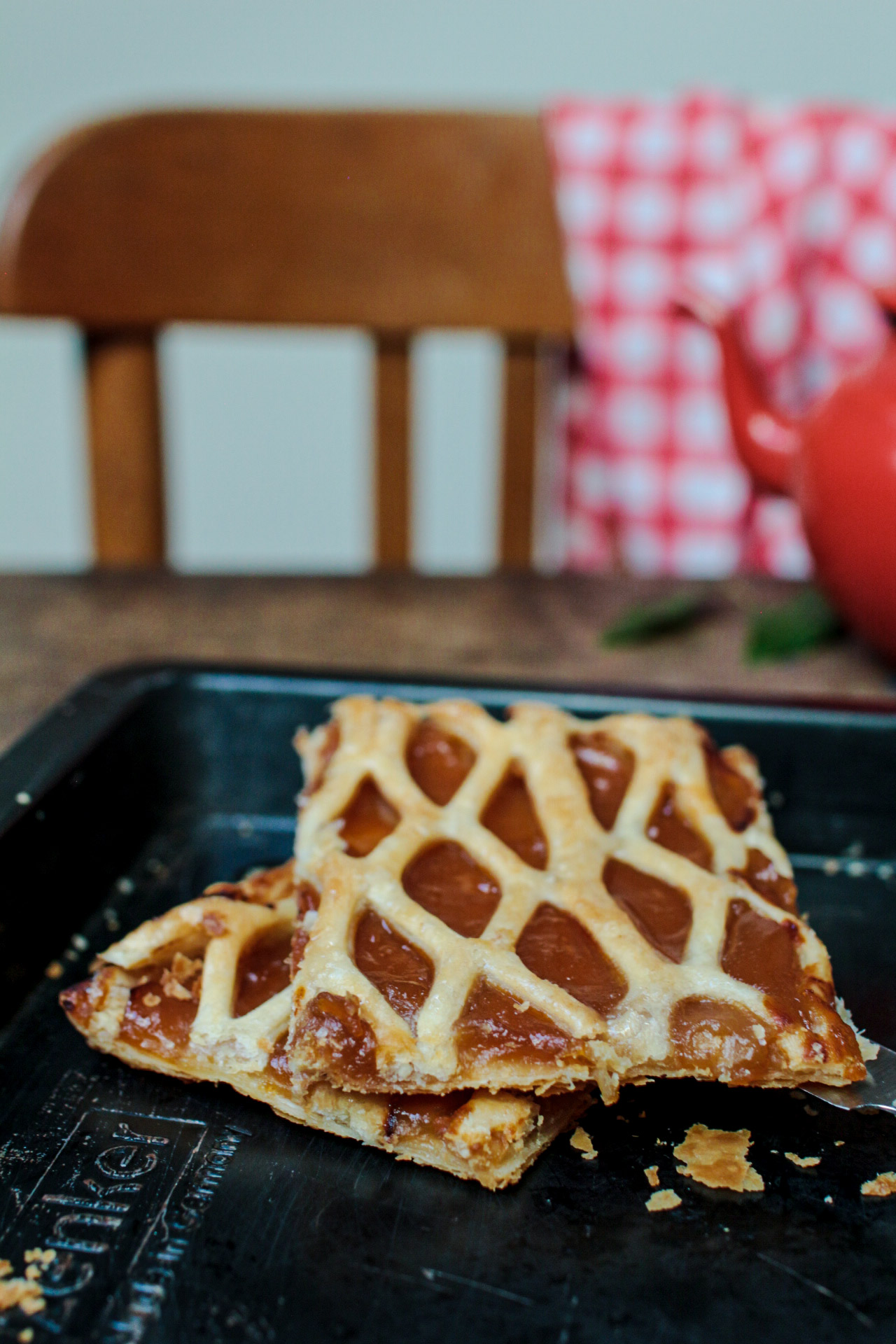 - Découpez votre deuxième rectangle au rouleau à losanges et venez le poser délicatement sur la compote en l’écartant