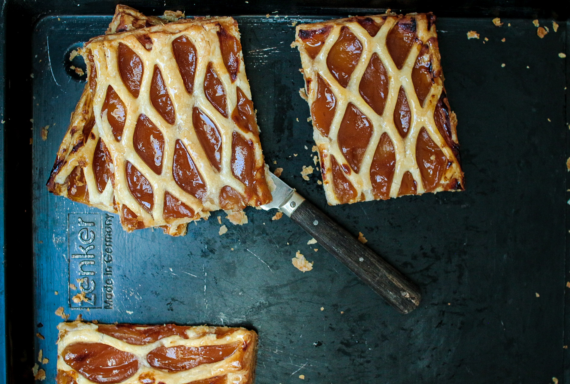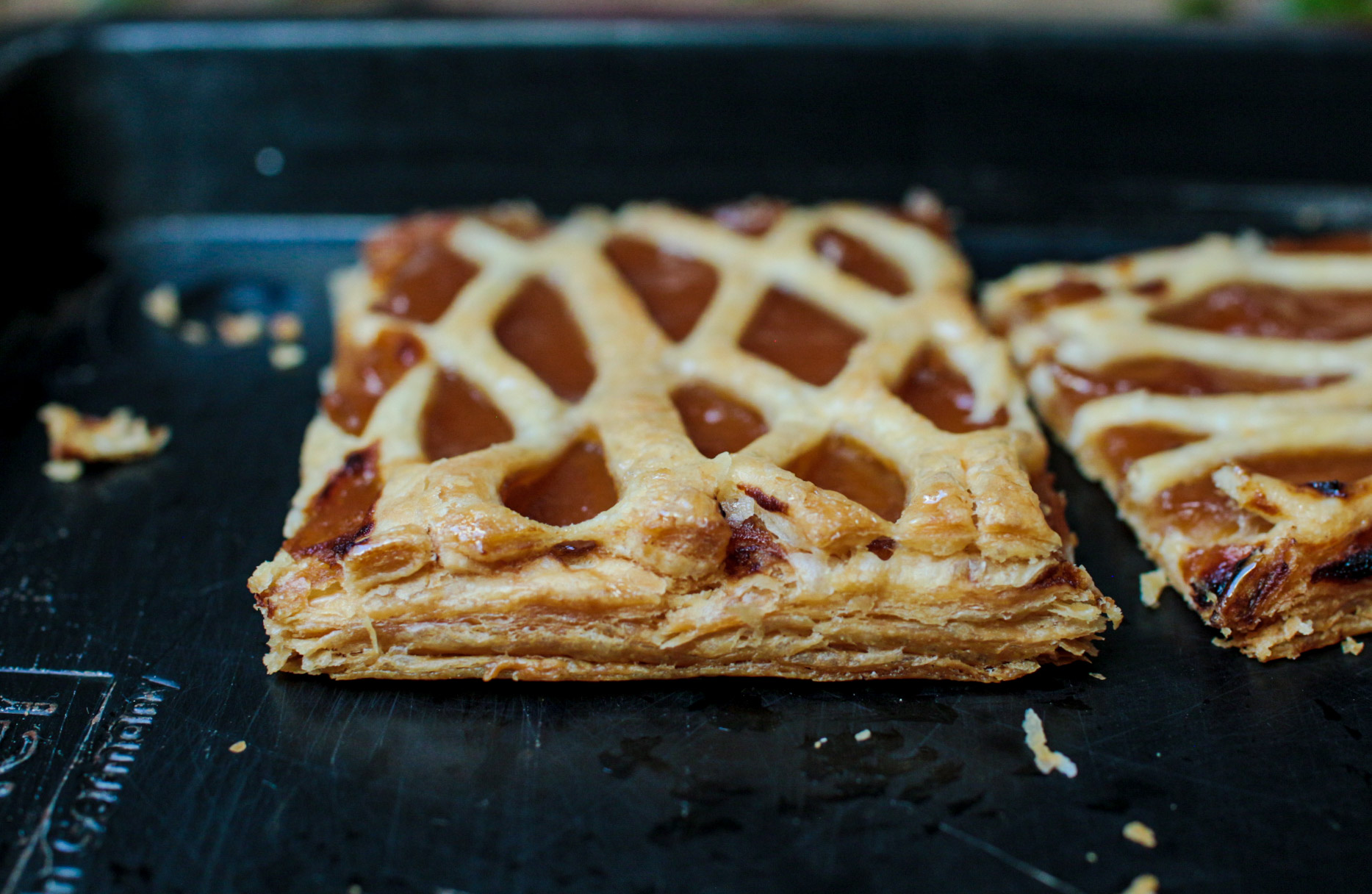 Il s’agit d’une « viennoiserie » à base de pâte feuilletée et de pommes, cela ressemble un peu à un chausson aux pommes en fait, mais avec un décor bien caractéristique puisque le dessus de la pâte est faite de croisillons. La différence avec un chausson aux pommes est que la pâte n’est pas une pâte à croissant, mais juste une pâte feuilletée.