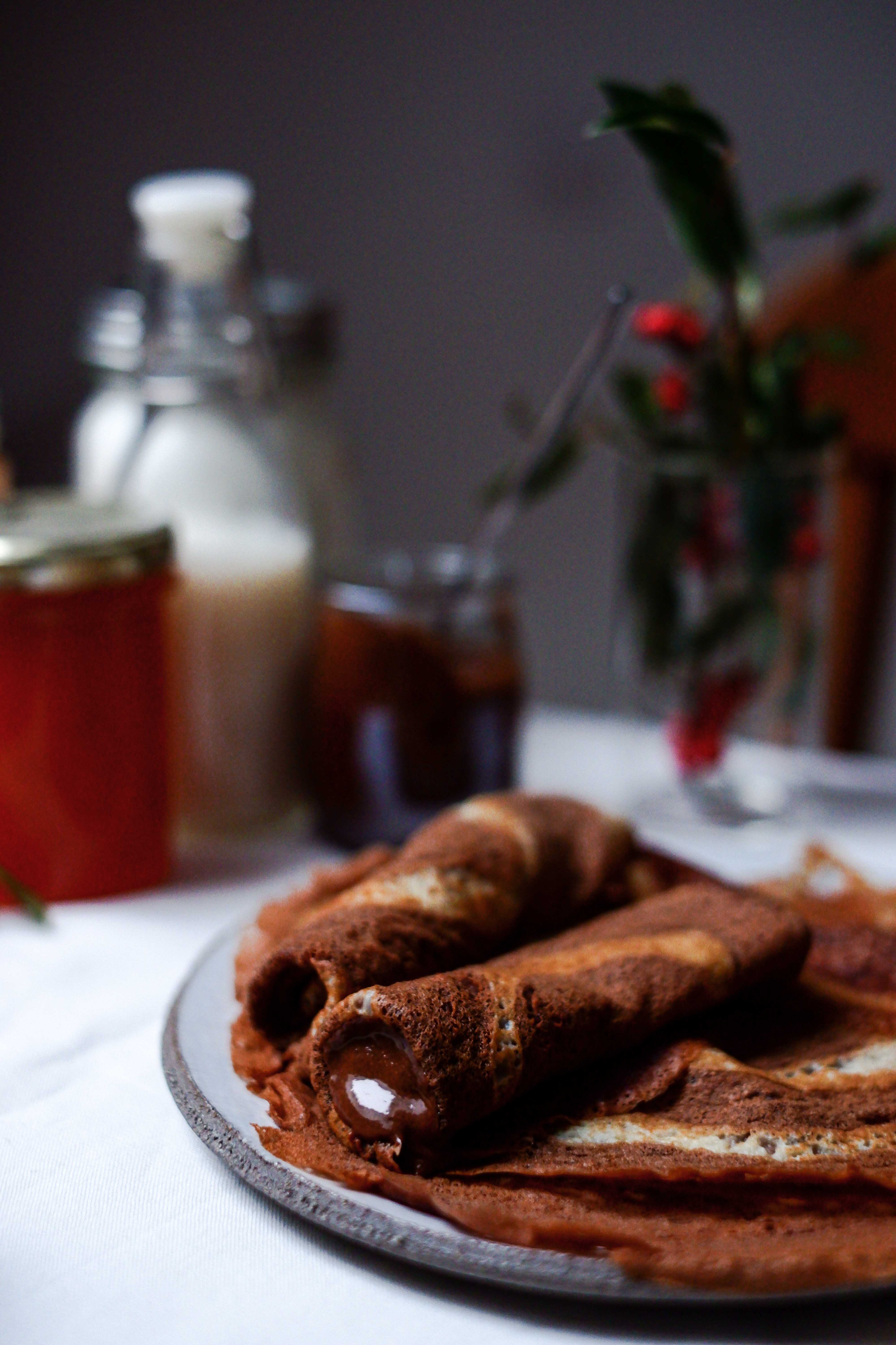 Voilà, on y est, la Chandeleur est enfin là ! Ce week-end, on va donc faire sauter les crêpes ! Aujourd’hui je vous dévoile ma recette de crêpes sans lait et vous allez voir, vous n’y verrez que du feu. Parce que oui, il est tout à fait possible de faire des crêpes sans lait, à ma grande surprise. J’avoue ne m’être jamais posé la question d’omettre le lait dans une recette de crêpes, mais je trouve que c’est une très bonne alternative quelle que soit votre raison. Elles restent moelleuses et très bonnes. J’ai donc sorti mes meilleures pâtes à tartiner et confitures maison pour les accompagner. J’ai choisi de faire des crêpes « tourbillon » ou « bicolores » pour cette recette pour un côté plus ludique mais c’est totalement optionnel !